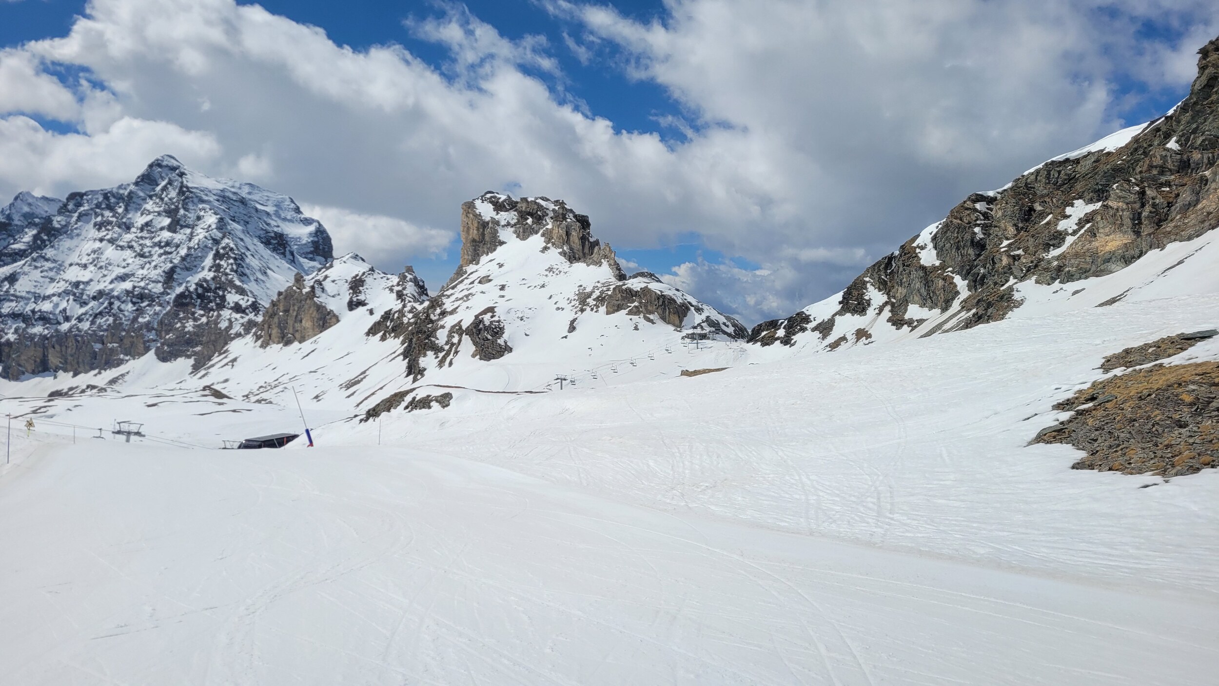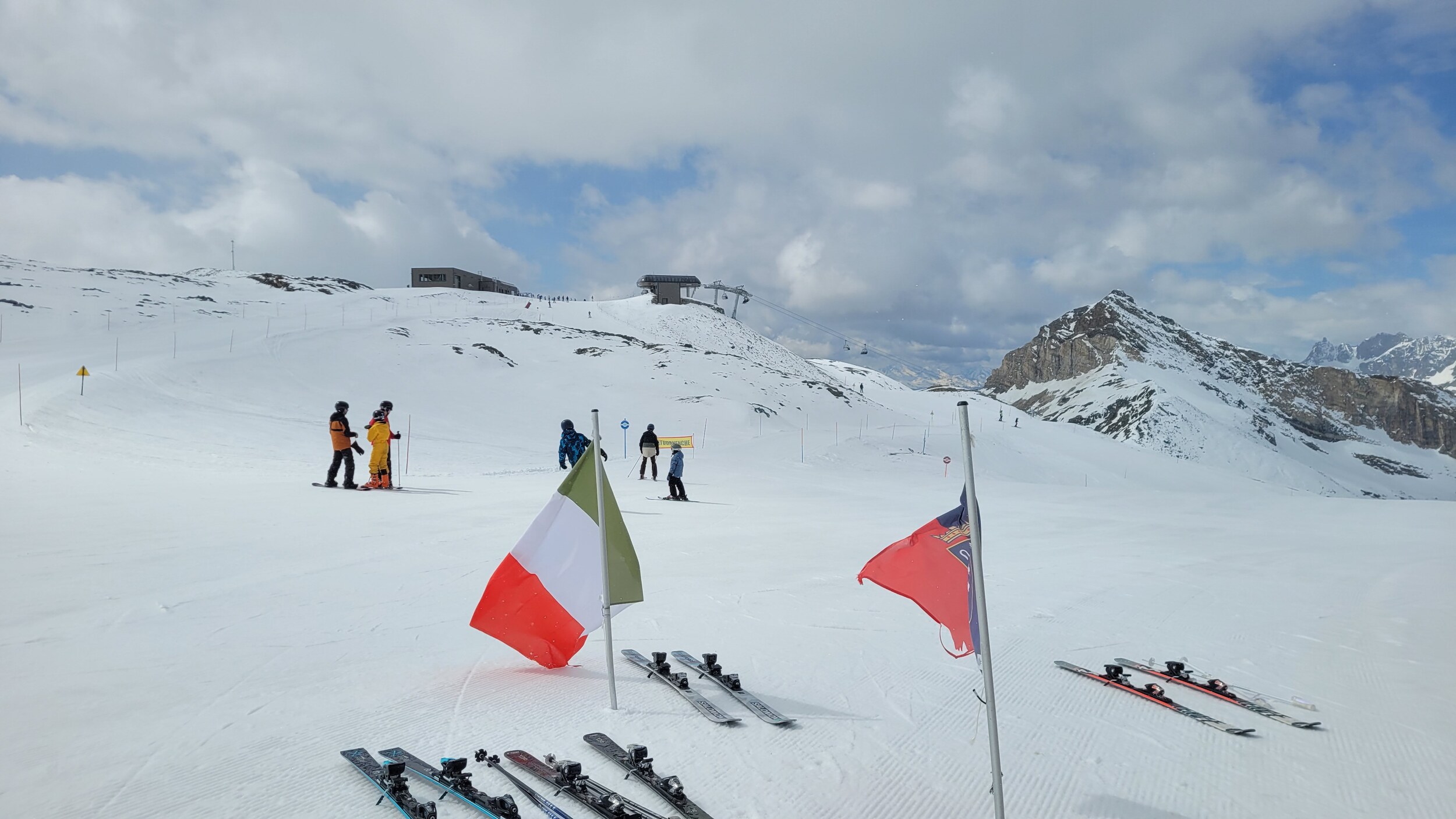 Start wiederum am Furggsattel mit einigen Fahrten im harten Pulverschnee. Top Carvingbedingungen und heute Vormittag einiges mehr Leute als gestern zur selben Zeit. 80% spricht italienisch, der Rest sind Skischul- und Demoteam-Gruppen welche den gleichmässigen Hang zum Testfahren nutzen. Gleichzeitig landet ein (schwarzes) Gletscherflugzeug auf der grossen Gletscherfläche neben der Furggsattel-Sesselbahn in Richtung Gletschersee. Den Start haben wir leider nicht mehr gesehen. Wir nehmen uns heute vor, die Bontadini-Pancheron-Seite in Cervinia zu befahren, und anschliessend zurück in der CH eine Runde am Hirli zu drehen um den Tag dann am Hohtälli zu beenden. Ventina wiederum eher knollig und nicht top zu fahren. Dafür dann die Talabfahrt nach Cervinia ab Goillet-Talstation gegen 12 Uhr ein toller Sulztraum und angenehm leer. Wechsel via Plan Maison zur Fornet-Bontadini Liftkette. Lunch nehmen wir in der Hütte beim Bontadini-Sessel ein. Italo-Style, ein feines Tiramisu rundet den kurzen Lunch-Stopp ab. Gegen 13.30 Uhr weicht auch der obere Teil am Bontadini entsprechend auf und lockt für einige Wiederholungsfahrten. Anschliessend Wechsel zurück in die Schweiz via Schwarzsee an den Hirli-Sessel.