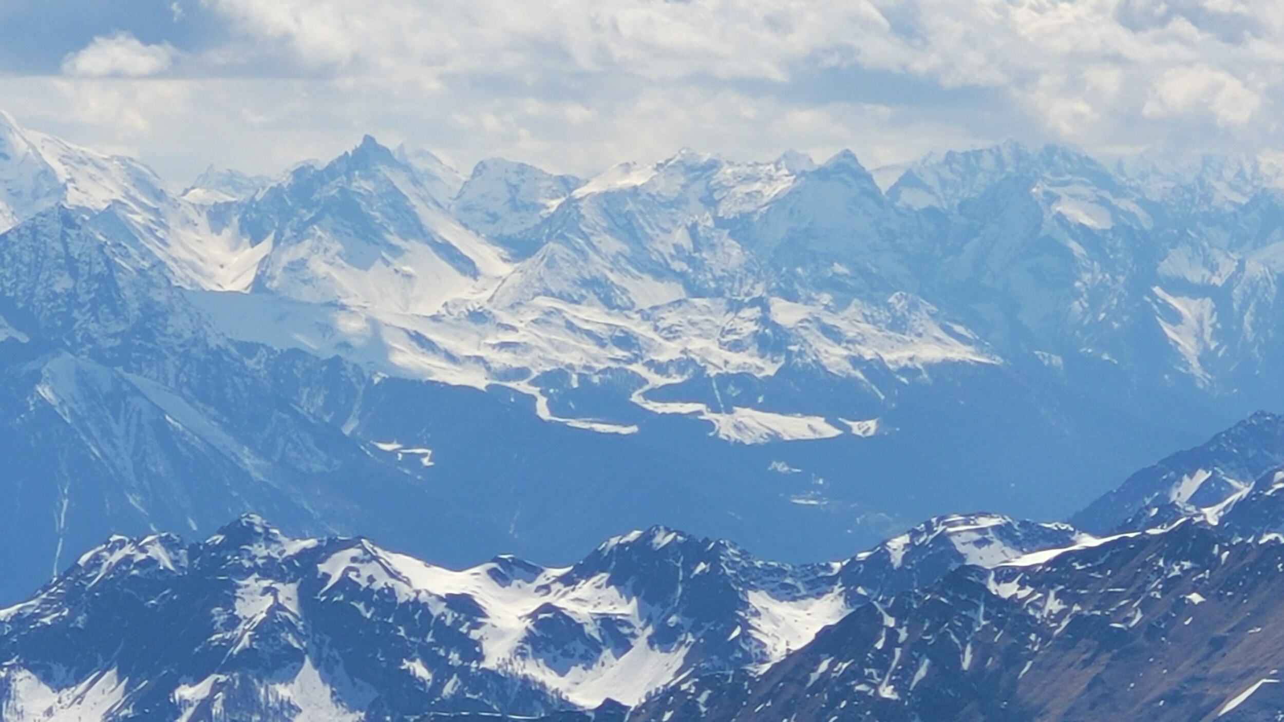 Ähnlich Wind wie gestern, der Mt Blanc trägt eine Lenticularis-Kapuze. Am Leissé wird es zuerst sonnig. Wegen Akkumangel geht's erst am Nachmittag weiter. Piste 3+4 schon mal top.