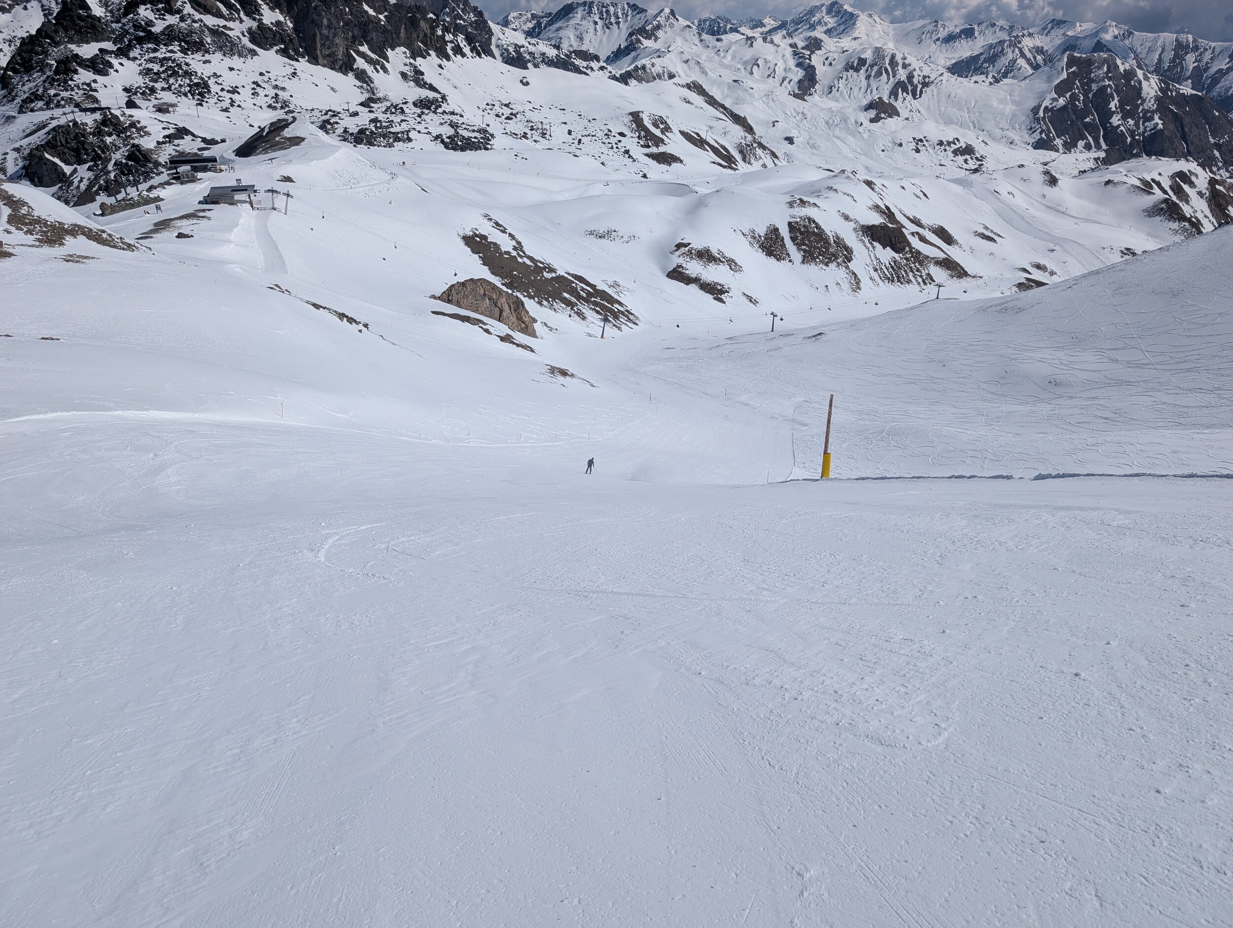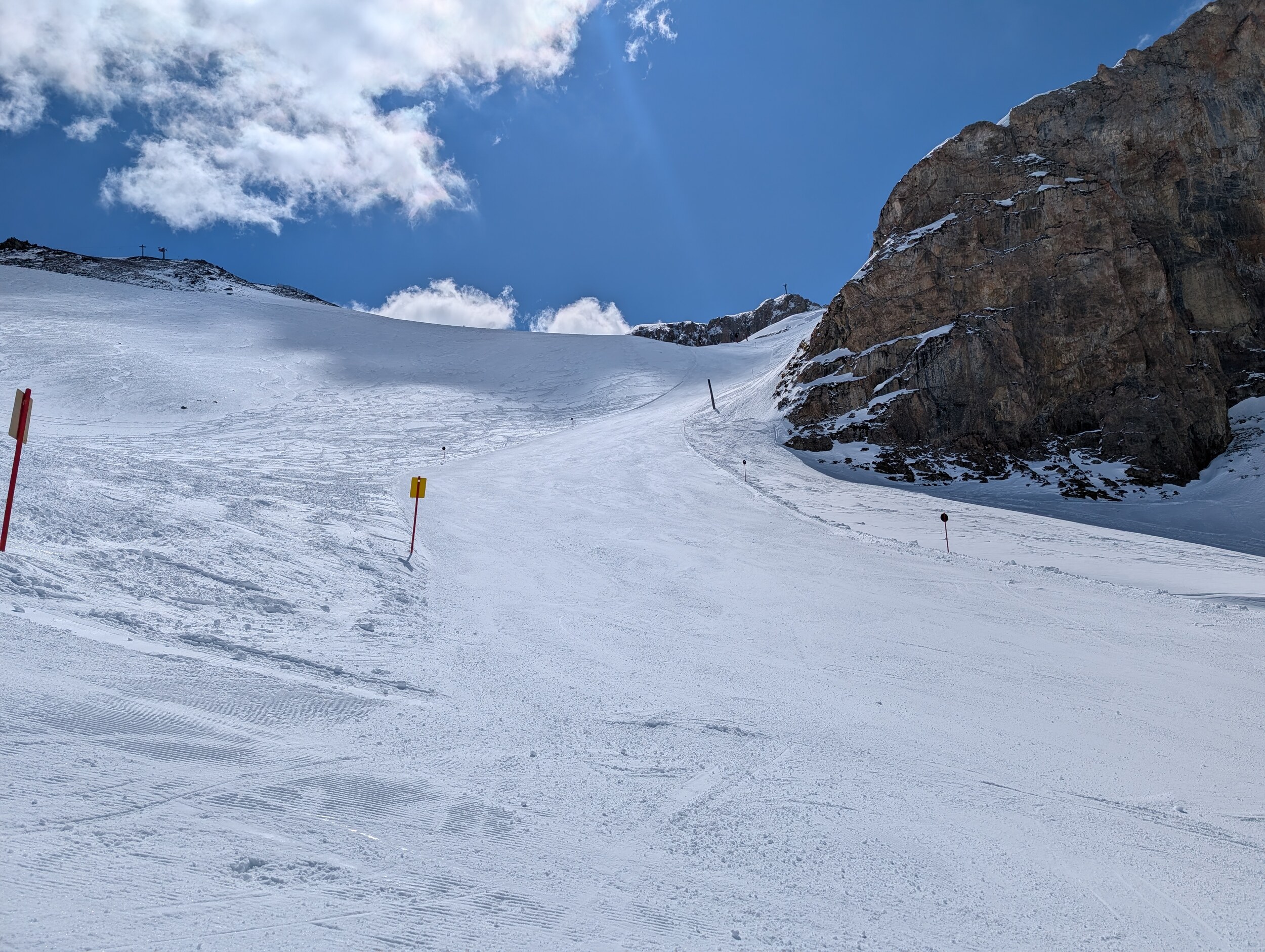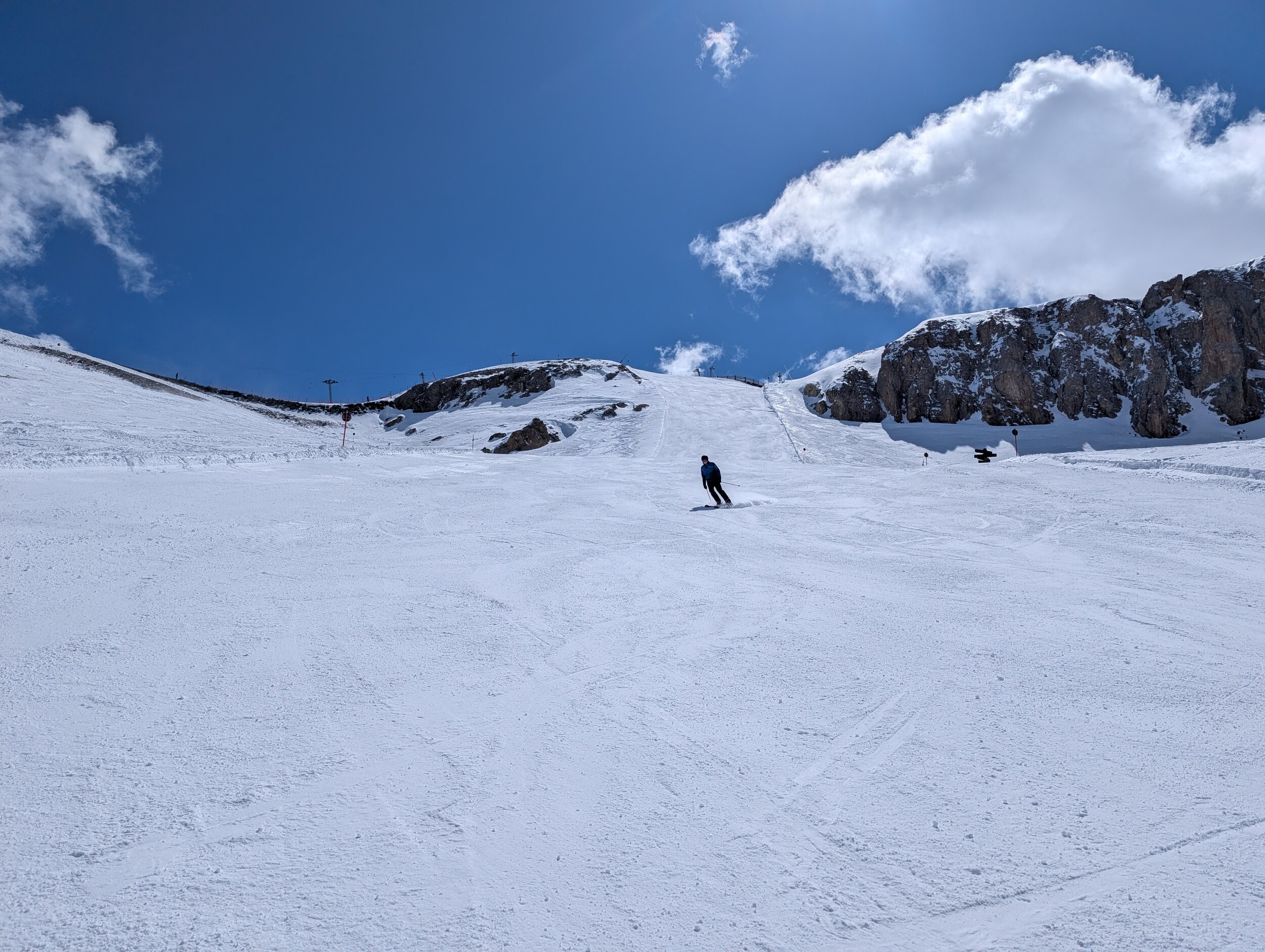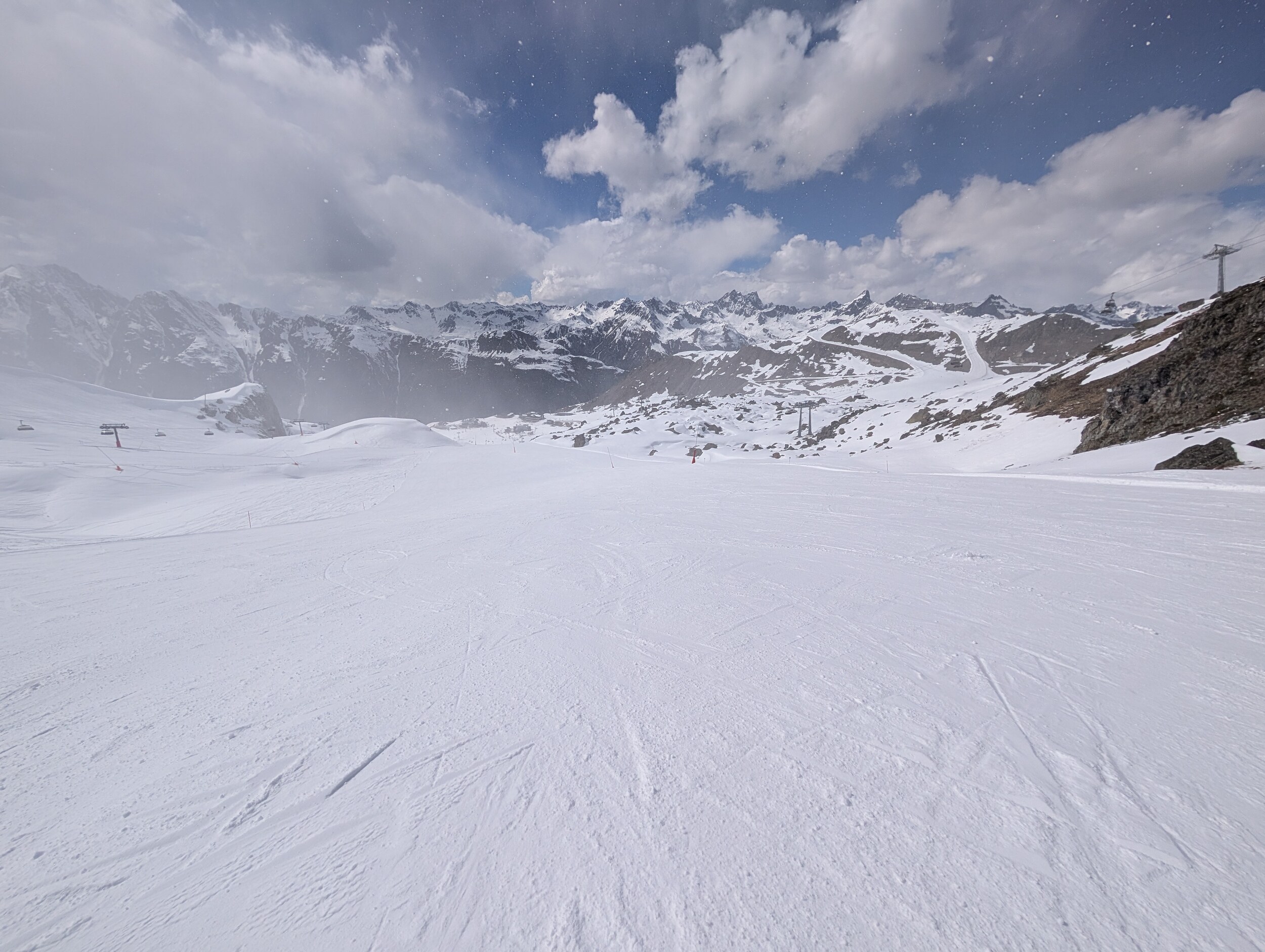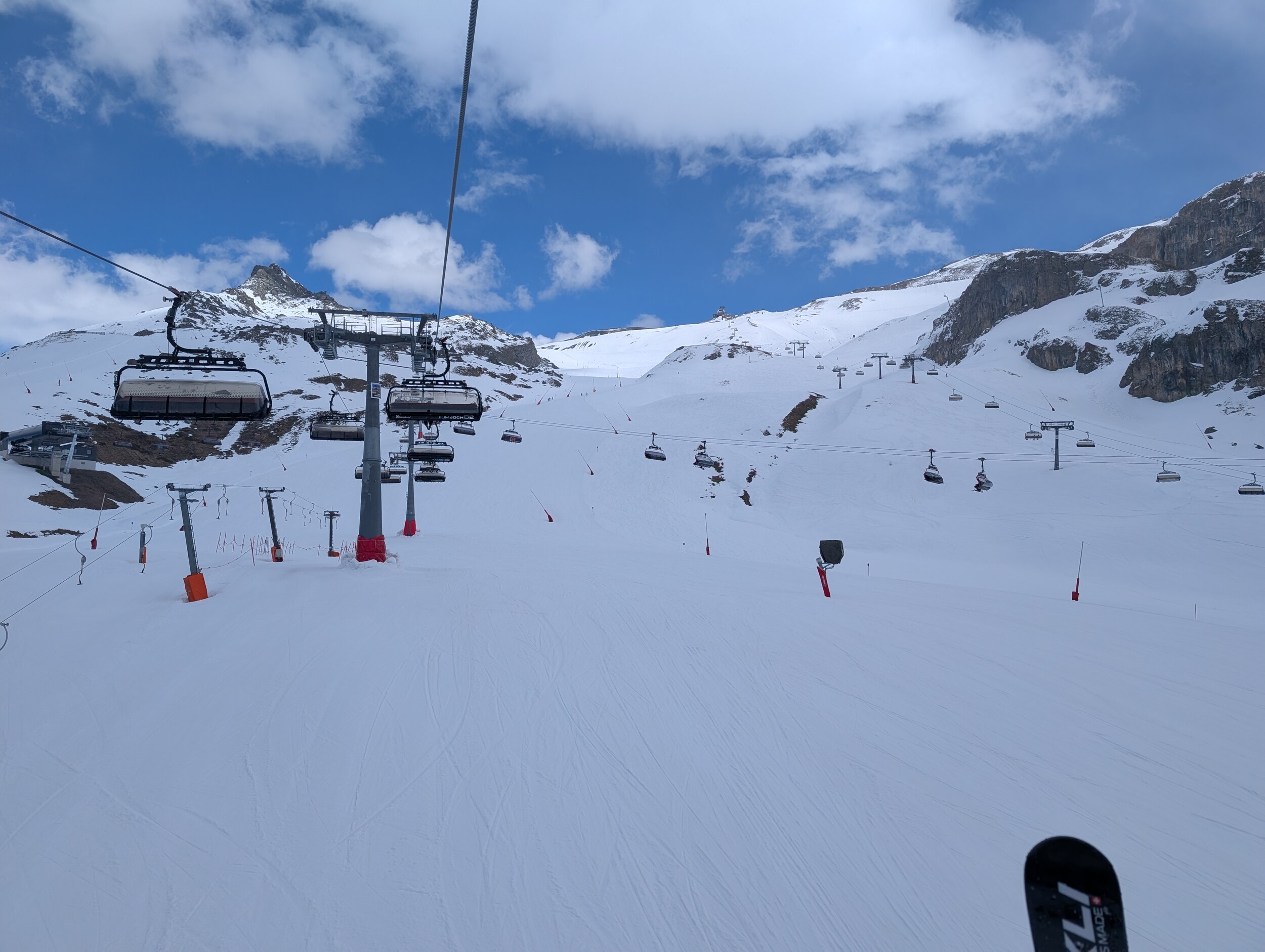 Die 40 Gampen runter im oberen Bereich ist richtig gut "carvbar". Im unteren Bereich an Lift Val Gronda wird es weicher aber wie immer am Rand noch gut fahrbar und man findet für die Uhrzeit auch noch die Bully-Rillen... Hat halt noch weniger Lüt als gestern. Temperaturen oberhalb 2300 / 2400 m noch unter 0 Grad und ab und zu Schattenwurf von einer Wolke hilft halt auch sehr. Leider hat die Bodenalp zu...