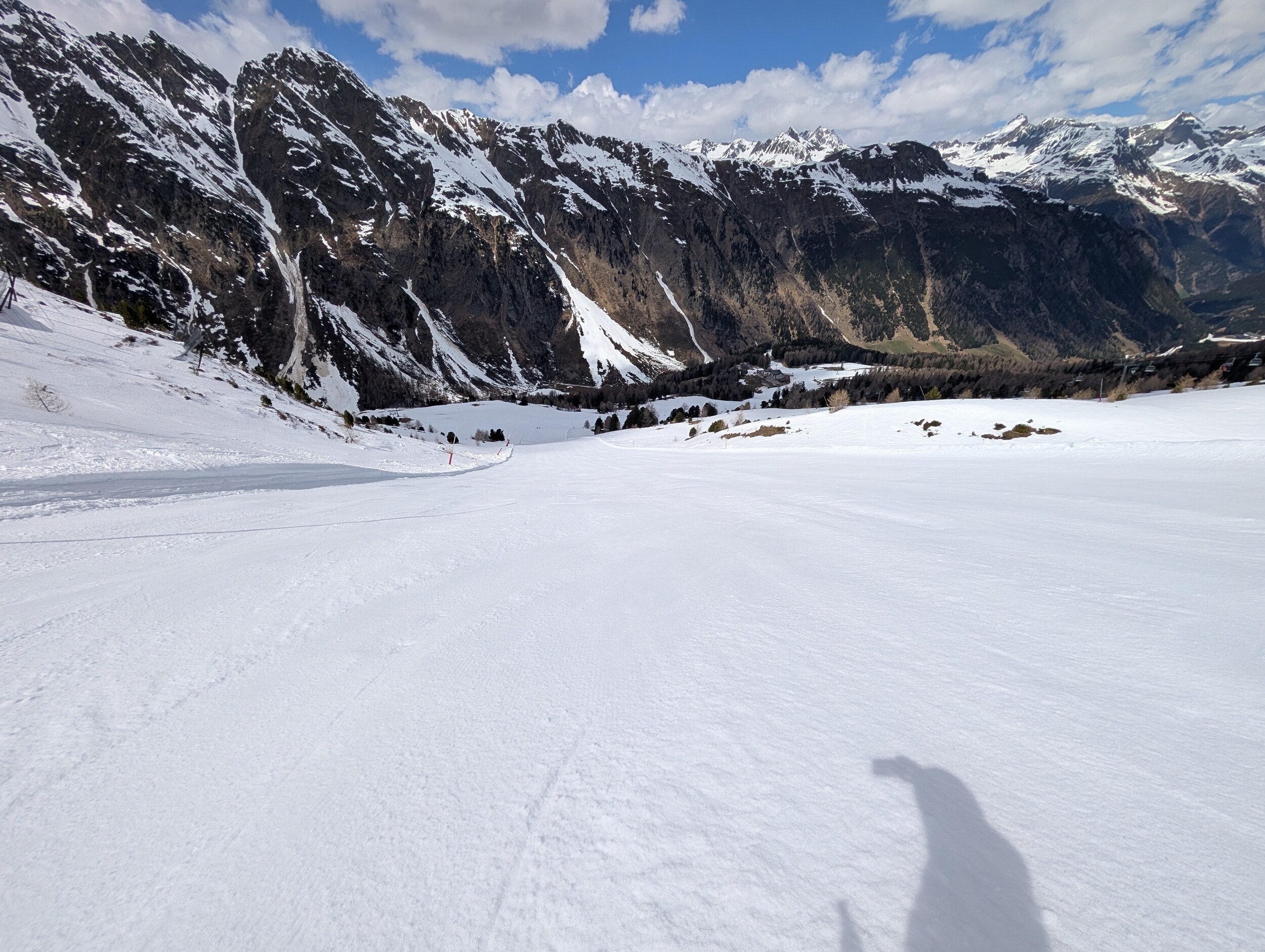 Nach einer wirklich kurz gehaltenen Mittagspause mal alle drei etwas steileren Abfahrten Palinkopf gefahren. Alle drei noch im festen / teils pulvrigen Zustand. Der mix aus Sonne und Wolken hilft da wahrscheinlich. Weiter nochmals Gampen. Im oberen Bereich immer noch super Carvbar. Unten jetzt deutlich weicher aber an den Seiten noch sehr entspannt fahrbar.