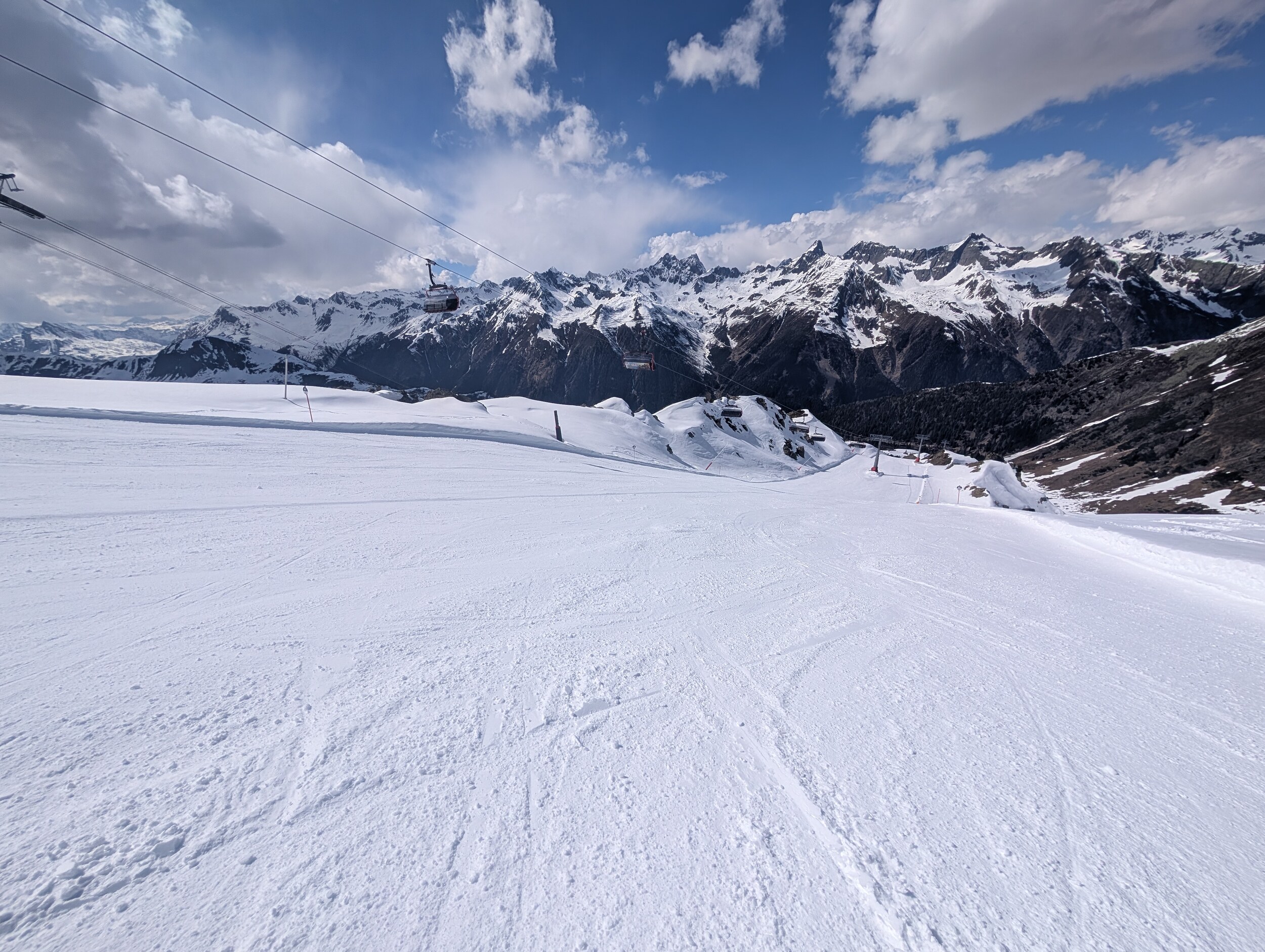 Die 40 Gampen runter im oberen Bereich ist richtig gut "carvbar". Im unteren Bereich an Lift Val Gronda wird es weicher aber wie immer am Rand noch gut fahrbar und man findet für die Uhrzeit auch noch die Bully-Rillen... Hat halt noch weniger Lüt als gestern. Temperaturen oberhalb 2300 / 2400 m noch unter 0 Grad und ab und zu Schattenwurf von einer Wolke hilft halt auch sehr. Leider hat die Bodenalp zu...