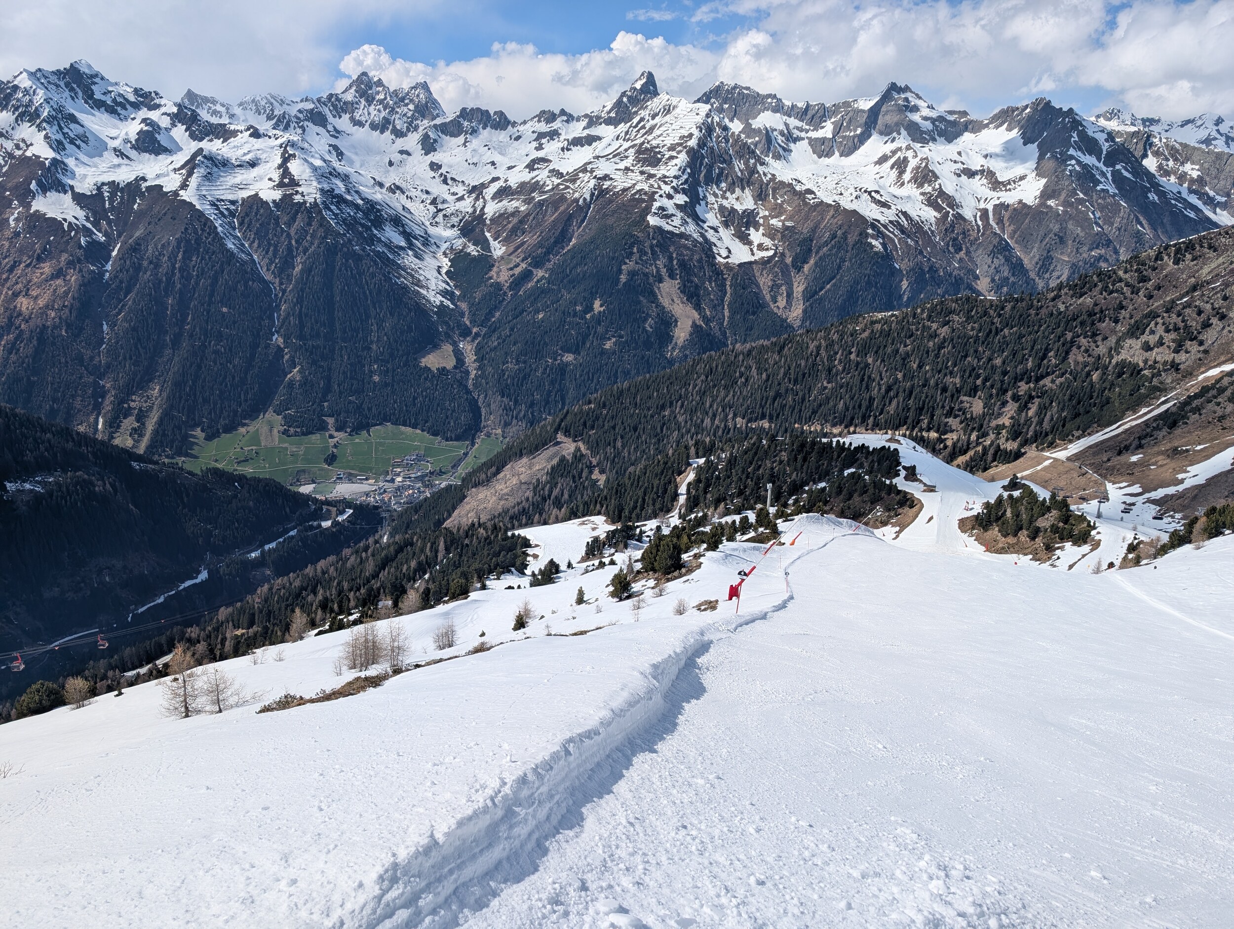 Nach einer wirklich kurz gehaltenen Mittagspause mal alle drei etwas steileren Abfahrten Palinkopf gefahren. Alle drei noch im festen / teils pulvrigen Zustand. Der mix aus Sonne und Wolken hilft da wahrscheinlich. Weiter nochmals Gampen. Im oberen Bereich immer noch super Carvbar. Unten jetzt deutlich weicher aber an den Seiten noch sehr entspannt fahrbar.