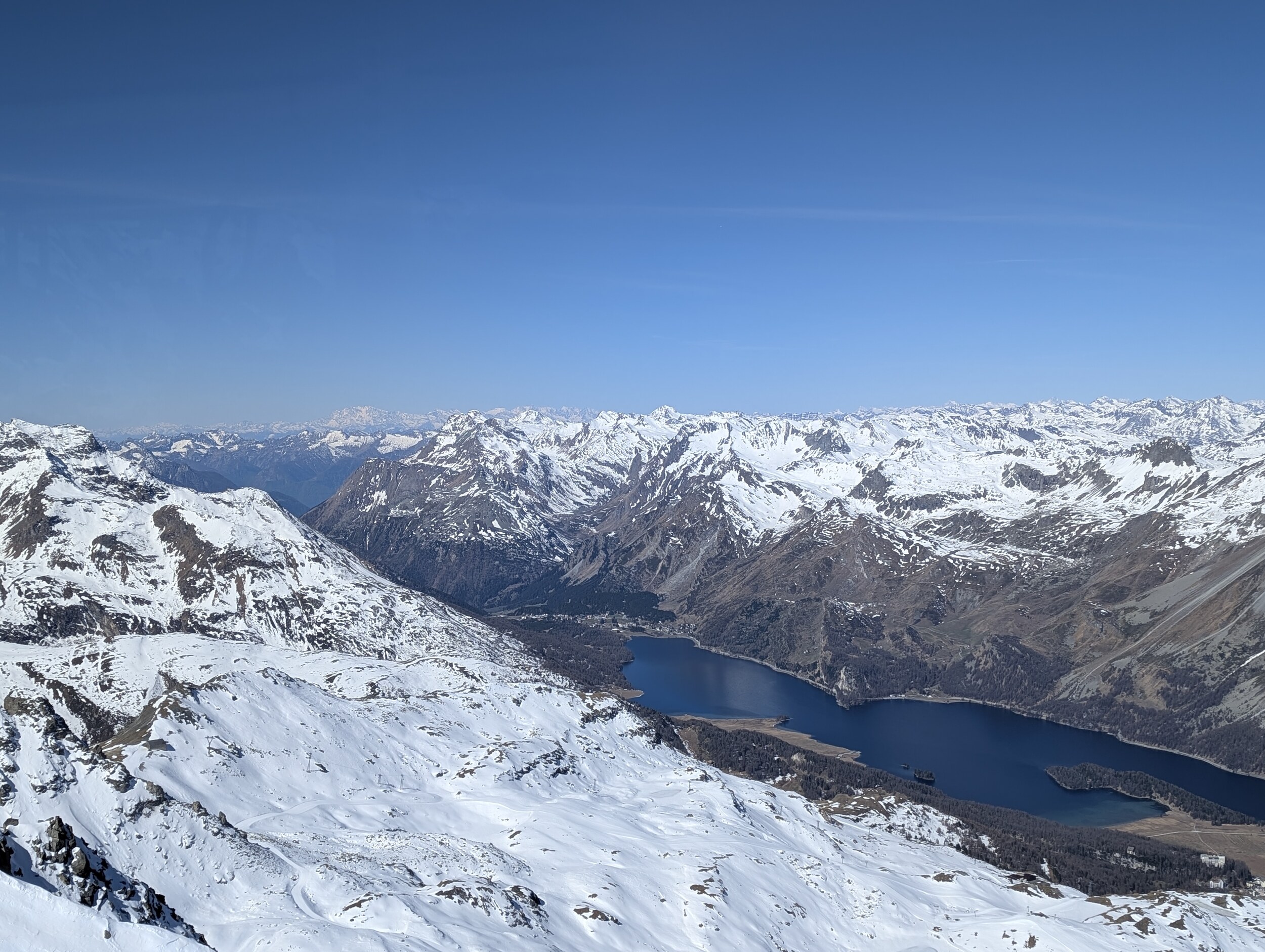 Heute verwerte ich meinen letzten Ikon-Tag am Corvatsch. Das Parkhaus war nach 9h schon voll, ich parke aber auch lieber unten, solange der SL Cristins läuft. An der PB hab es etwas Rückstau, musste aber nur 10min warten. Die Piste 9/11 war teilweise etwas bröckelig. Die Seen tauen langsam auf.