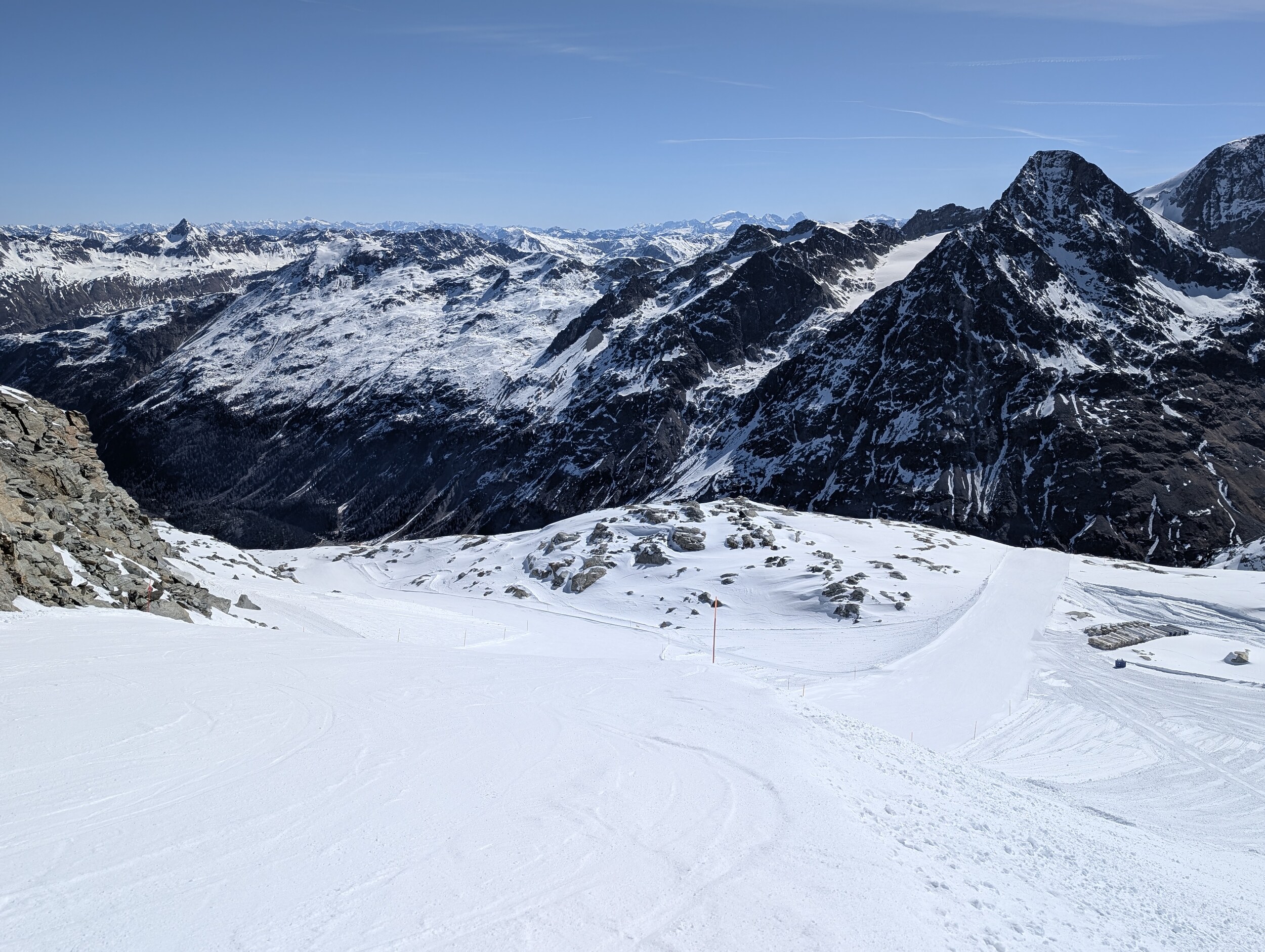 Die Furtschellas KSB wurde etwas entklappert, sonst alles wie bisher. Passt für mich, solange sie fehlerfrei weiterläuft. Die Pisten waren nach 12h immer noch top. Bei Piste 20 ist nur die Variante links offen (20a): Der Endhang am Crap Mellan SL hält sich auch sehr gut, obwohl es sehr mild ist. Die Piste 13 war auch noch so gut, dass ich eine Extrarunde gemacht habe. Der Furtschellas-Sektor hat voll überzeugt, und das ein Tag vor Saisonschluss. Jetzt muss ich langsam mal auf den Gipfel.. .. von dem die Sicht immer wieder atemberaubend ist. Ganz oben ist es 14h sulzig, weiter unten haben sich die Pisten besser gehalten. An Mandra gibt es ein paar Minuten Wartezeit, der Park ist recht gut besucht. Es riecht auch entsprechend nach Gras