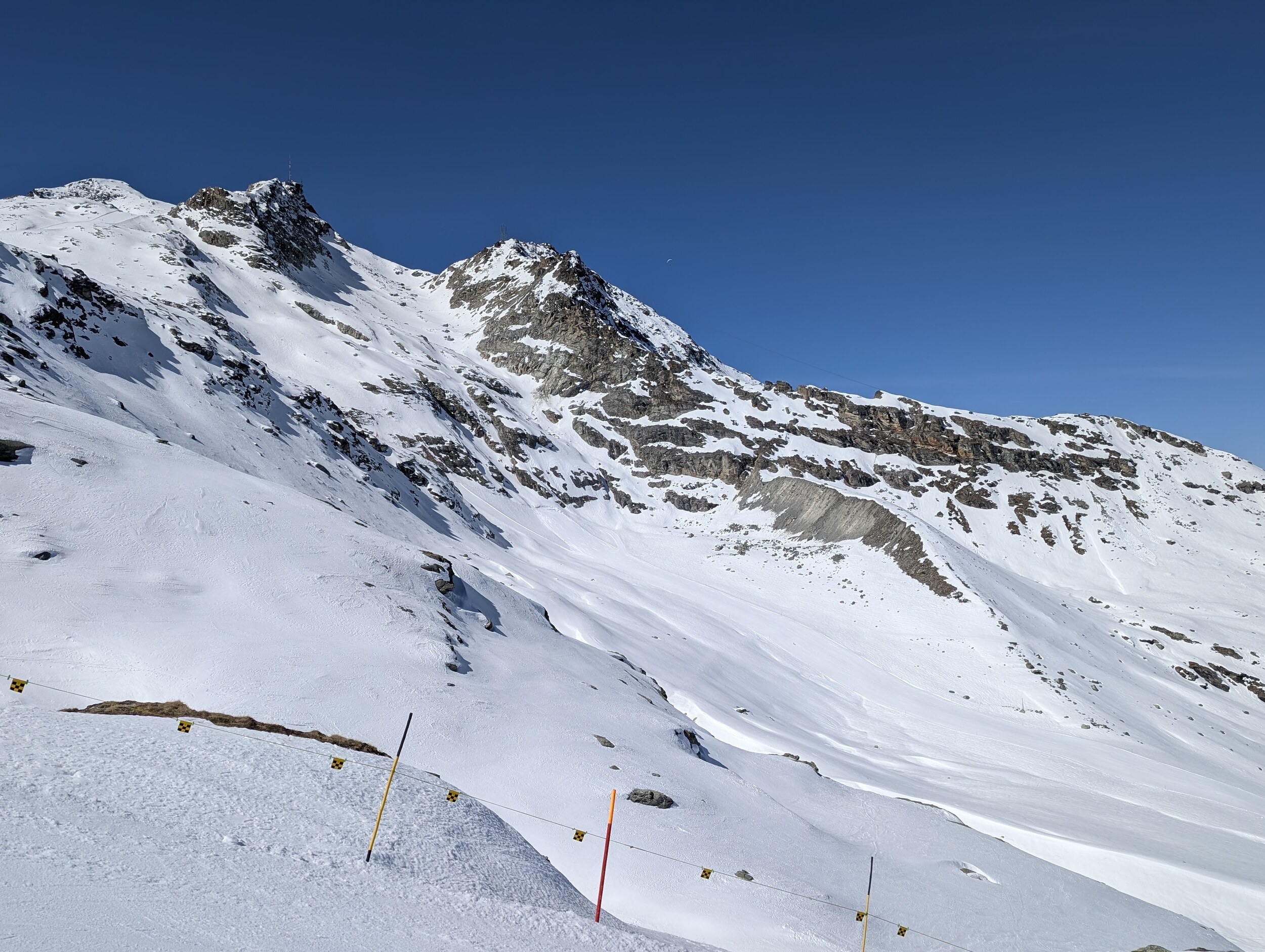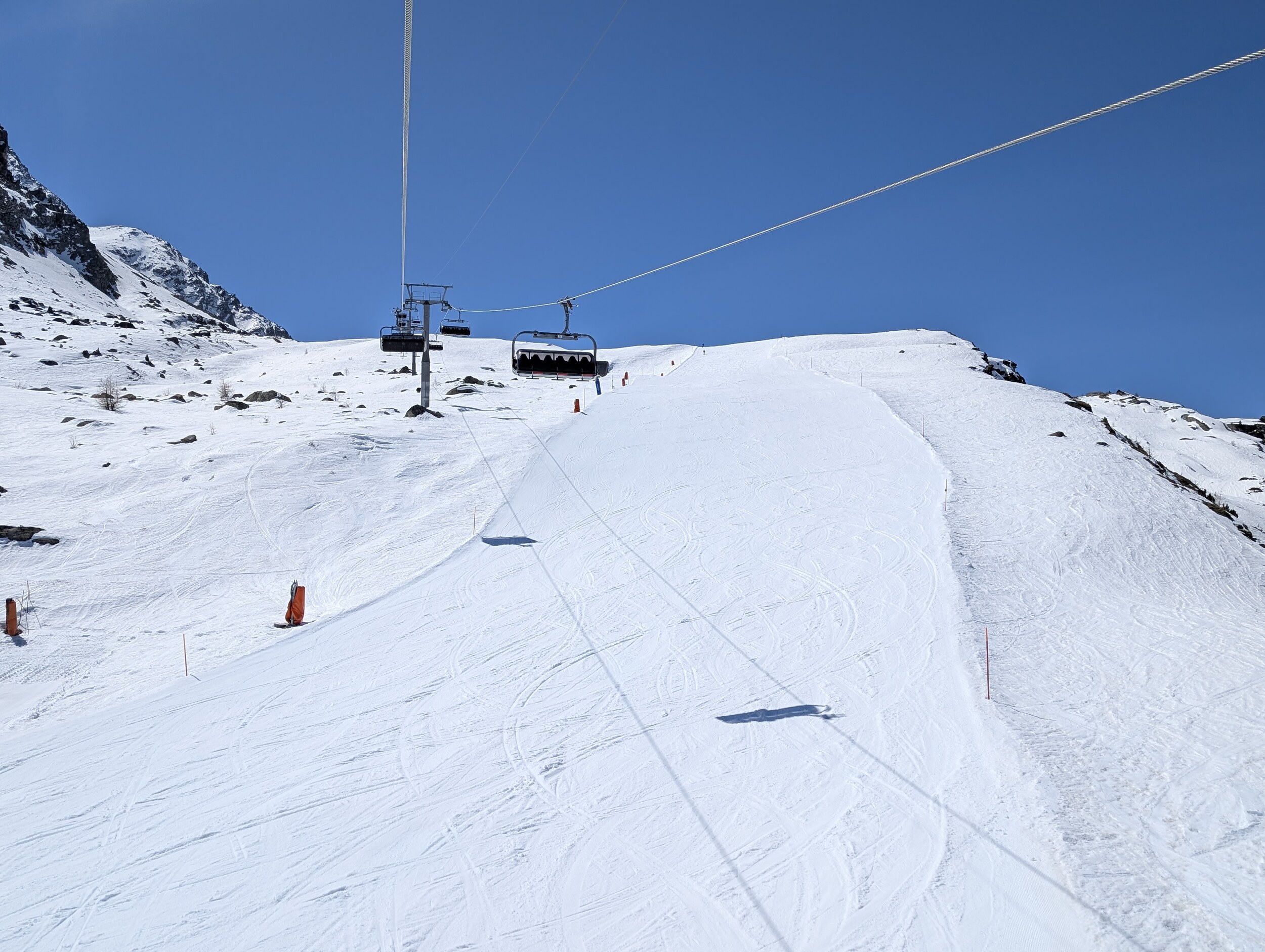 Gipfel unverändert gut, mittlerweile hat es 6x immer schön auf die nächste (ausserplanmässige) Fahrt gereicht. Chastellets ist um 12 Uhr weiter hart und teilweise unruhig präpariert.