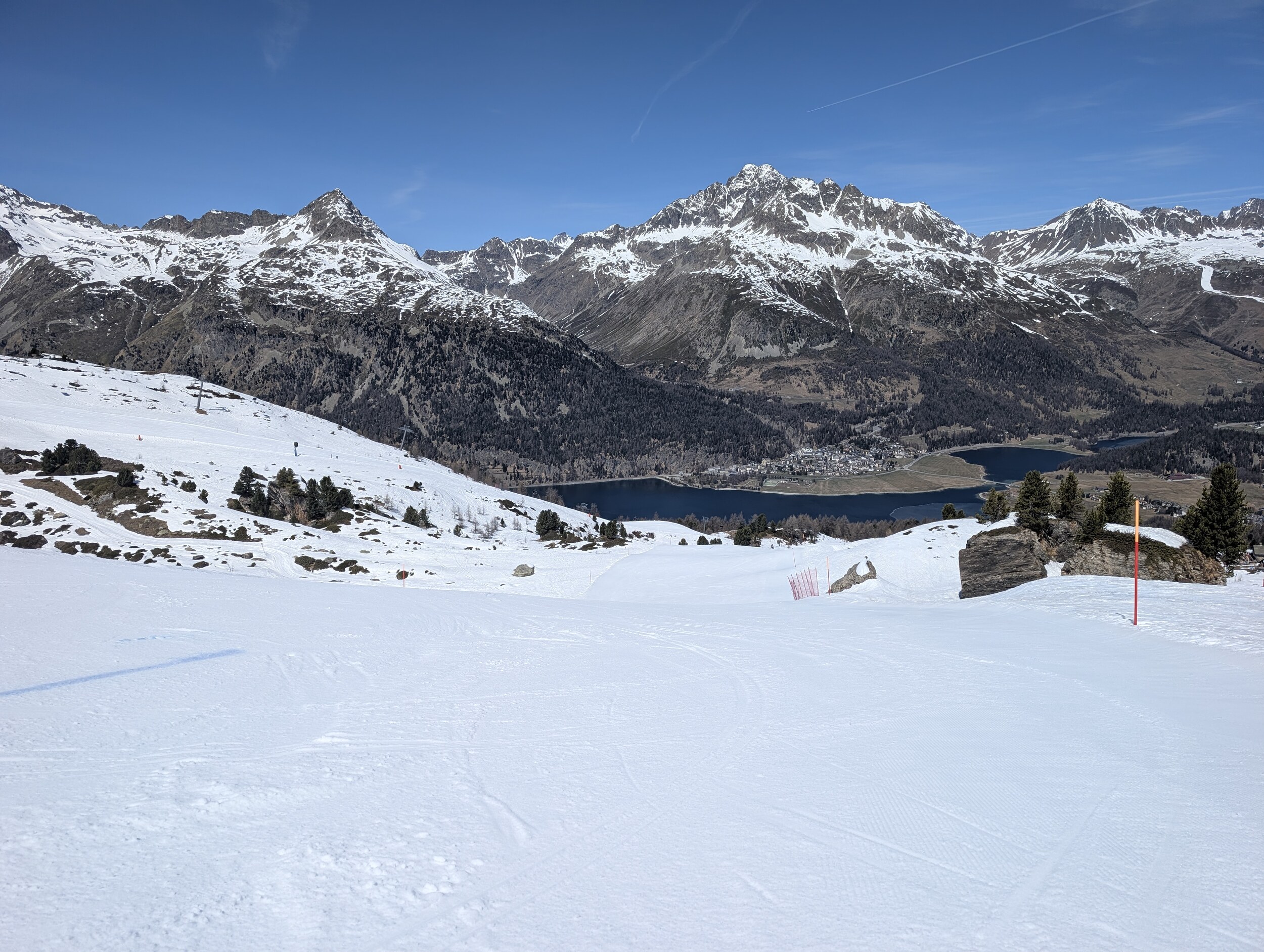 Heute verwerte ich meinen letzten Ikon-Tag am Corvatsch. Das Parkhaus war nach 9h schon voll, ich parke aber auch lieber unten, solange der SL Cristins läuft. An der PB hab es etwas Rückstau, musste aber nur 10min warten. Die Piste 9/11 war teilweise etwas bröckelig. Die Seen tauen langsam auf.