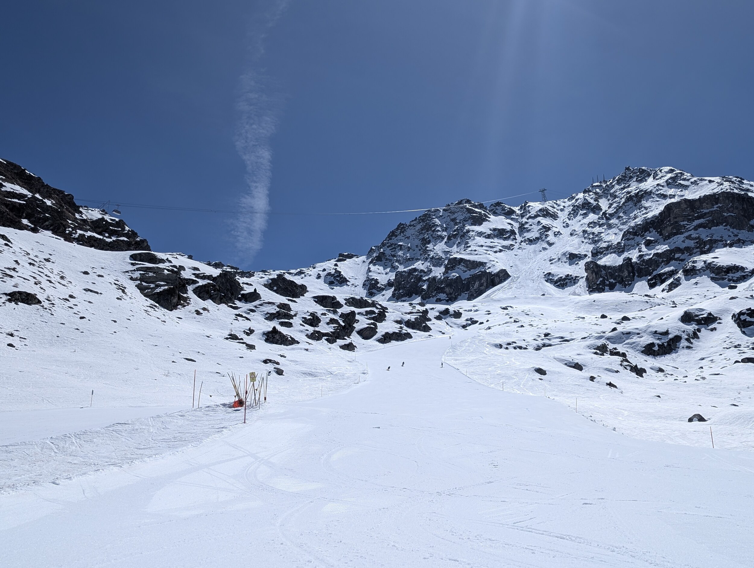 Wenn ich deinen Bericht lese dann hatte es im vergleich zum Mittwoch fast schon sehr viele Leute (smile). Ausser am und im Snowpark hatte ich am Mittwoch schon fast ein Privat Skigebiet. übrigens wer gerne den aussenausgang der Gondel in der 2. Sektion nimmt die wird oben nicht mehr geöffnet liegt Material vor der Türe für die Gletscherabdeckung. Morgen Season End Party Hossa Bar.