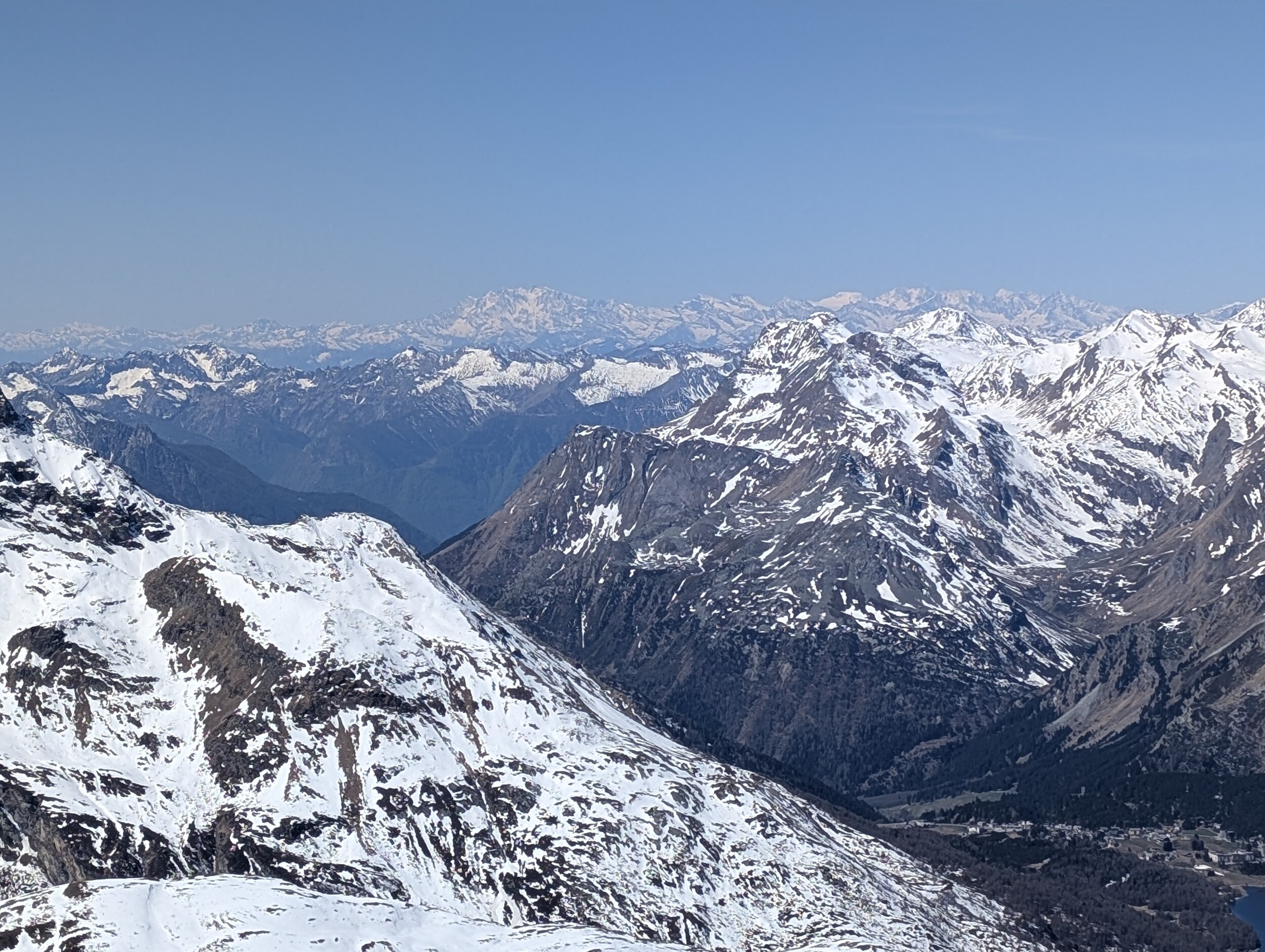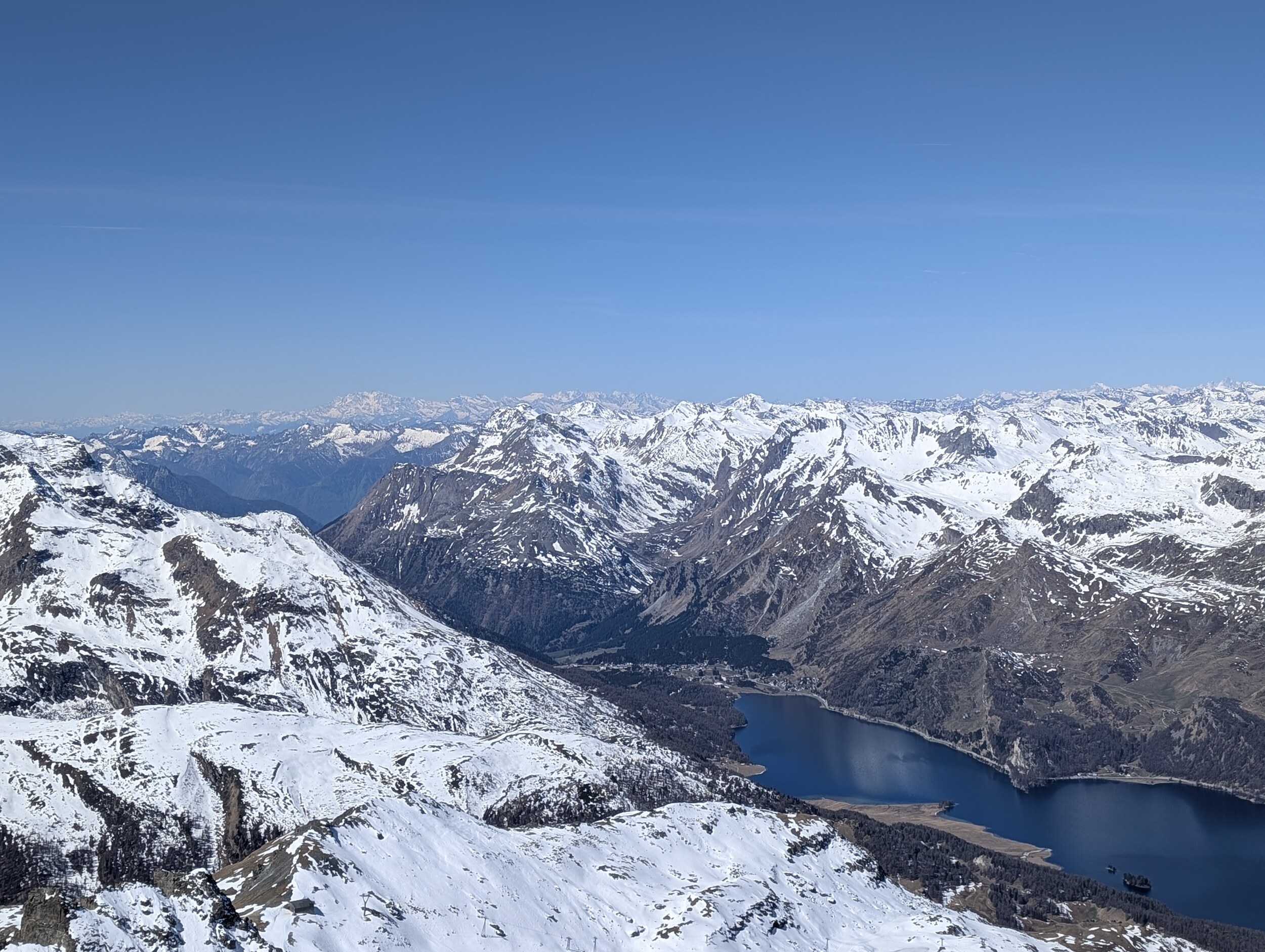 Die Furtschellas KSB wurde etwas entklappert, sonst alles wie bisher. Passt für mich, solange sie fehlerfrei weiterläuft. Die Pisten waren nach 12h immer noch top. Bei Piste 20 ist nur die Variante links offen (20a): Der Endhang am Crap Mellan SL hält sich auch sehr gut, obwohl es sehr mild ist. Die Piste 13 war auch noch so gut, dass ich eine Extrarunde gemacht habe. Der Furtschellas-Sektor hat voll überzeugt, und das ein Tag vor Saisonschluss. Jetzt muss ich langsam mal auf den Gipfel.. .. von dem die Sicht immer wieder atemberaubend ist. Ganz oben ist es 14h sulzig, weiter unten haben sich die Pisten besser gehalten. An Mandra gibt es ein paar Minuten Wartezeit, der Park ist recht gut besucht. Es riecht auch entsprechend nach Gras