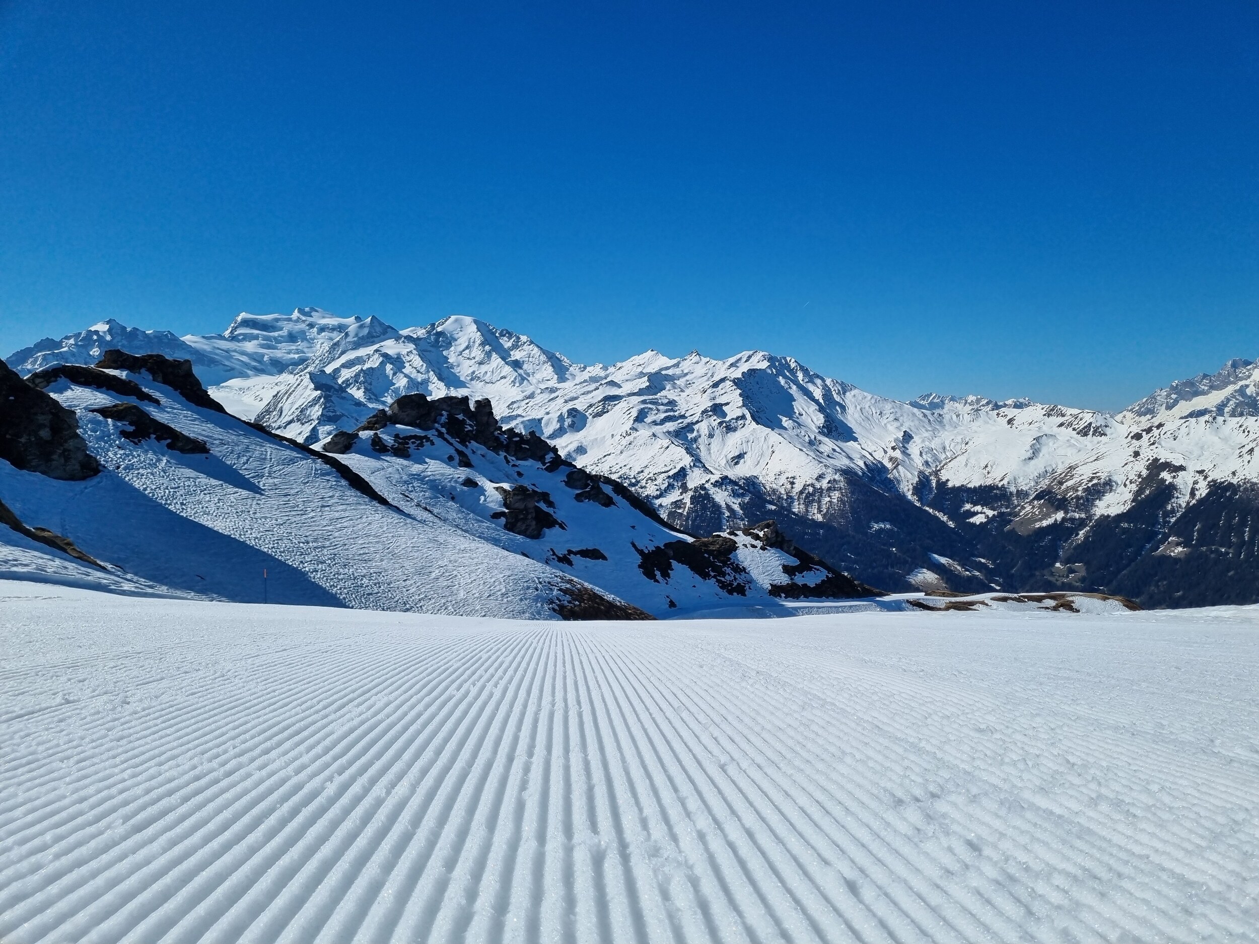 Sehr warm, Start daher sehr früh um Punkt 0845 wichtig. Talabfahrt Veysonnaz war oben sehr gut, unterer Teil aber sehr grenzwertig präpariert.