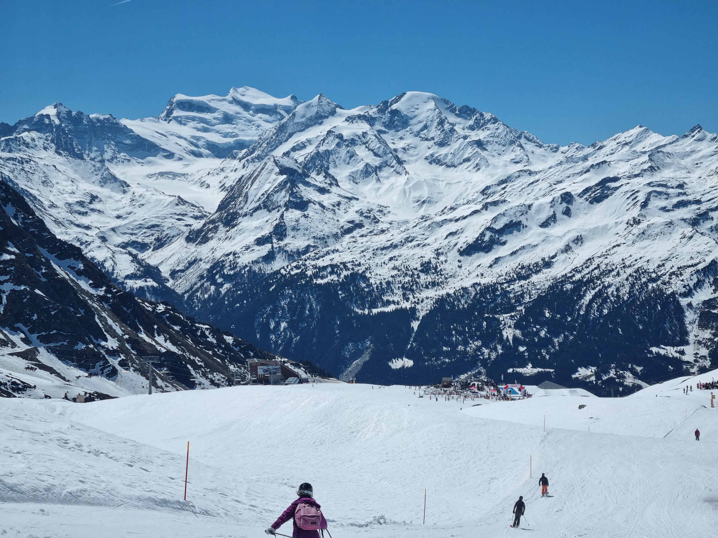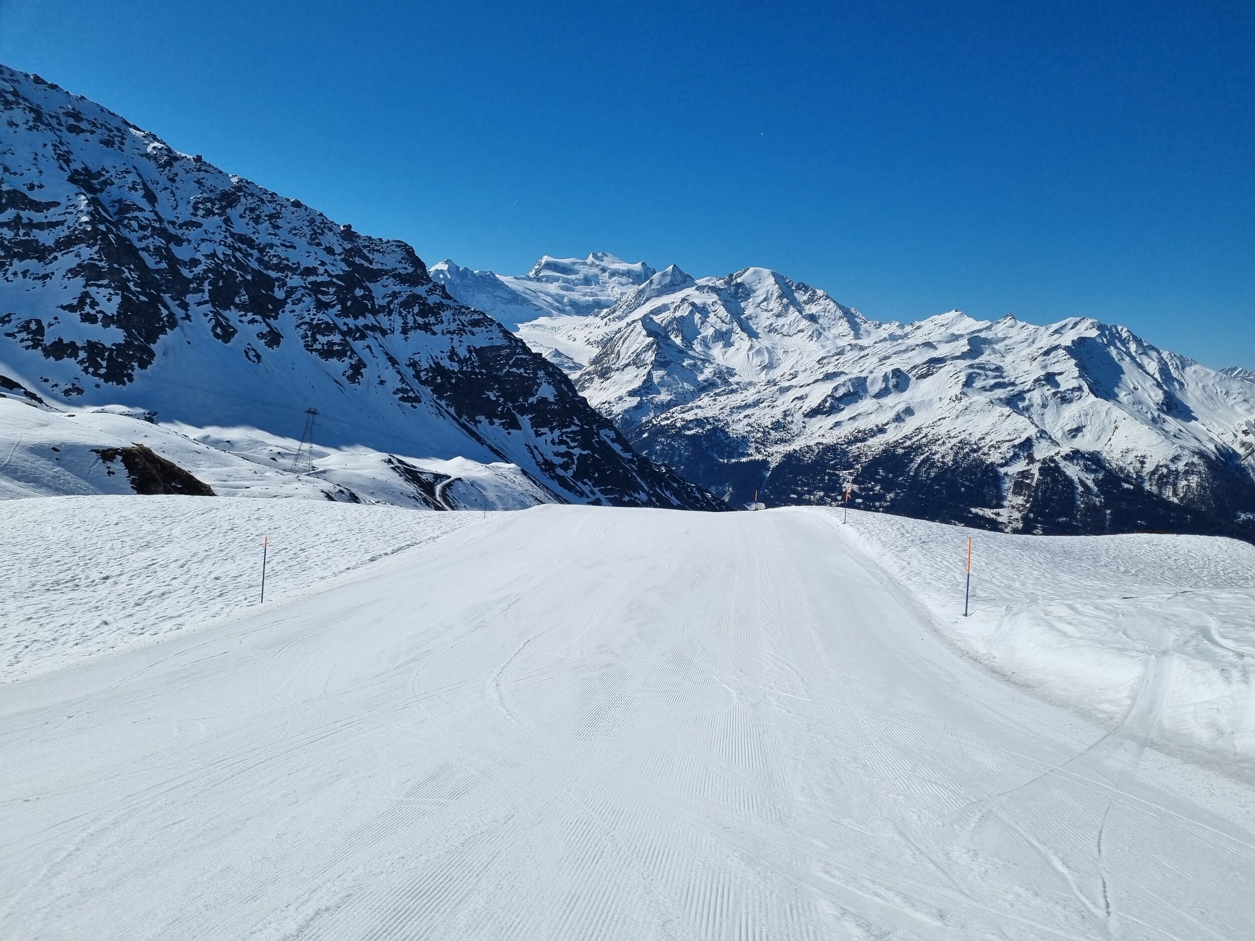 Heute herrliche Bedingungen in den 4 Vallées. Morgens überall winterlicher Schnee, nicht allzu viele Leute (sogar in Veysonnaz und Thyon war es ruhig), perfekte Pisten. Auch die gelben Routen waren gut.
