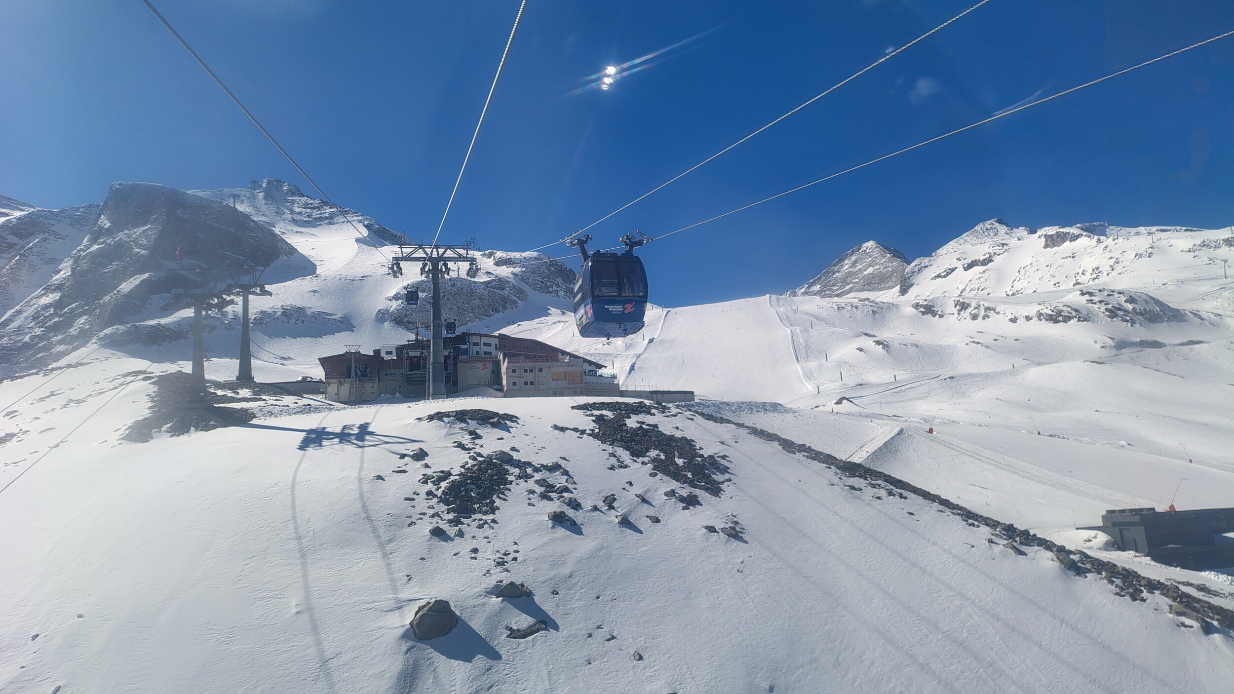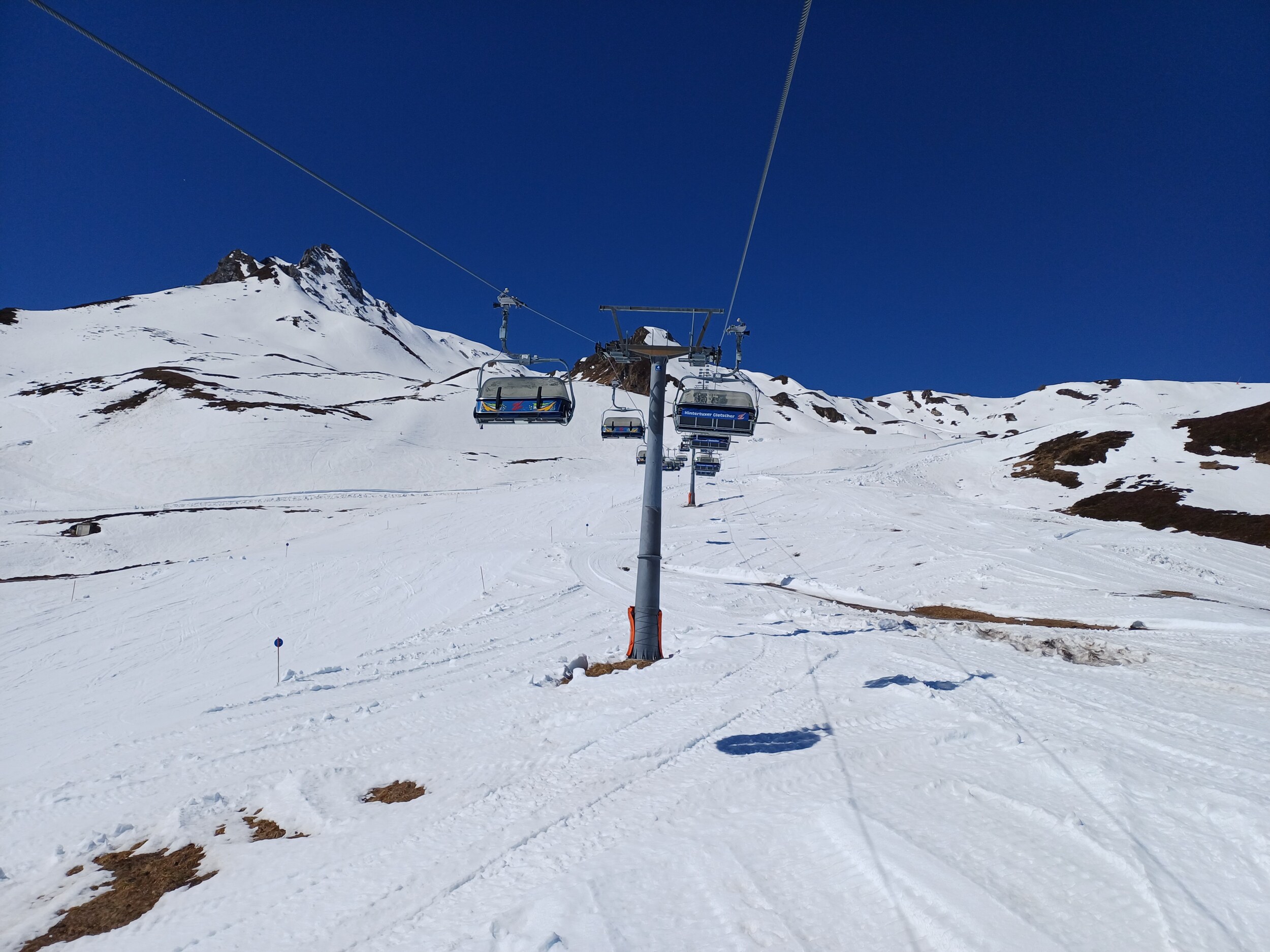 Nach Einlösen des Gutscheins an der Kassa ist die Schlange aber bereits weg und wir kamen sowohl am GB1 und GB2 mit nur 3-4 FBM Wartezeit hoch. Beim 8er Sommerberg und 4er Fernerhaus sind zwar die Gondeln ausgaragiert, aber die Lifte laufen nicht, was bei dem Andrang wohl auch nicht notwendig ist. Am GB3 konnten wir direkt durchgehen und so gab es oben erstmal den Standardblick Richtung Olpererlifte.