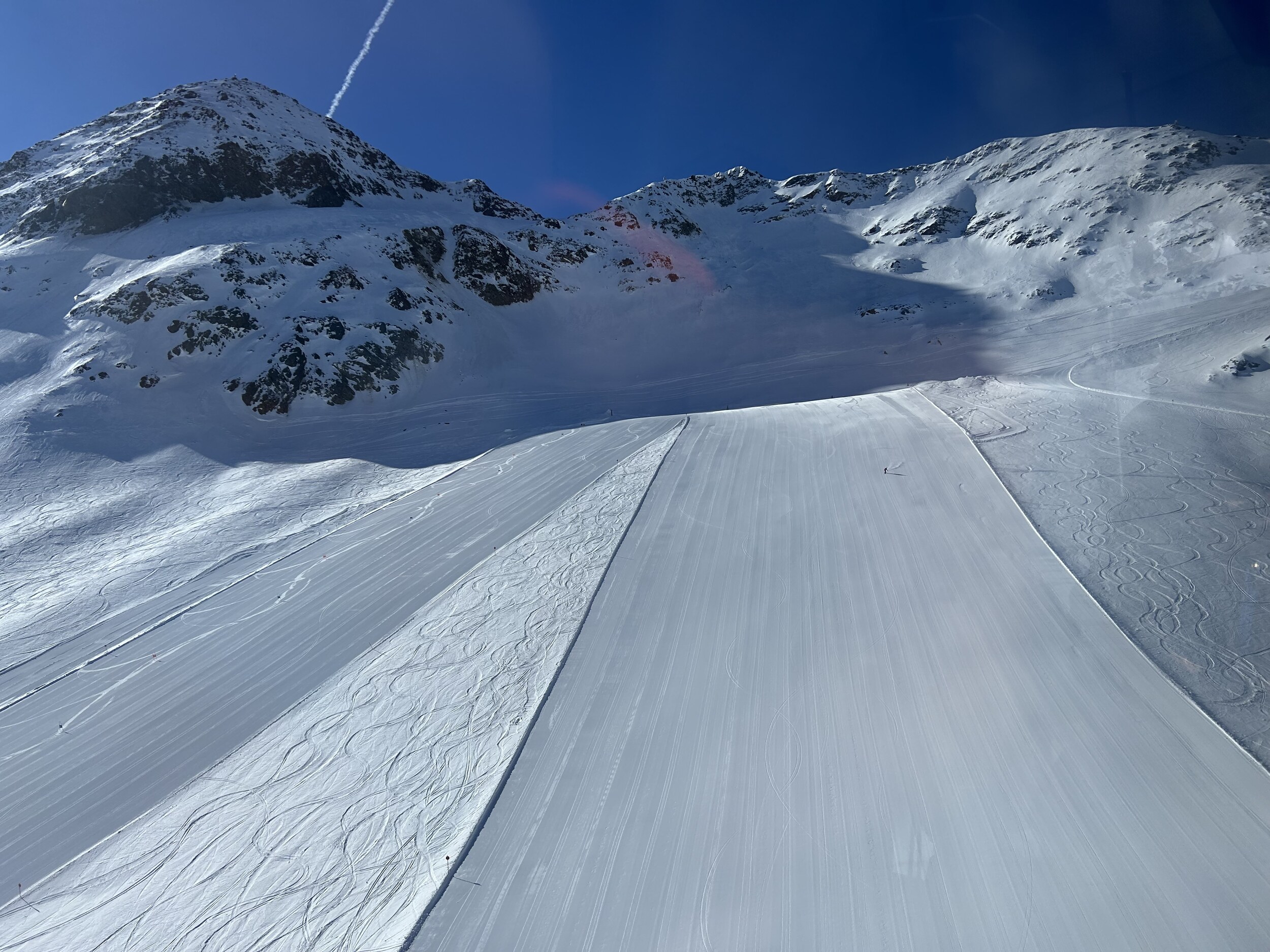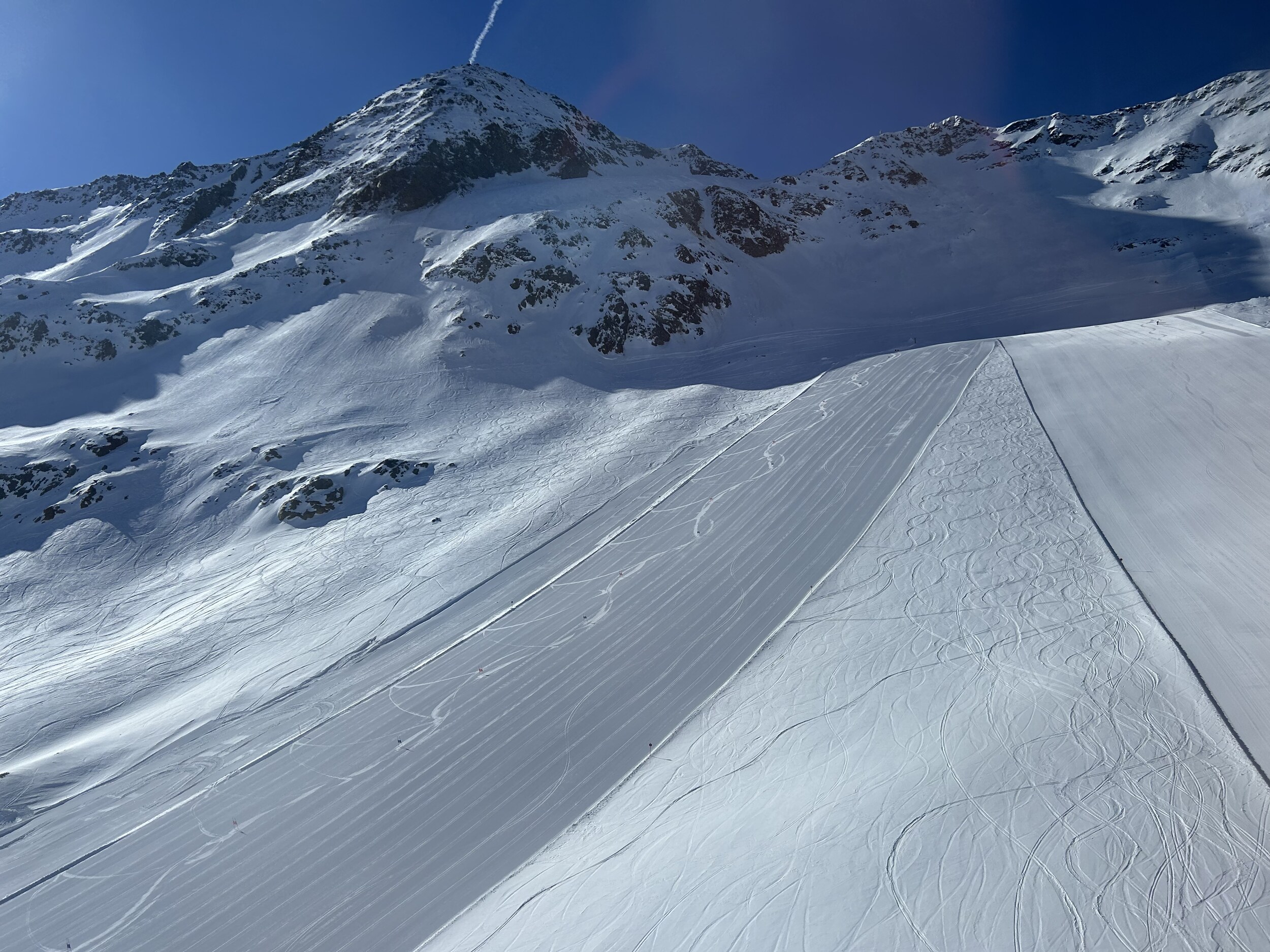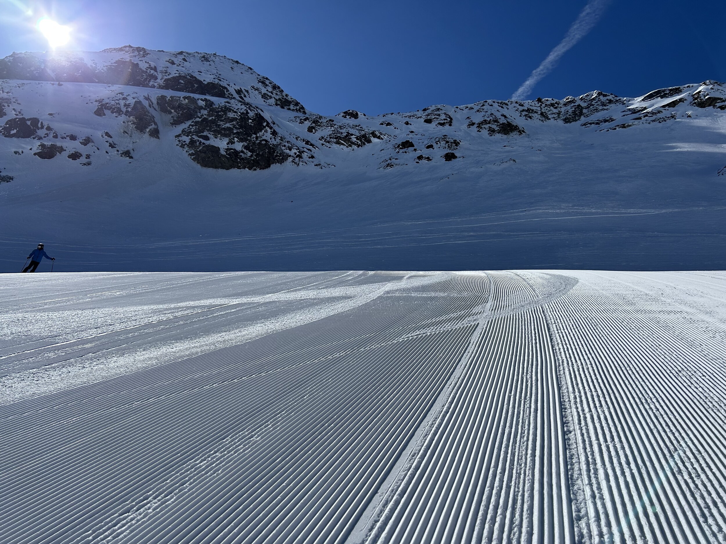 Nach den warmen Temperaturen der letzten Tage, hatte ich Bedenken, dass auch oben am Gletscher der Schnee nicht mehr lange durchhält. Aber die kalten Nächte lassen es ordentlich durchfrieren und nur die Südhänge werden weich. Am Morgen waren alle Pisten perfekt zum fahren und die Präparation ist gewaltig gut. Vor allem am Flaginjoch war es ein Traum den ganzen Tag und auch noch um Mittag gab es dort die Präparierrillen. So gute langanhaltende Pisten hatte ich die ganze Saison nicht. Auch die Vronitunnelpiste war der Hammer.
