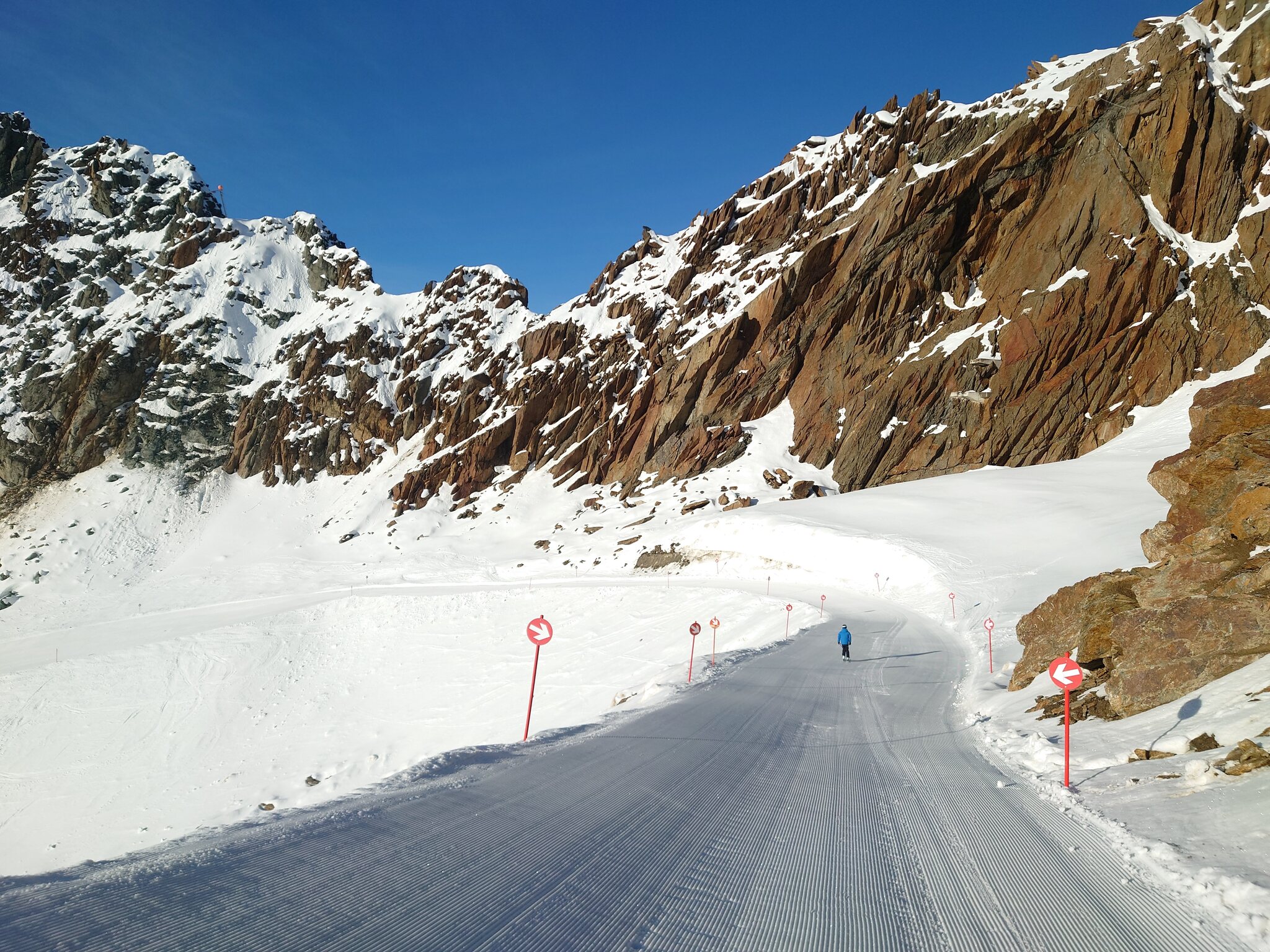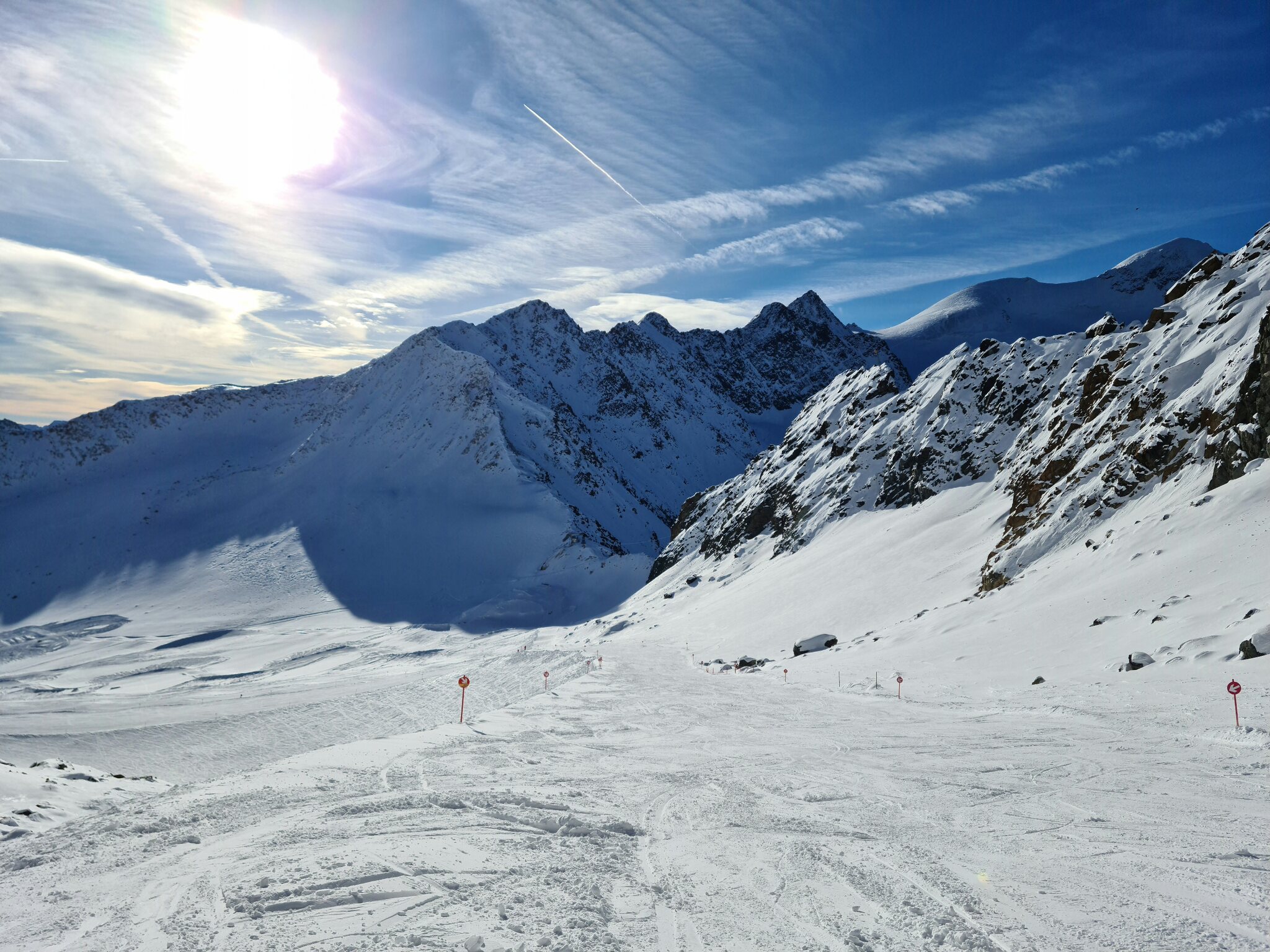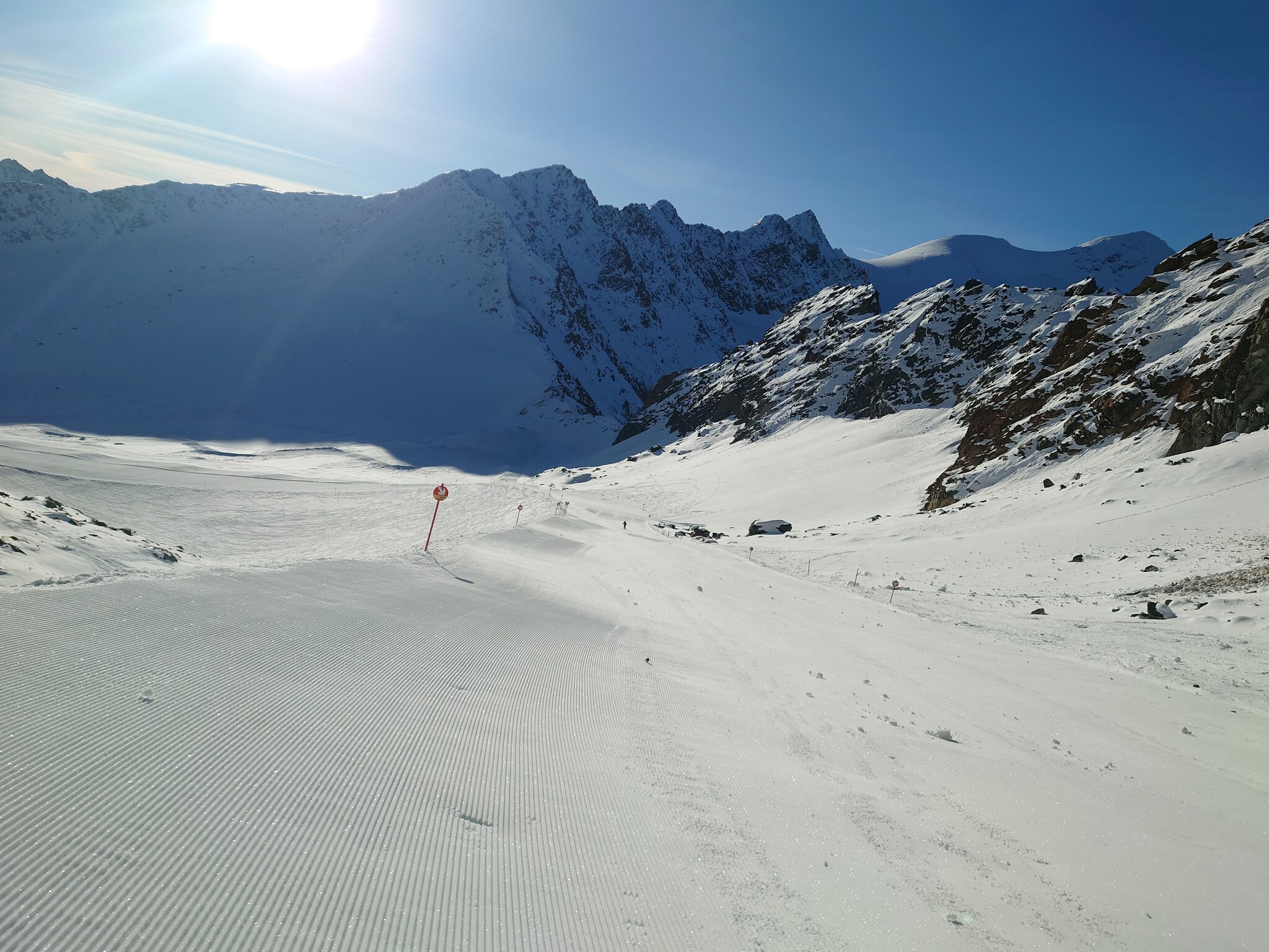 Ab heute Skibetrieb bis 15:45. Ich bin dann 15:42 in die Wildspitzbahn eingestiegen. Oben sagten sie mir, dass der Pistendienst eingangs Steilhang auf mich wartet.