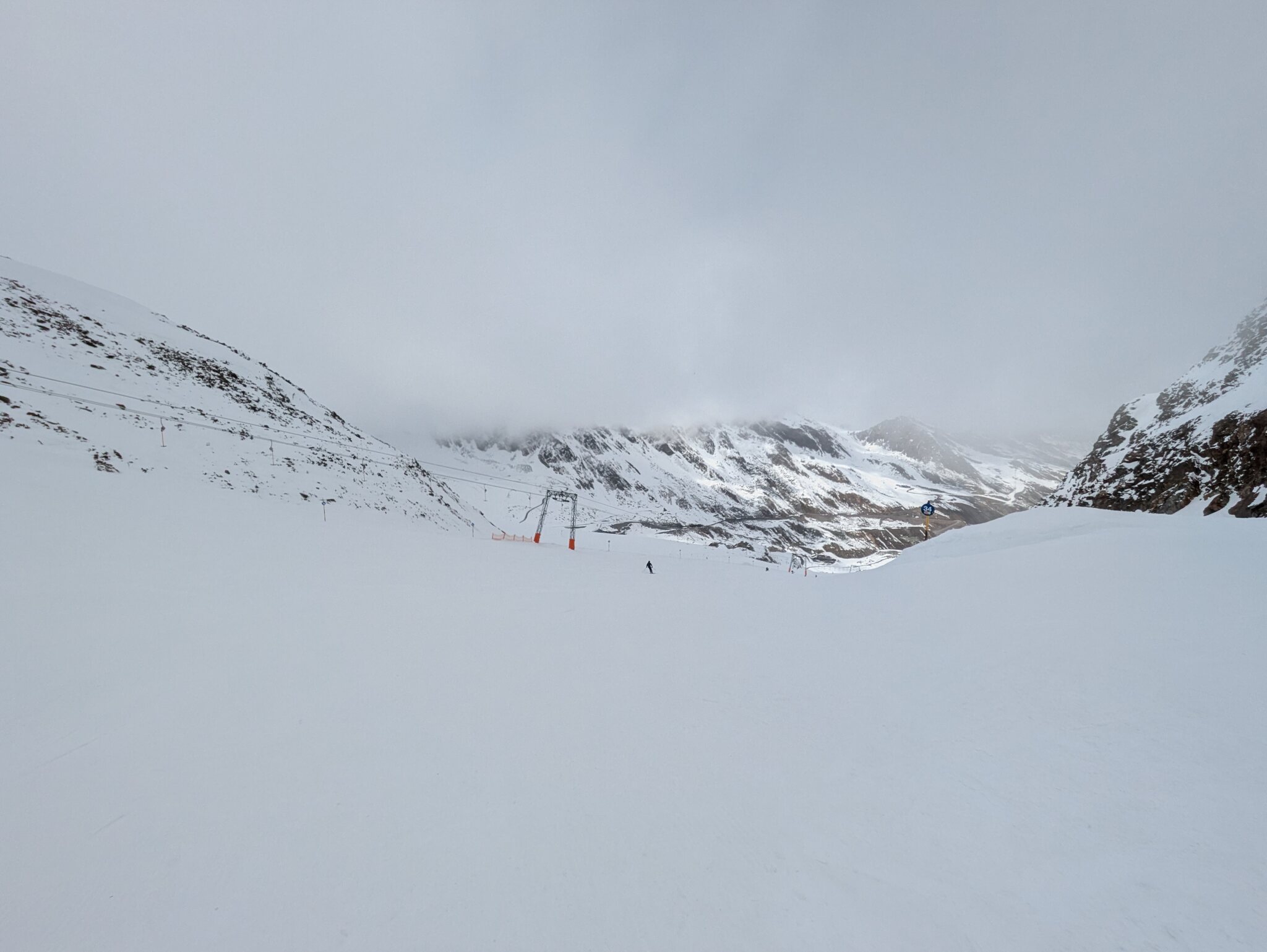 Heute war ich erstmals in Sölden. Ich bin gegen 11.30 Uhr am Giggijoch gestartet. Die Piste 13 hat Spaß gemacht. Nach gut einer Stunde bin ich zum Gletscher. Hier waren besonders die Piste 32 und 41 im Nebel. Die 41 bin ich nicht gefahren, die 32 nur ungern. Cool war die 39. Die Schwarze Schneid (31) habe ich mir einmal gegeben.