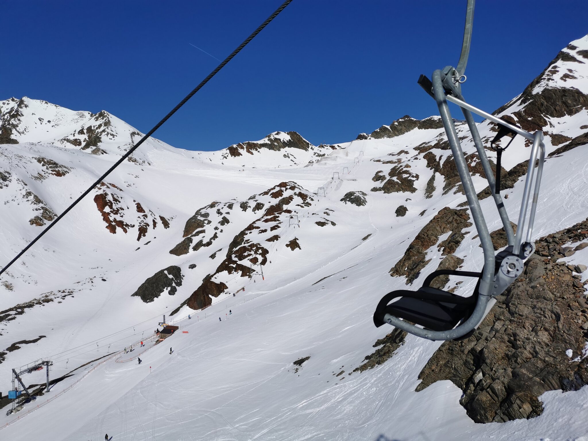 Die Dresdener Hütte hat noch bis Ende der Woche geöffnet, womit auch für ein brauchbares gastronomisches Angebot gesorgt ist, auch von man von dort zur Mittelstation nicht mehr mit Ski abfahren kann.