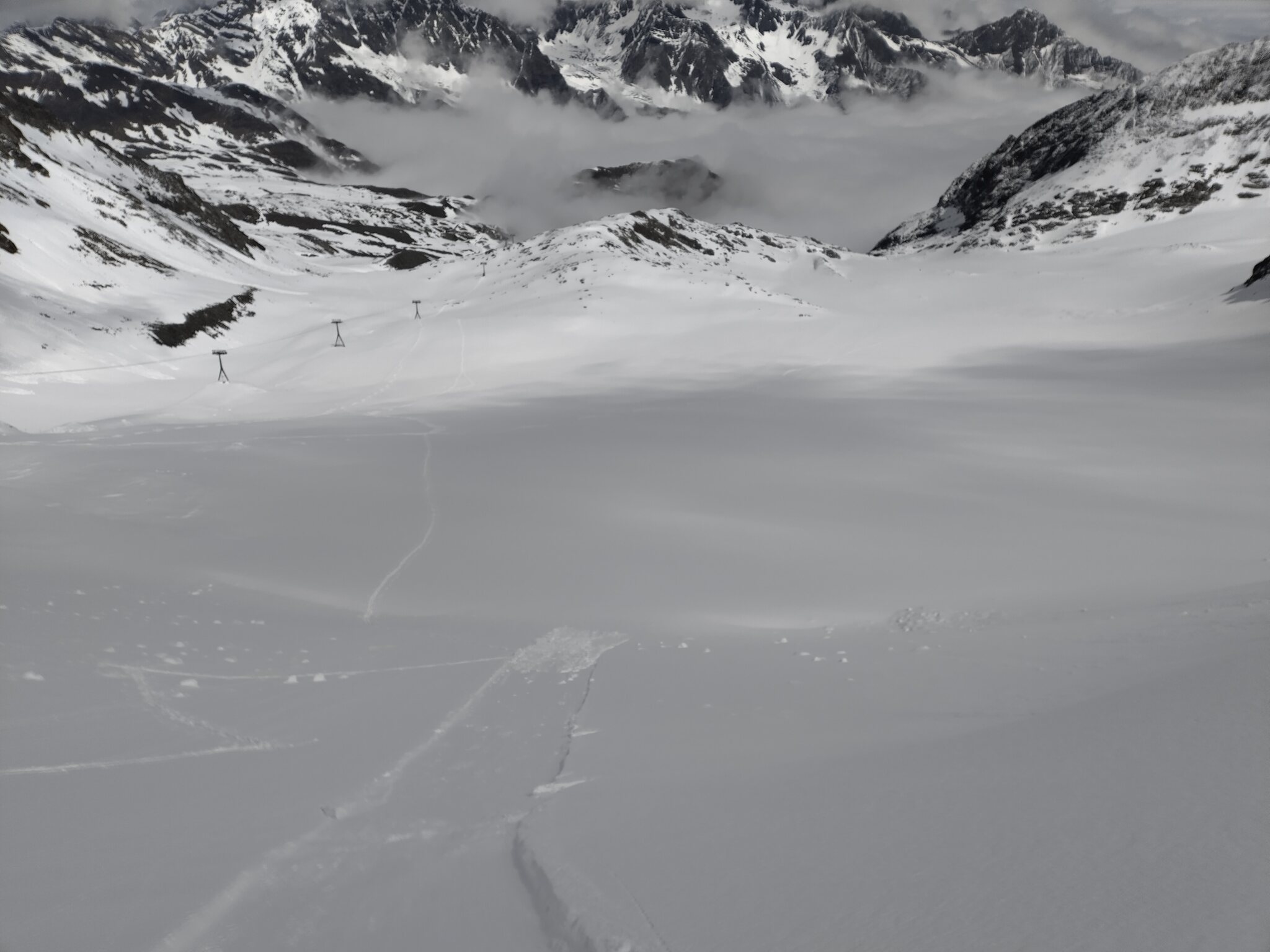 Gestern gegen 14:00 ist wohl eine Lawine auf eine Piste abgegangen, ziemlich gross, zum Glück ohne Personenschäden: