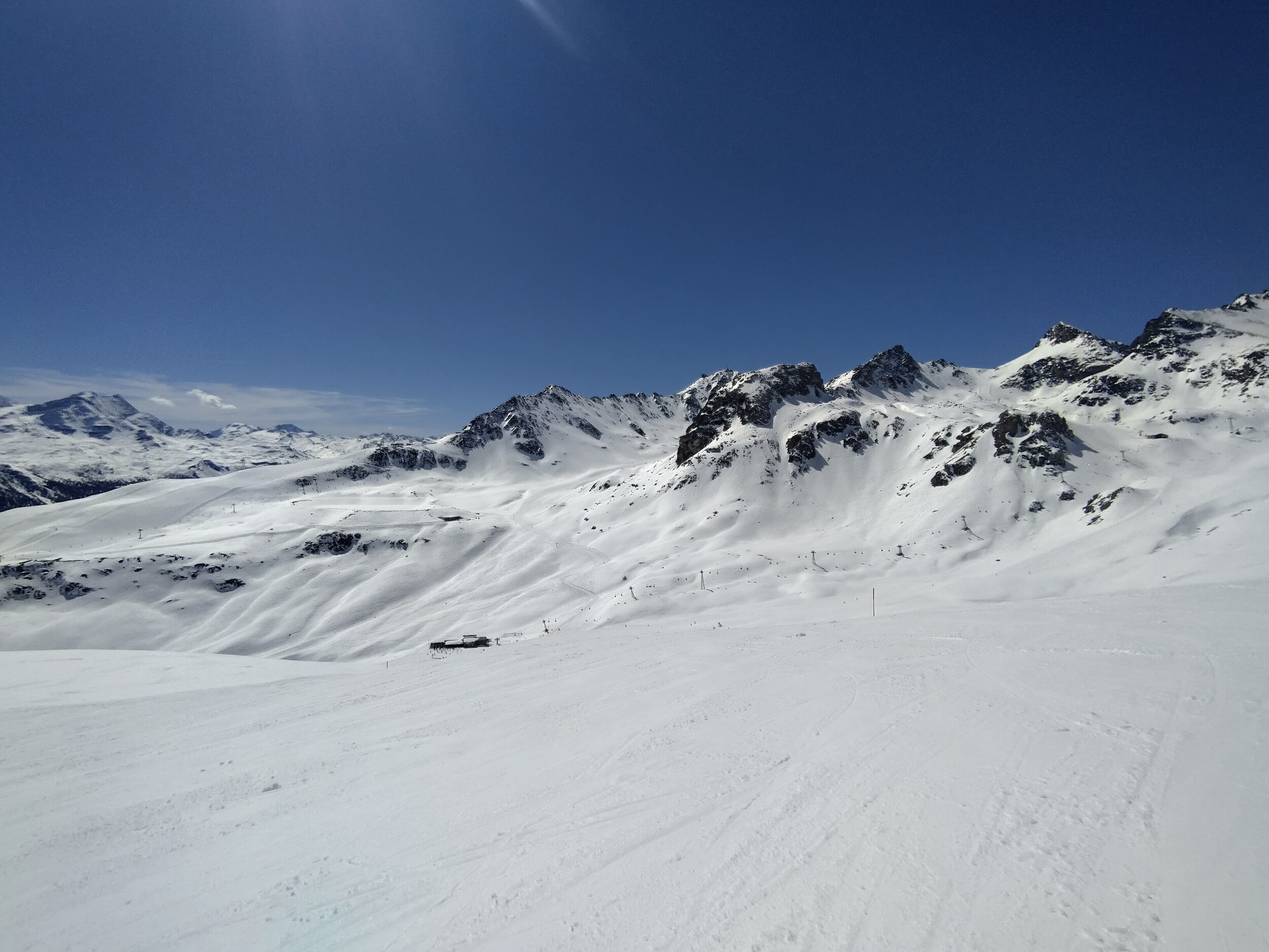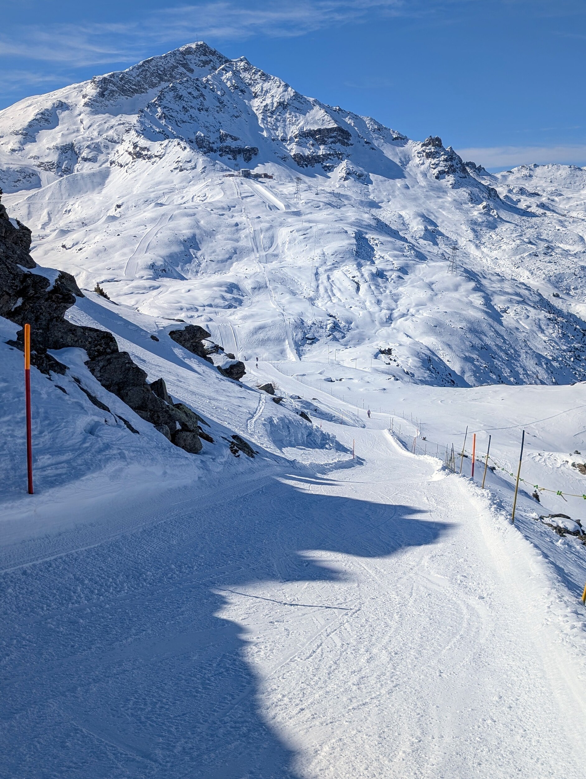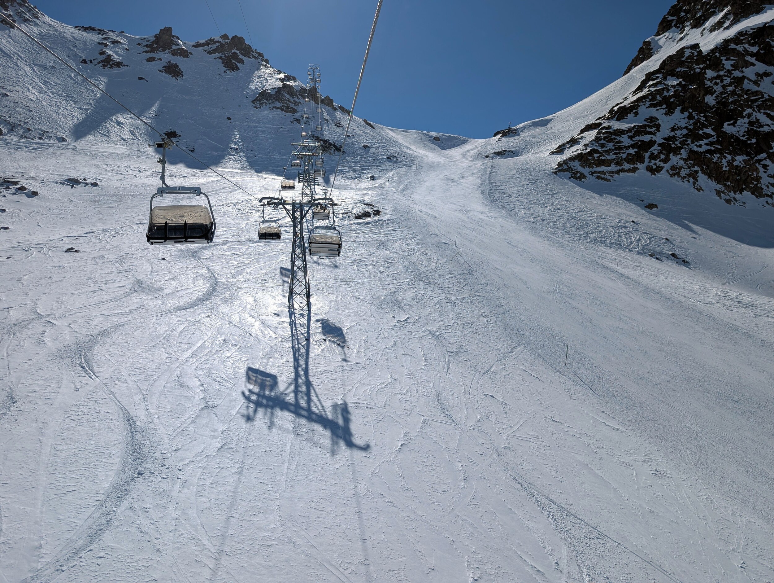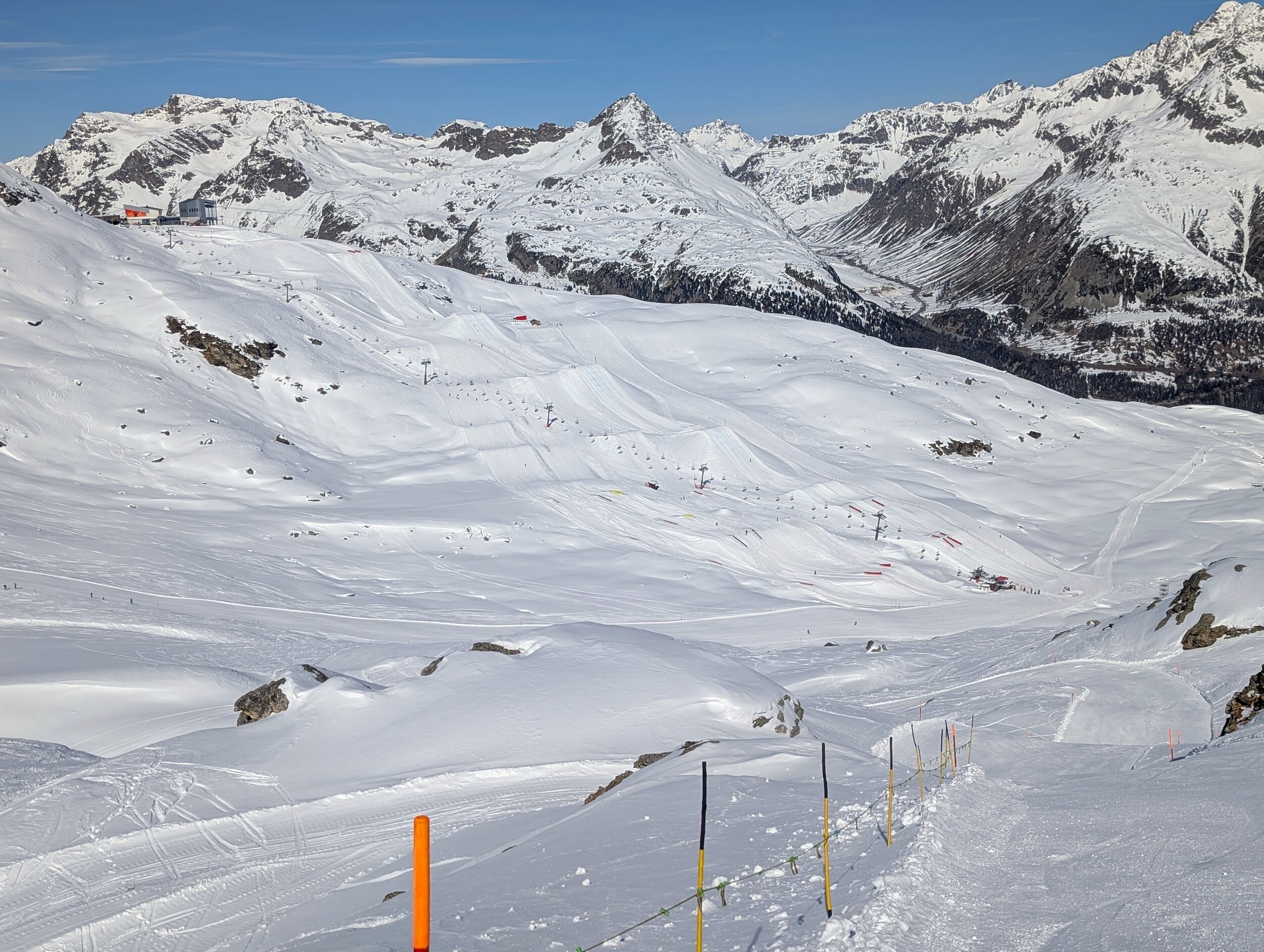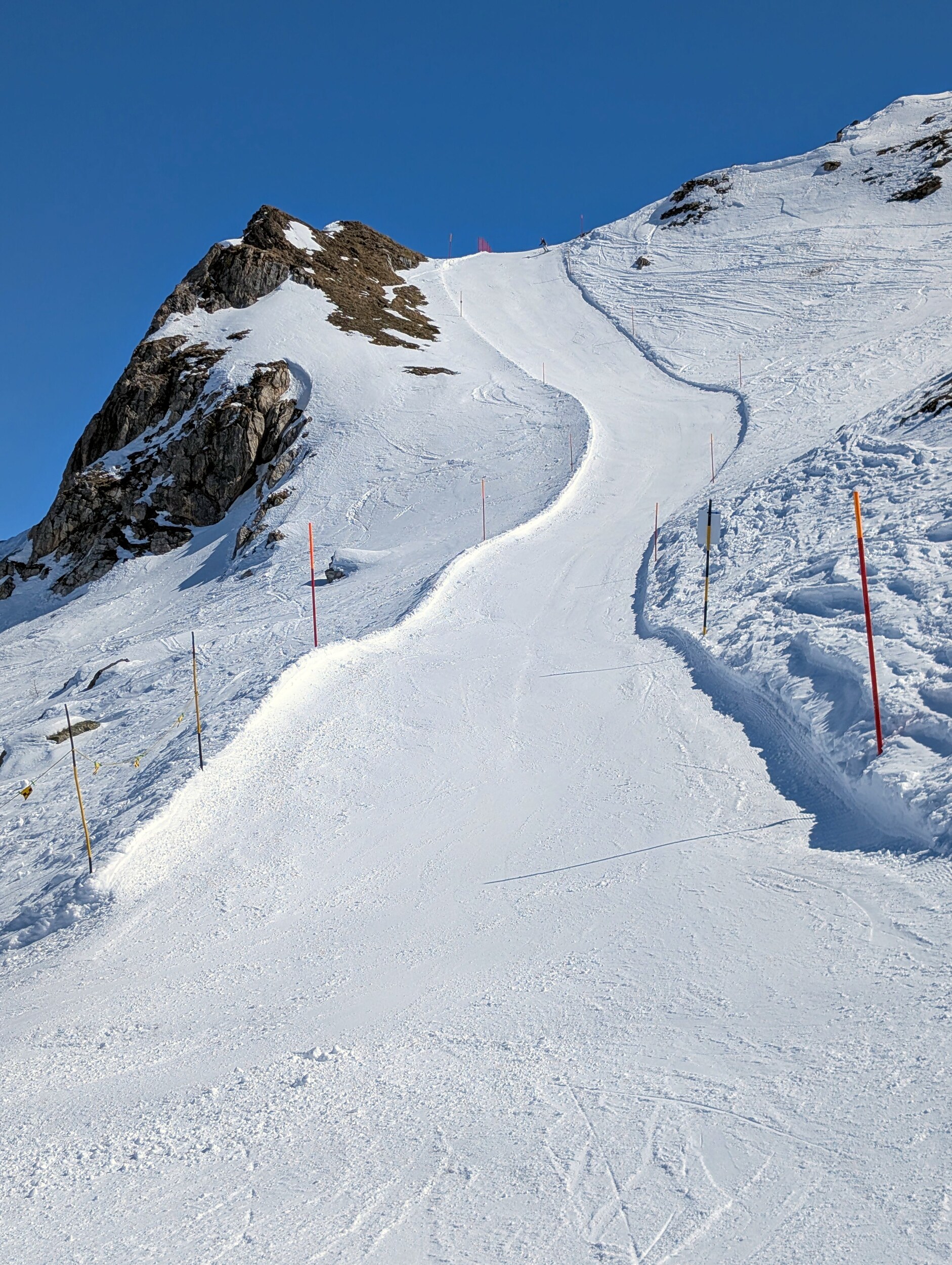 Am Park 4er hatte es jeweils am ehesten noch eine Schlange, und ich bin jeweils direkt weiter zum Giand'Alva. Wenn man rechts neben der Piste den Spuren folgte, klappte das auch ohne Stockeinsatz.