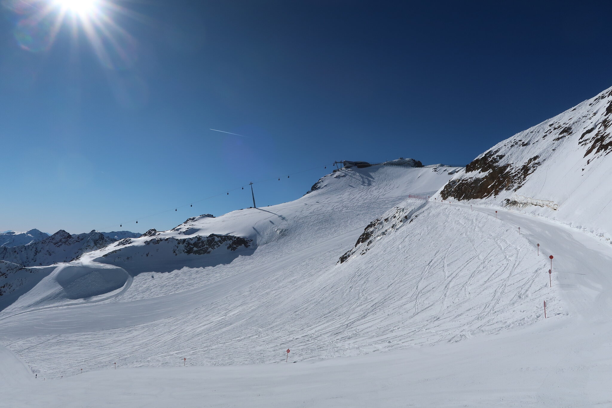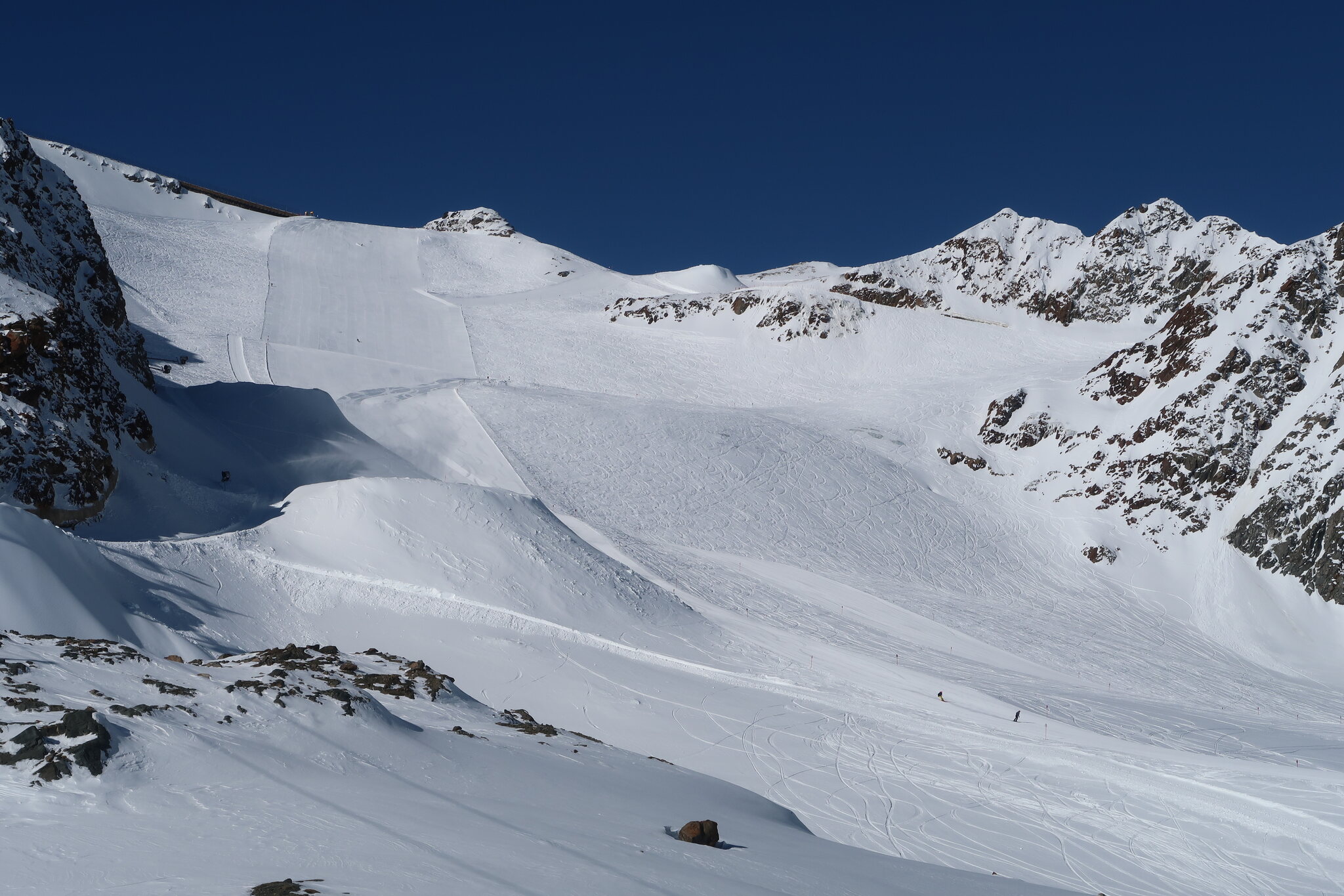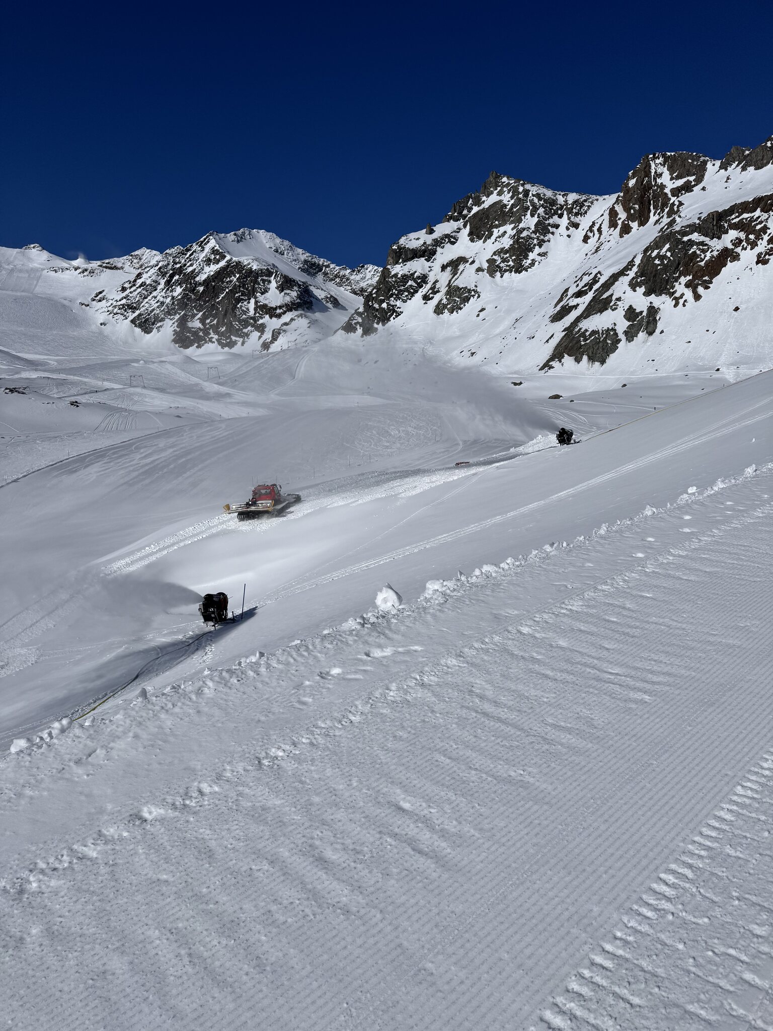 Krass dass bereits jetzt der Steilhang oben geschlossen ist und beschneit wird. Das zeigt wie bescheiden die Schneelage ist und was den Gletscher bzw. die Bergbahnen voraussichtlich im Sommer / Herbst erwartet