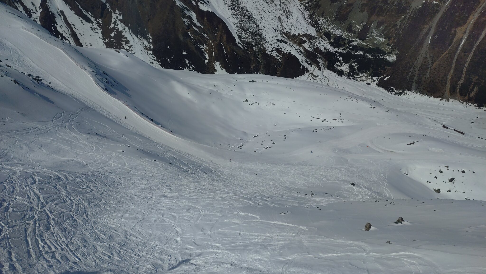 Zum Teil ein bisschen braun und schon sehr sulzig, aber keine Steine. Heute war ich auf dem Gletscher. Schneeverhältnisse schön pulverig und besser als am Rifflsee. Leute hatte es schon ein paar, vorallem an der Mittelbergbahn musste man ein bisschen anstehen. Das Niveau der Skifahrer war zum Teil sehr schwach, kein Vergleich zu Engelberg. Am Schluss ging es noch auf den Notweg ins Tal. War gut zu fahren, einzig nach dem oberen Teil musste man ein wenig aufpassen.