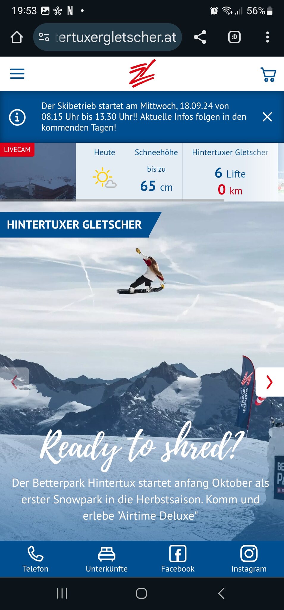 Also sogar noch weniger, als ich vermutet hatte, weniger als der übliche Sommerbetrieb.Skifahrer hat geschrieben: 17.09.2024, 15:16 Laut Liftinfo und interaktivem Pistenplan sind morgen Sl Olperer, GB3, 10EUB sowie Pisten 3, 4, 5, 9 und 9a zum Skifahren geöffnet.