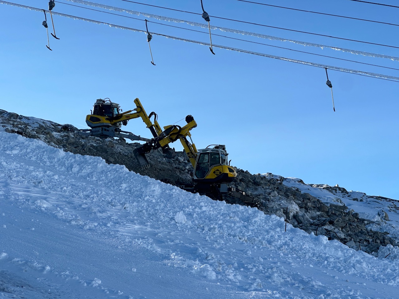 Da braucht es wohl viel Schnee bzw. Bagger, bis der Lift an der GW wieder läuft: Weiter unten sind diese schon am arbeiten: Und noch von unten gesehen: