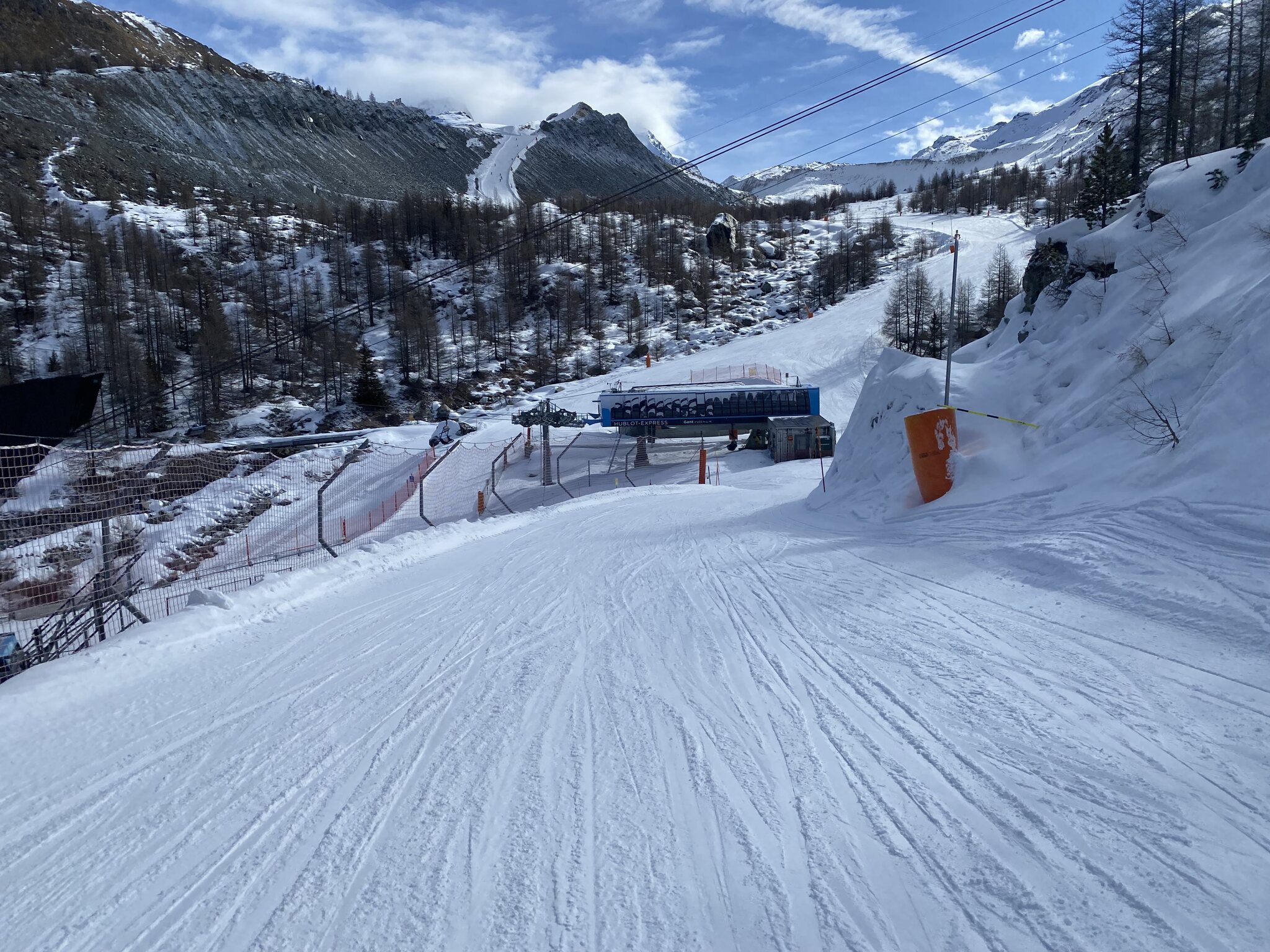 ), denn kaum waren zwei Sessel hinter mir aus der Station wollte der Hublot-Express nicht mehr. Ich konnte mich dann die nächsten 20 Minuten gemütlich mit meinem Sesselnachbar unterhalten, der aus Südafrika Skiurlaub in Zermatt macht, während sich in Gant kleine Dramen abspielten. Hohtälli hätte nämlich um die Zeit schließen sollen, aber scheinbar war unklar wie schnell sie den Hublot wieder zum Laufen bekommen. So gab es ein großes Hin- und Her und einige Leute wurden noch zur Hohtälli-PB geschickt, deren letzte Fahrt sich immer weiter verzögert hat. Als ich dann endlich oben war, blieb eigentlich nur noch die Talabfahrt.