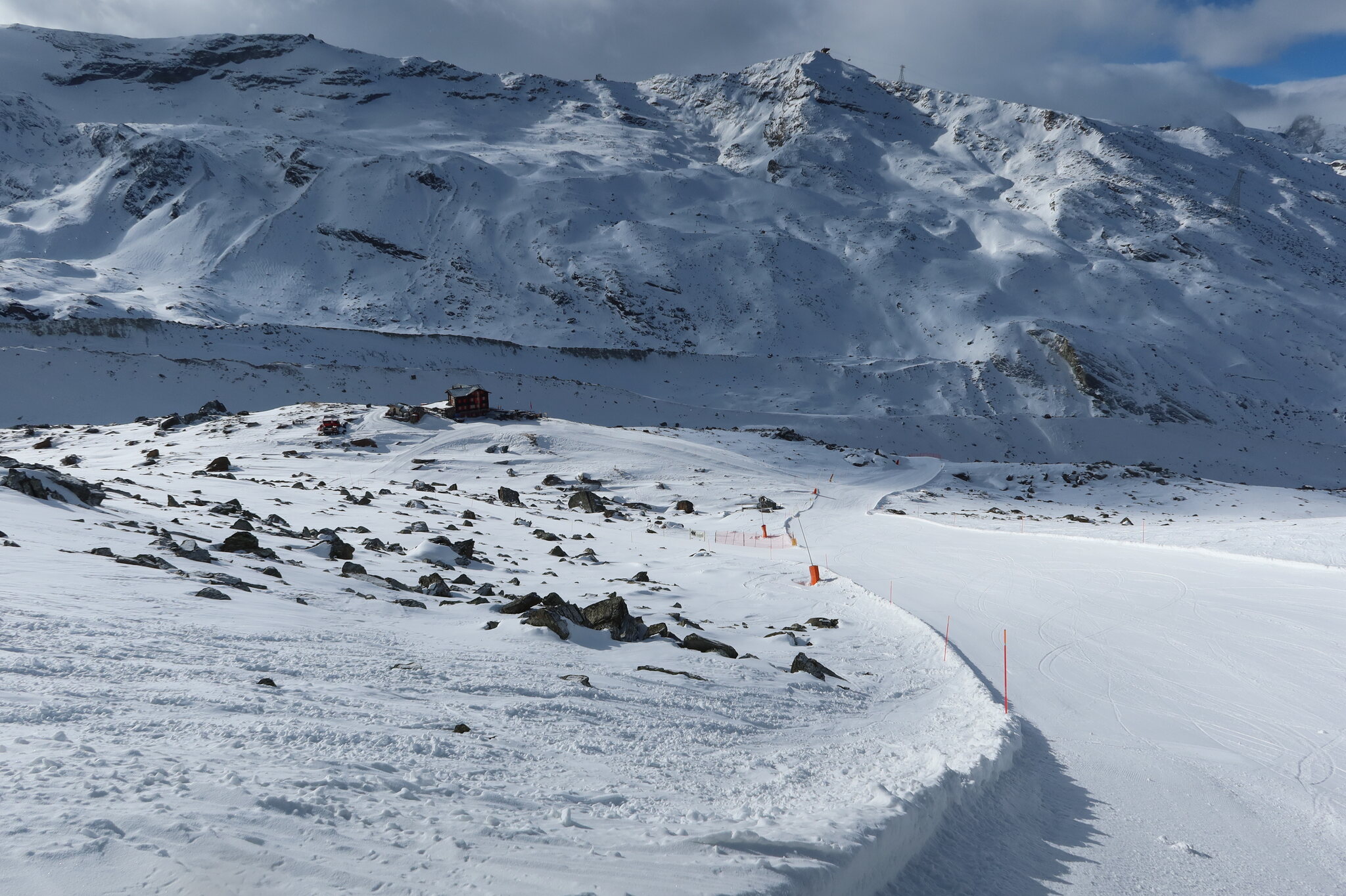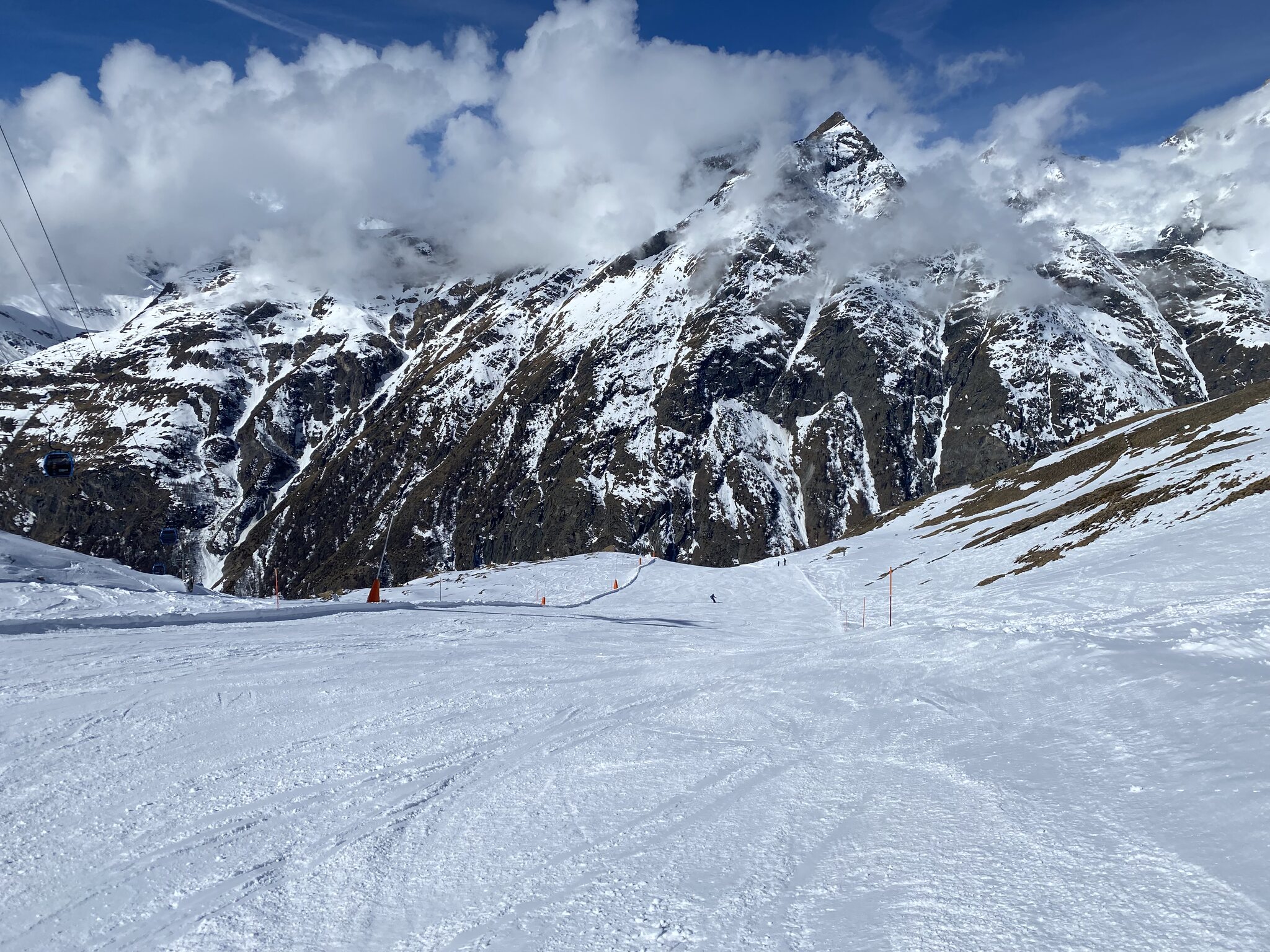 Heute war es andersherum als gestern: Das Wetter war bis 14 Uhr herum deutlich besser als vorhergesagt und Italien war offen. Ich hatte dann das Glück meistens in der Sonne abzufahren und im Lift das schlechtere Wetter zu übergehen. Vormittags war allerdings der Cretaz defekt und so bin ich einmal nach Valtournenche, dann zum Cieloalto und noch etwas zum Pancheron und wieder laufenden Cretaz. Eigentlich wäre es sinnvoll gewesen vor Italien zur endlich offenen Roten Nase zu fahren, aber das habe ich zu spät gemerkt und war schon zu weit gen Klein Matterhorn, um mal schnell umzudrehen.