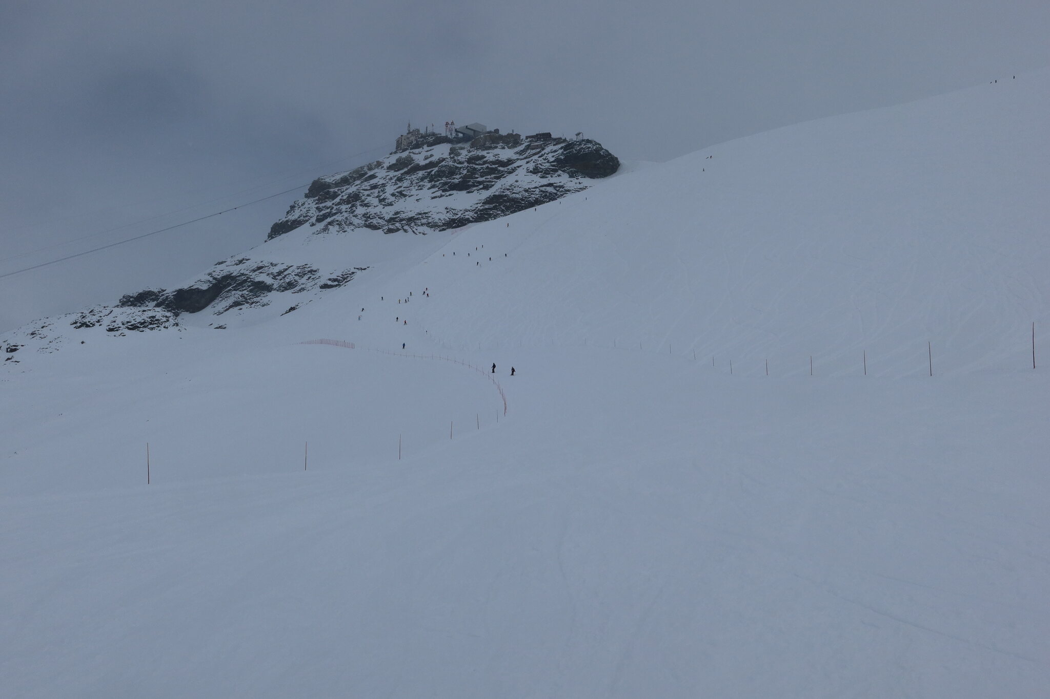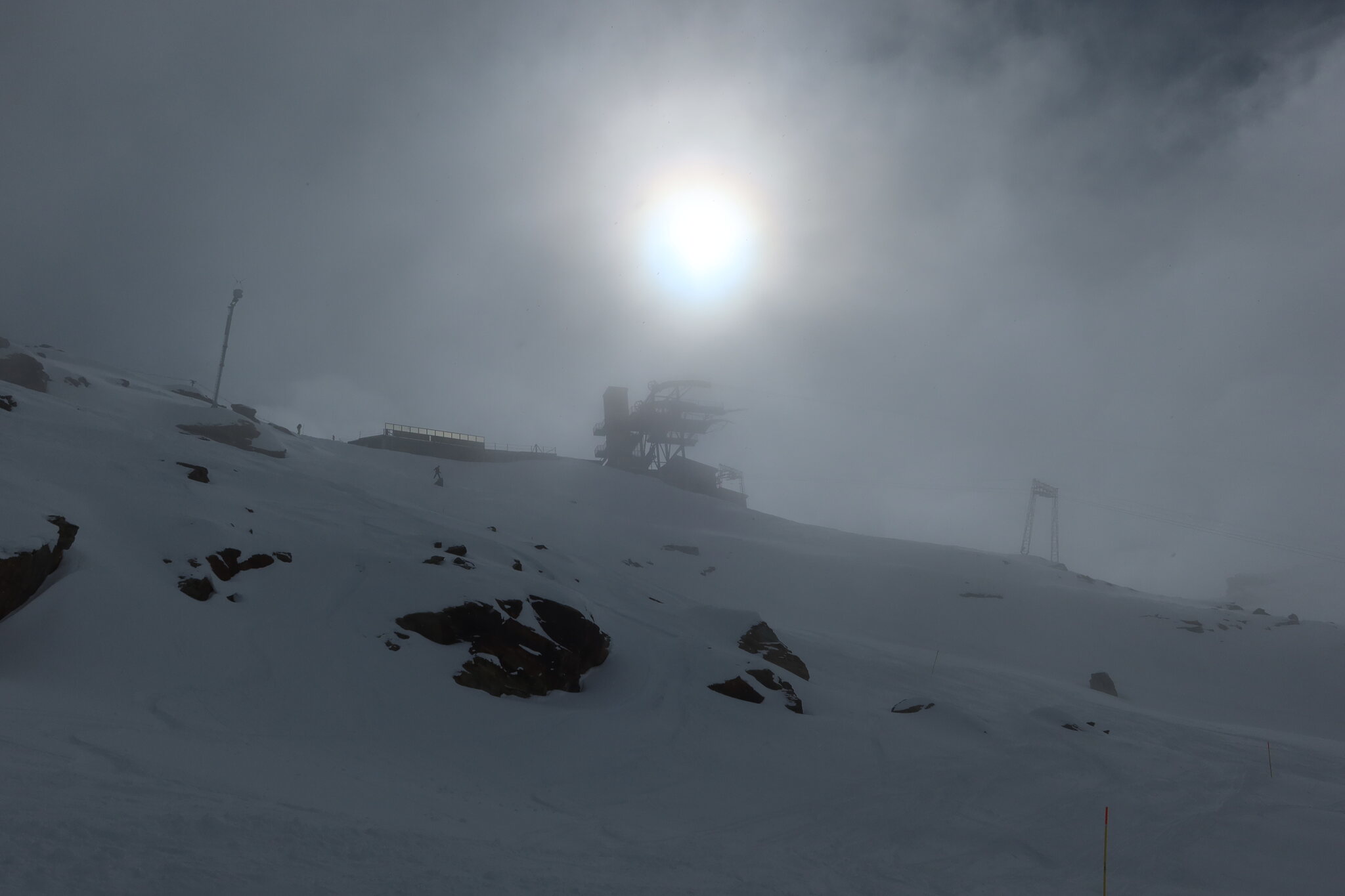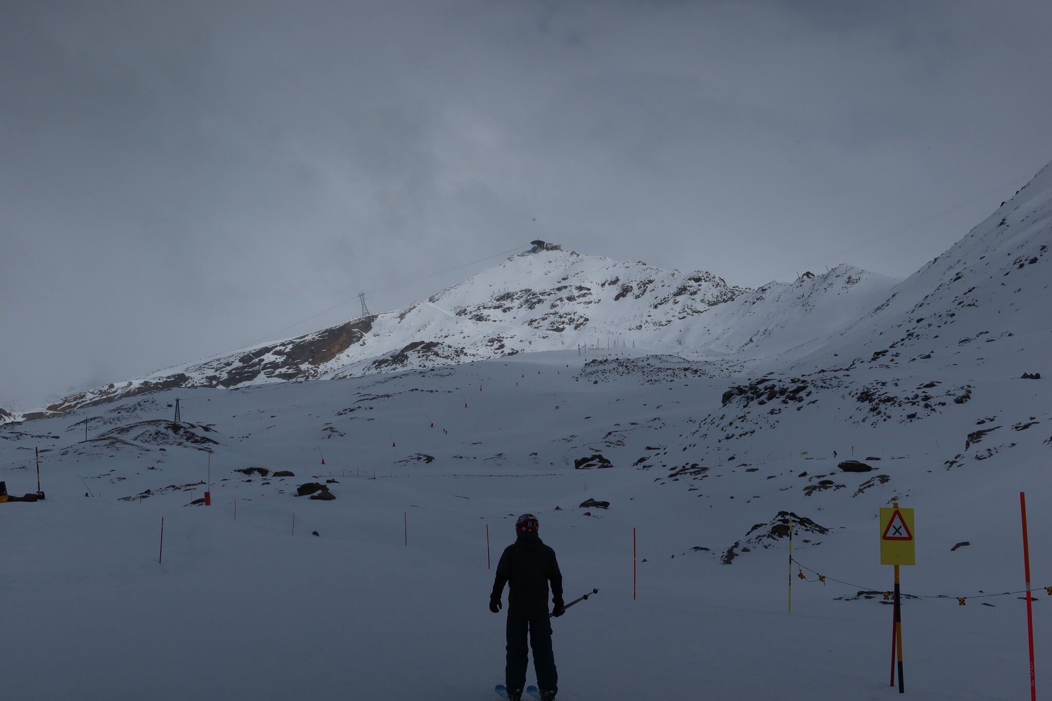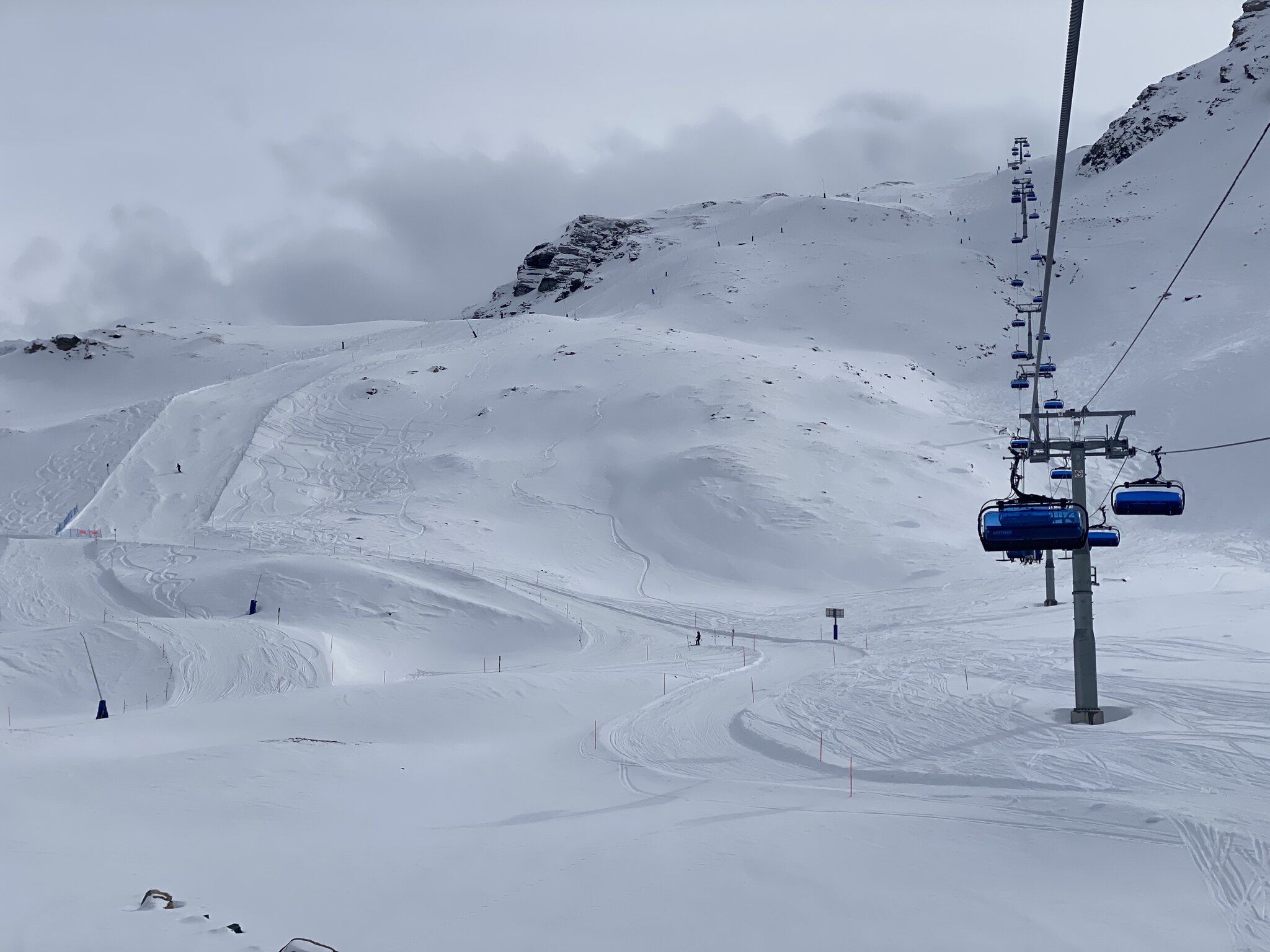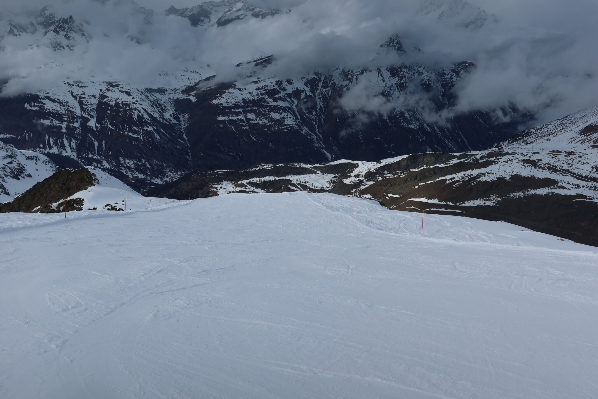 Als das Wetter schlechter wurde bin ich zurück nach Zermatt in der Hoffnung, noch bei brauchbarer Sicht an der Roten Nase fahren zu können. Einmal ist mir das gelungen, da sich die Sonne noch am längsten am Hohtälli gehalten hat. Beim zweiten Anlauf hat die Pendelbahn dann leider den Dienst quittiert und war nach absoluter Schleichfahrt zurück zum Hohtälli trotz gut hörbarem Einsatz von schwerem Werkzeug durch den Maschinisten nicht mehr vor Beriebsschluss zum laufen zu bringen.