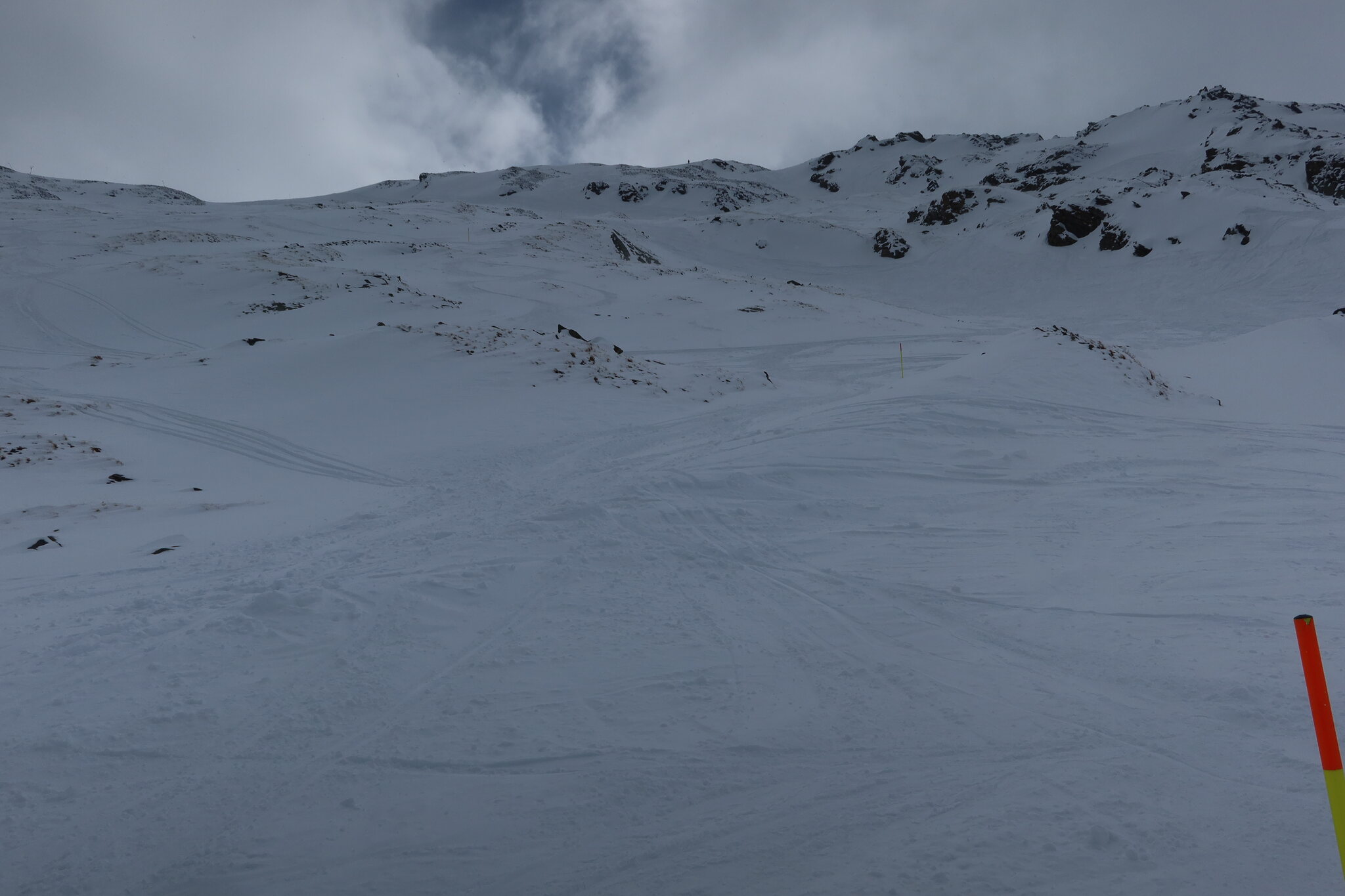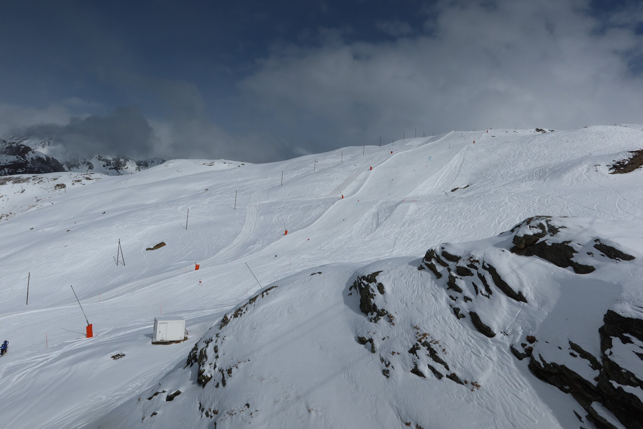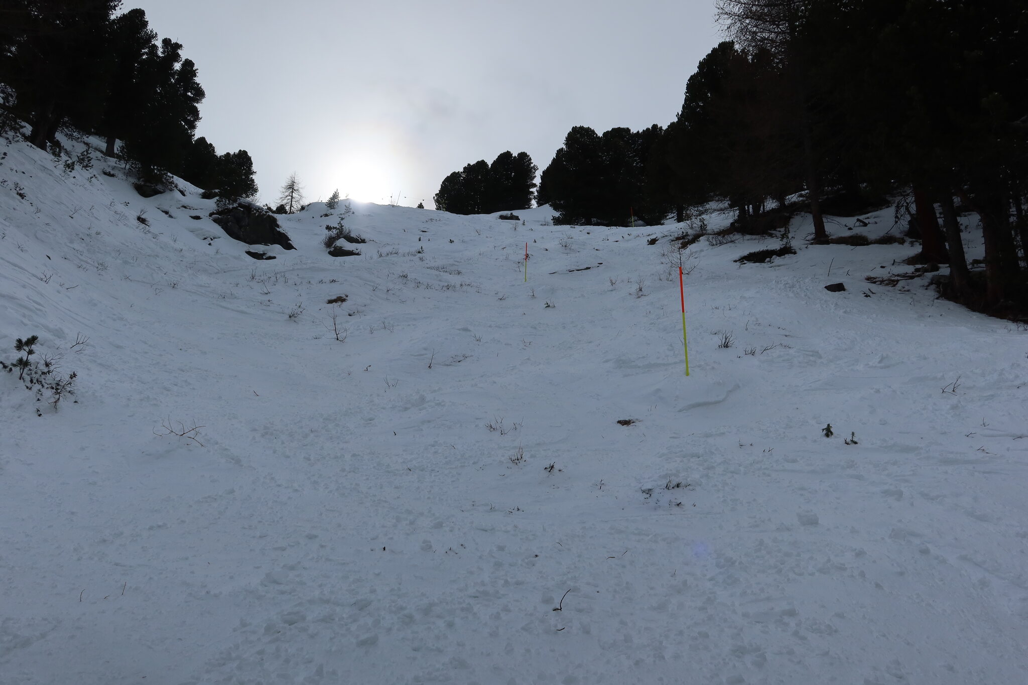 Immerhin konnte ich so wenigstens einmal die Route von der Roten Nase fahren. Entlang der ausgesteckten Markierung ließ es sich gut fahren und bis auf an einer offensichtliche Engstelle waren Steine kein Problem. Gestern hatte mir der verantwortliche Patrolleur das aber auch so beschrieben.