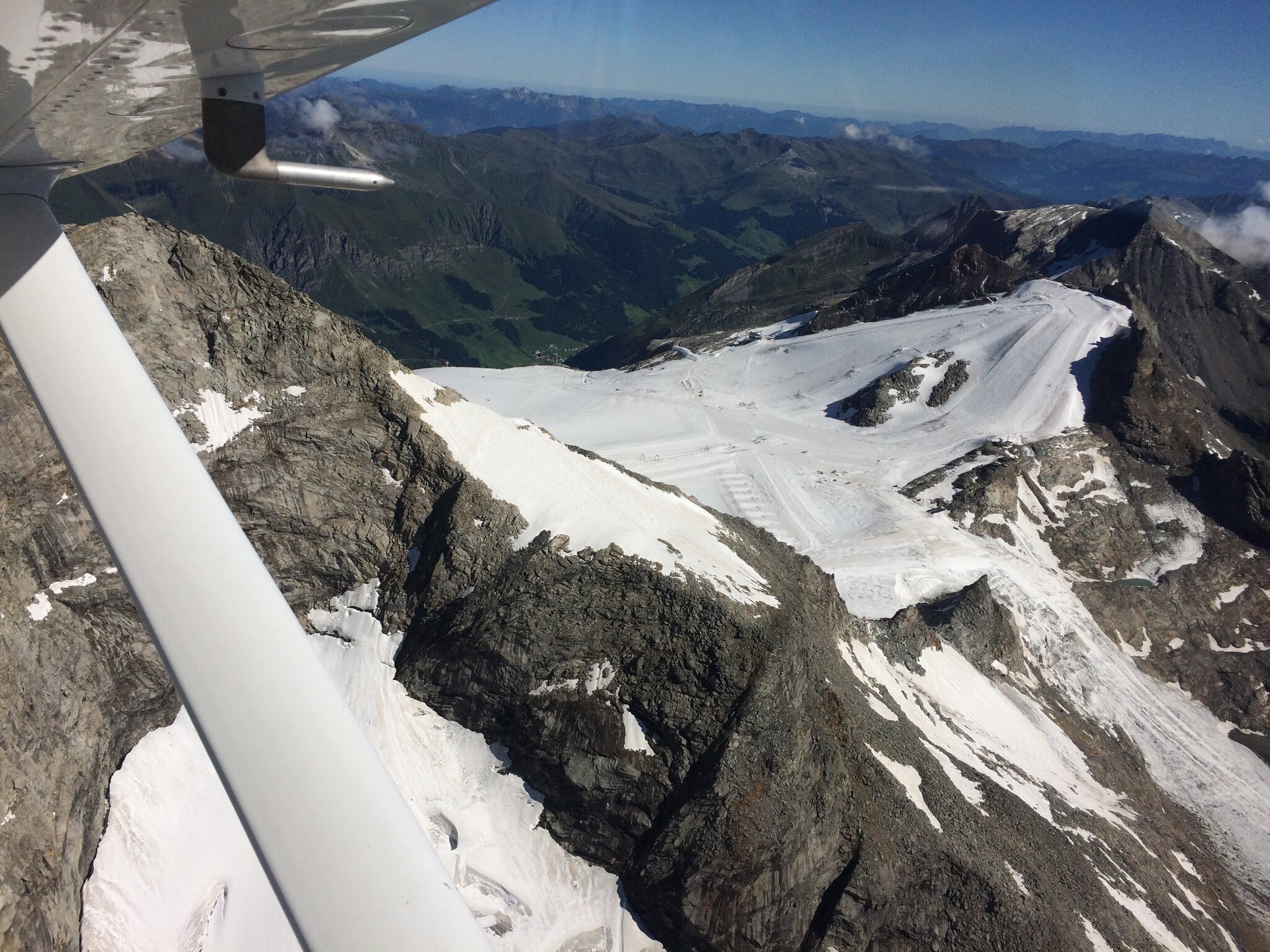 Wenn man ein paar Jahre weiter denkt ahnt man dass die Verbindung in Höhe Gletscherhütte - Felsinsel irgendwann abreisst. Und die obere Ecke Richtung DSB wirkt auch nicht für die Ewigkeit. Ob der Gipfel ohne Gletscher vernünftiges Skigelände ist...?