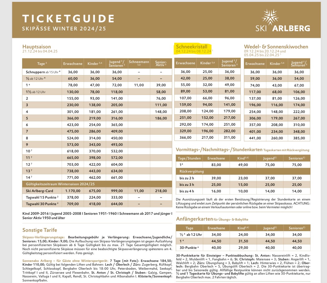 Hier die Preise für 2024/25 am Arlberg. Tagespass ist auf 78€ gestiegen.