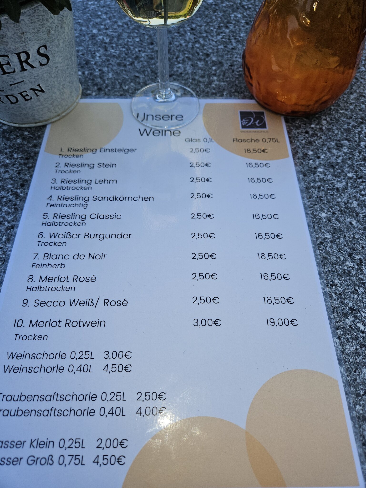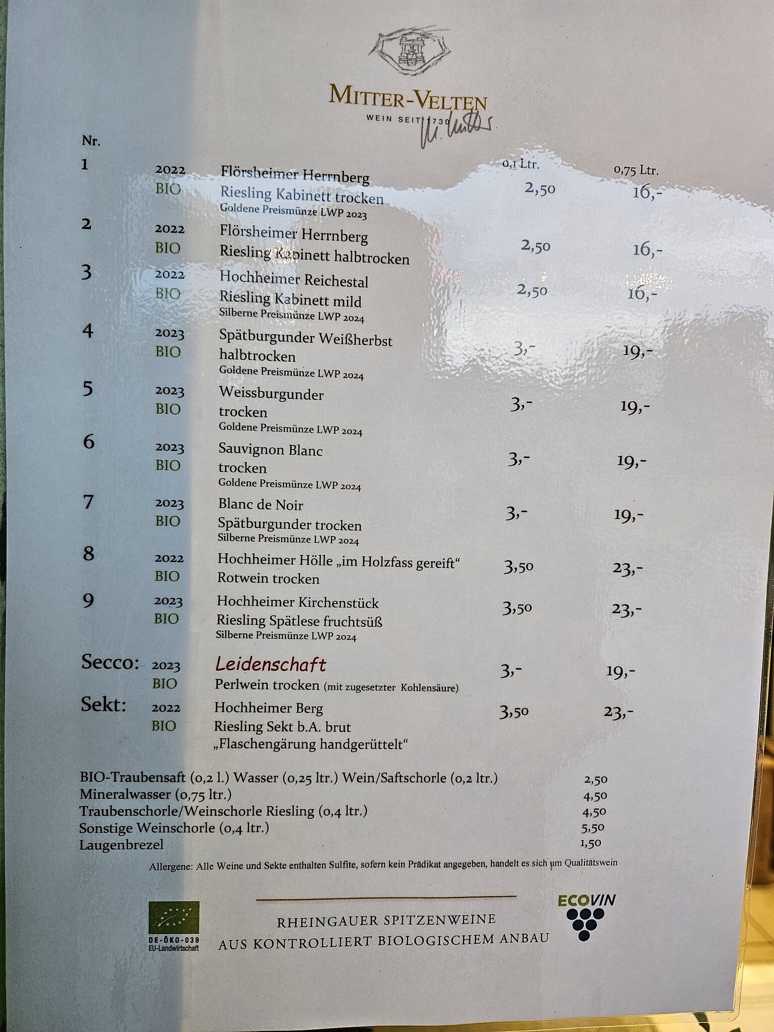Edit: Nachdem ich von der Weidenmühle (Allendorff) in den letzten Jahrzehnten eher enttäuscht als überzeugt war, zeichnet sich jetzt auch hier ein Silberstreif am Horizont ab. Der Junior ist jetzt der Chef im Ring und vor allem der Riesling Trocken "Stein" und der zusätzlich ausgeschenkte Wickerer Riesling Trocken "Mainwerk3" aus dem Jahrgang 2023 wussten durchaus zu überzeugen. Ok, der "Einsteiger" aus 2022 und der Weißburgunder waren eher flach, aber die beiden Anderen zeigten Potenzial, vor allem wenn man bedenkt, dass auf der Weinpreisliste kein Wein mehr als EUR 8 kostet👍
