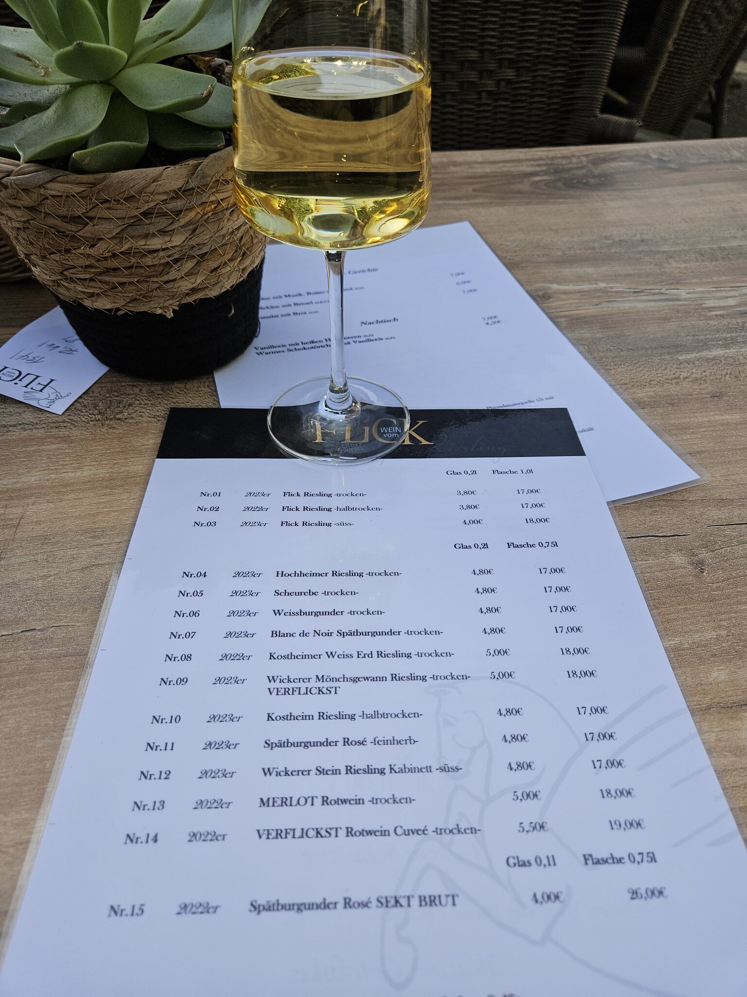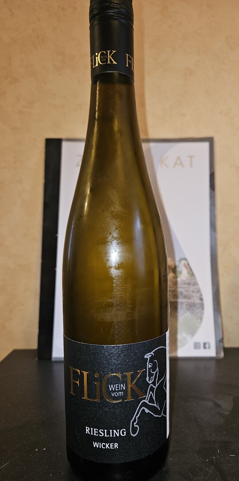 Im Glas 2023 Wickerer Riesling Trocken mit 12,5 Vol% von Peter Flick. Kann gut sein, dass dort auch Trauben aus dem Patenweinberg im Mönchsgewann drinne sind; auf jeden Fall finden sich sowohl Wickerer Stein als auch Mönchsgewann dort drinne wieder.