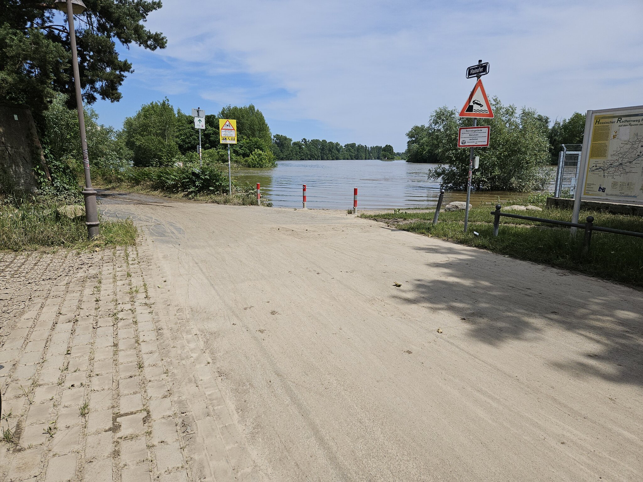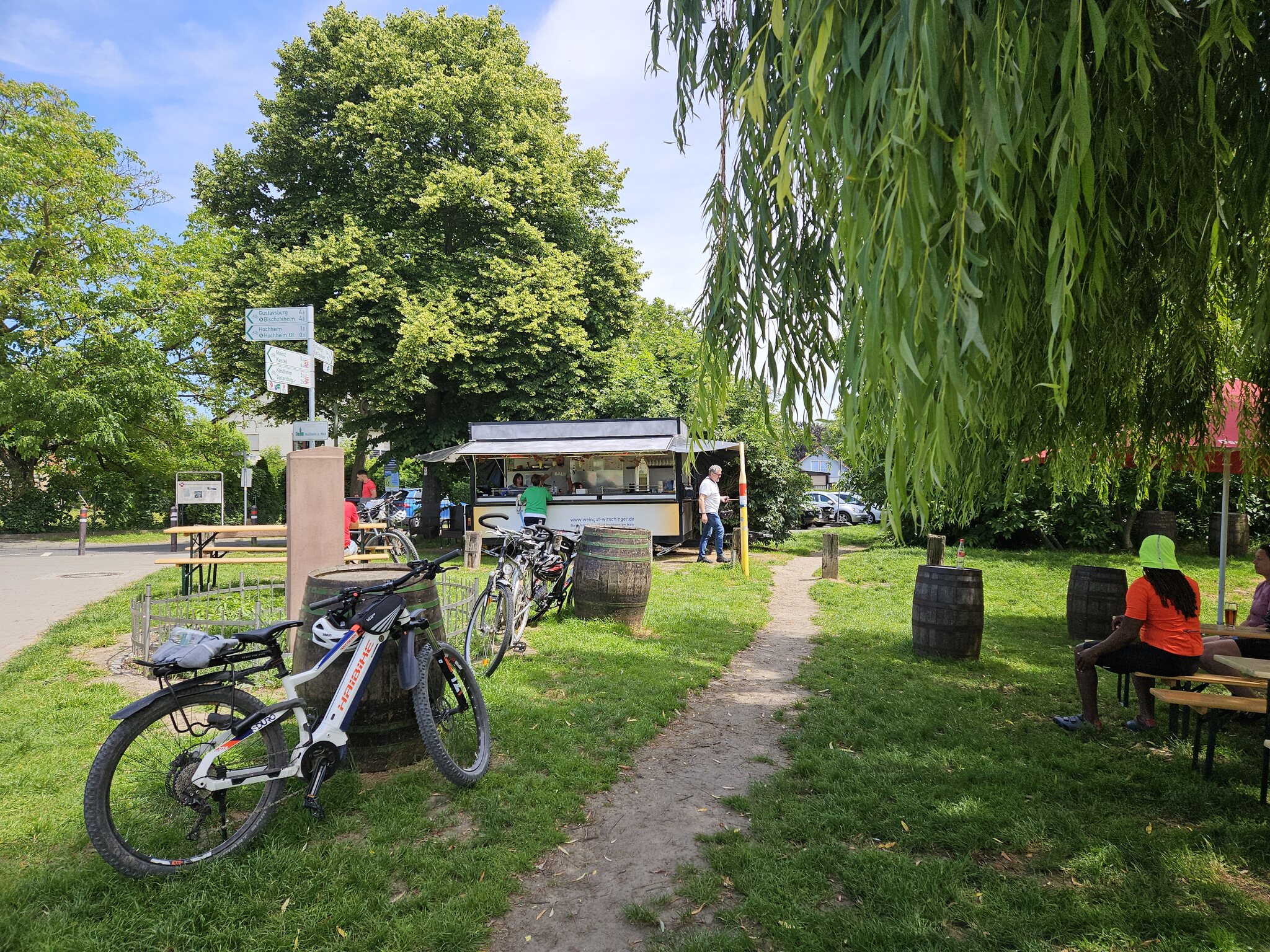 Start um 13:20 in Flörsheim und erste Trinkpause am Weinstand am Hochheimer Mainufer.