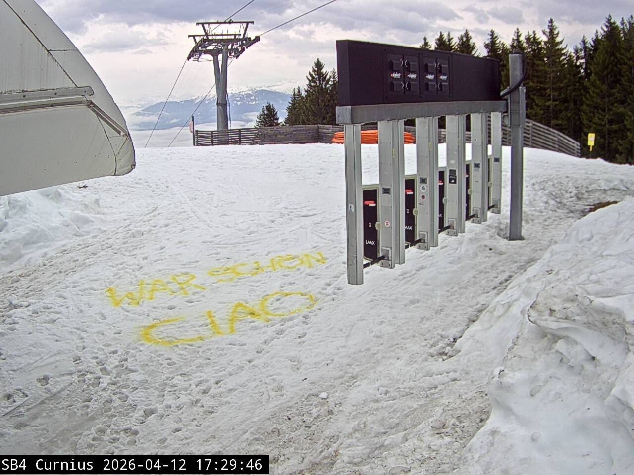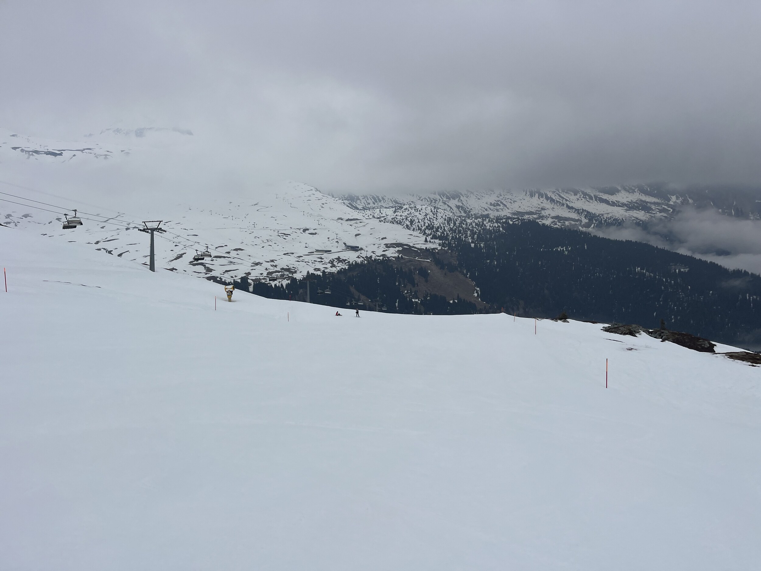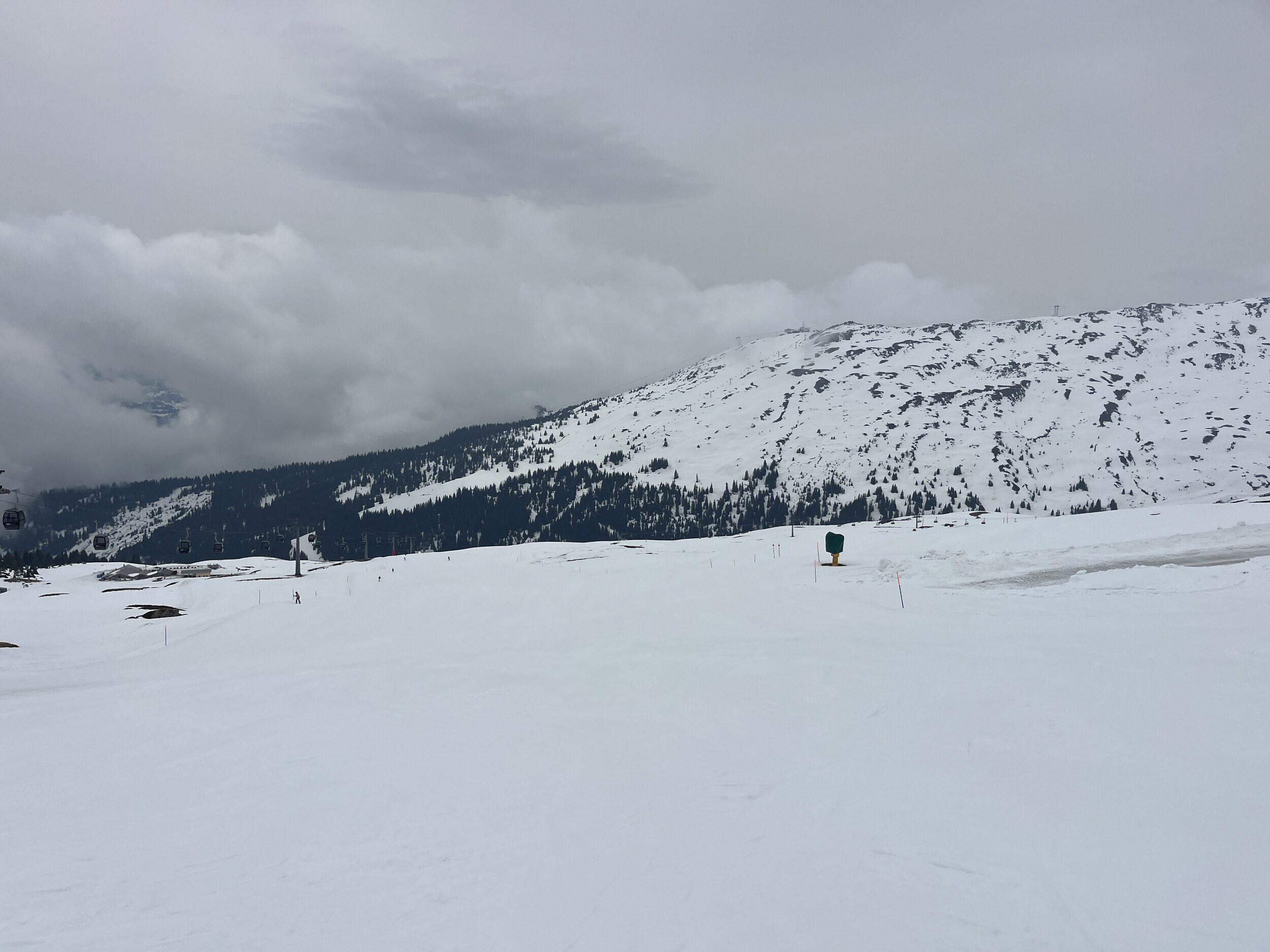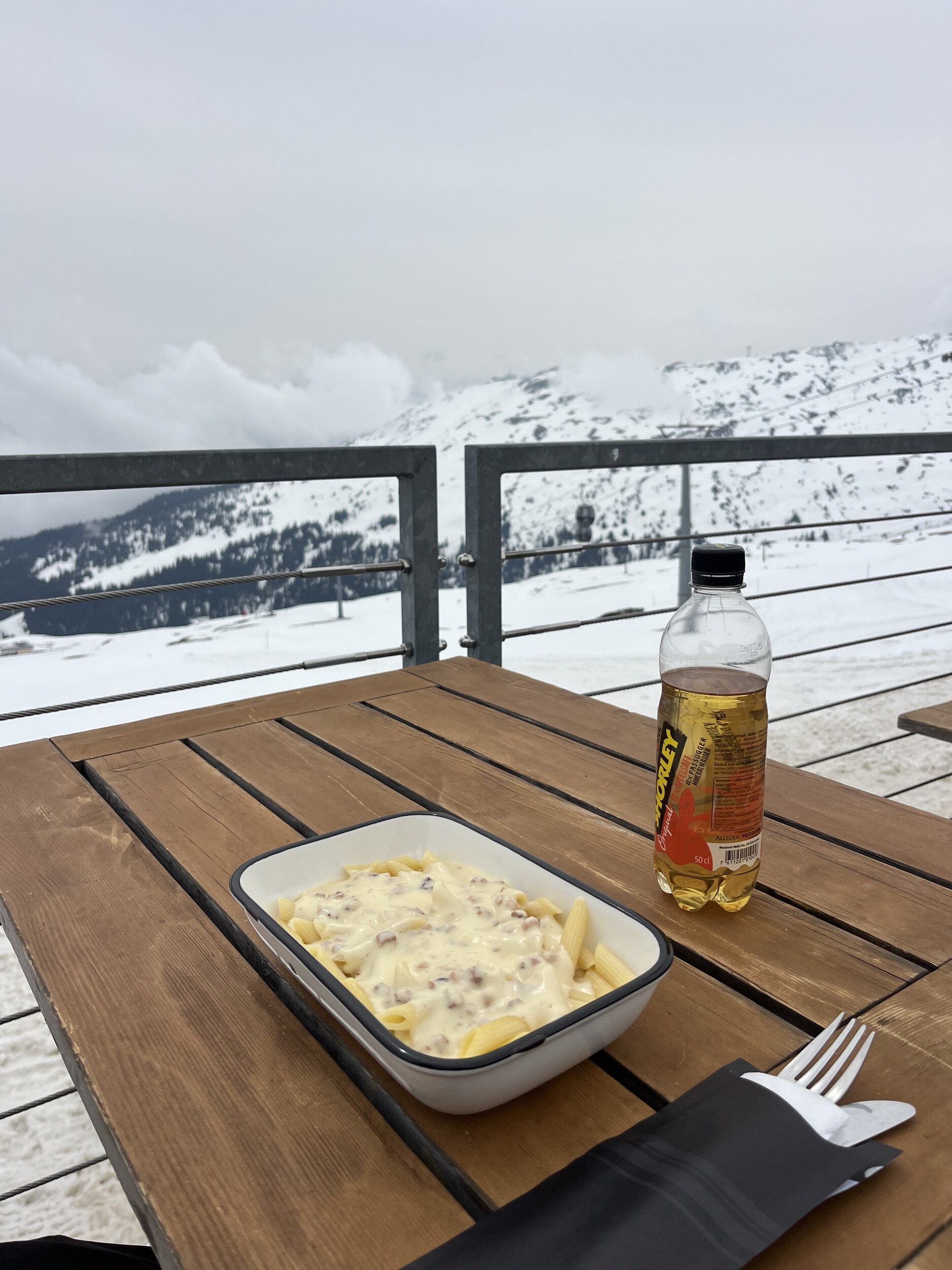 Der Nebel kommt und geht. Manchmal ist man auf La Siala drüber, mal drin: Ost ist meistens frei: Ein letztes Zmittag: Und dann begebe ich mich um 13.45 Uhr auf die Talabfahrt in diesem gespenstisch leeren Gebiet (1600 Eintritte) Das war’s dann mit der Berichterstattung von hier. Ich danke fürs Interesse und Mitlesen und wünsche einen guten Sommer.