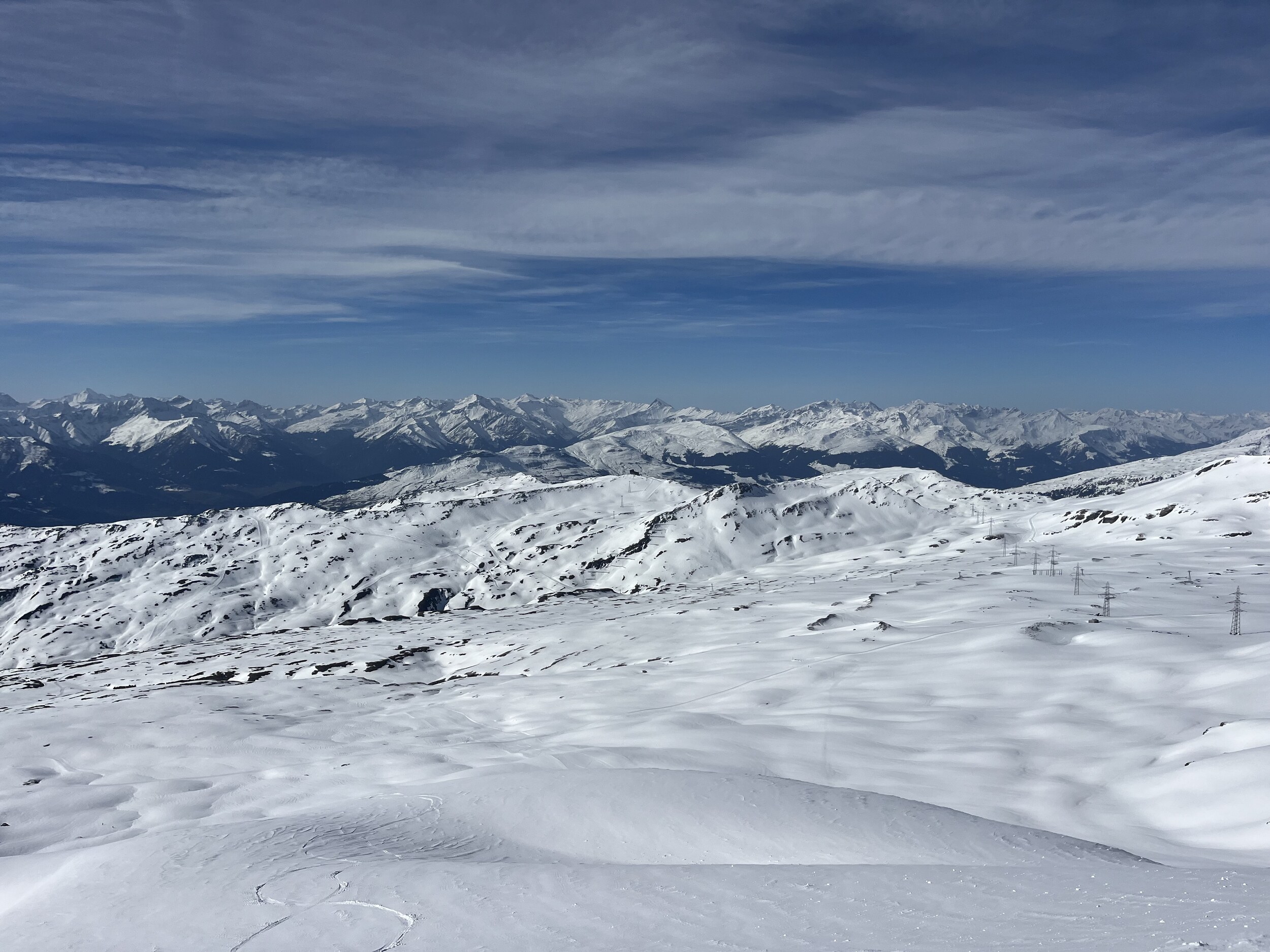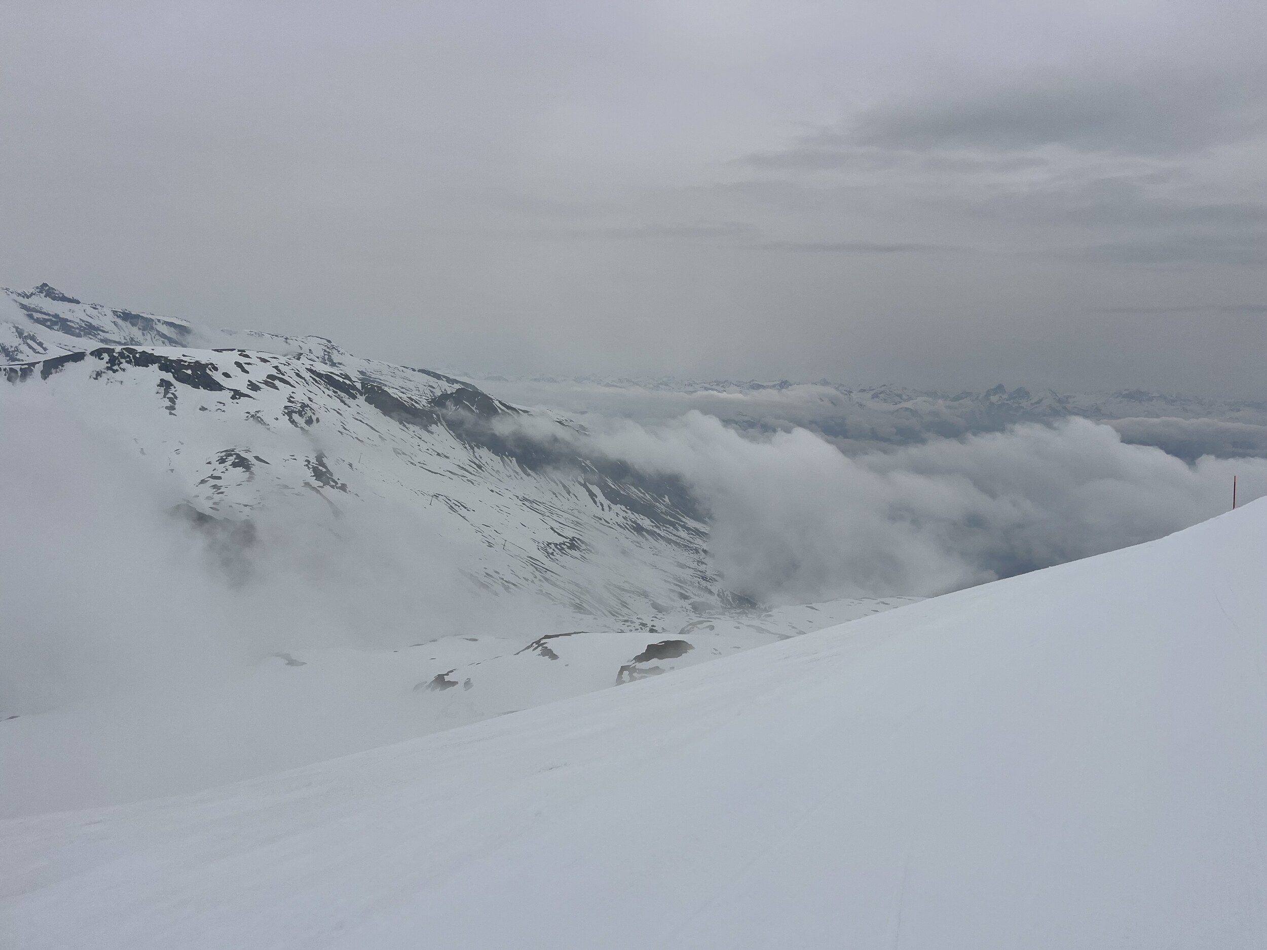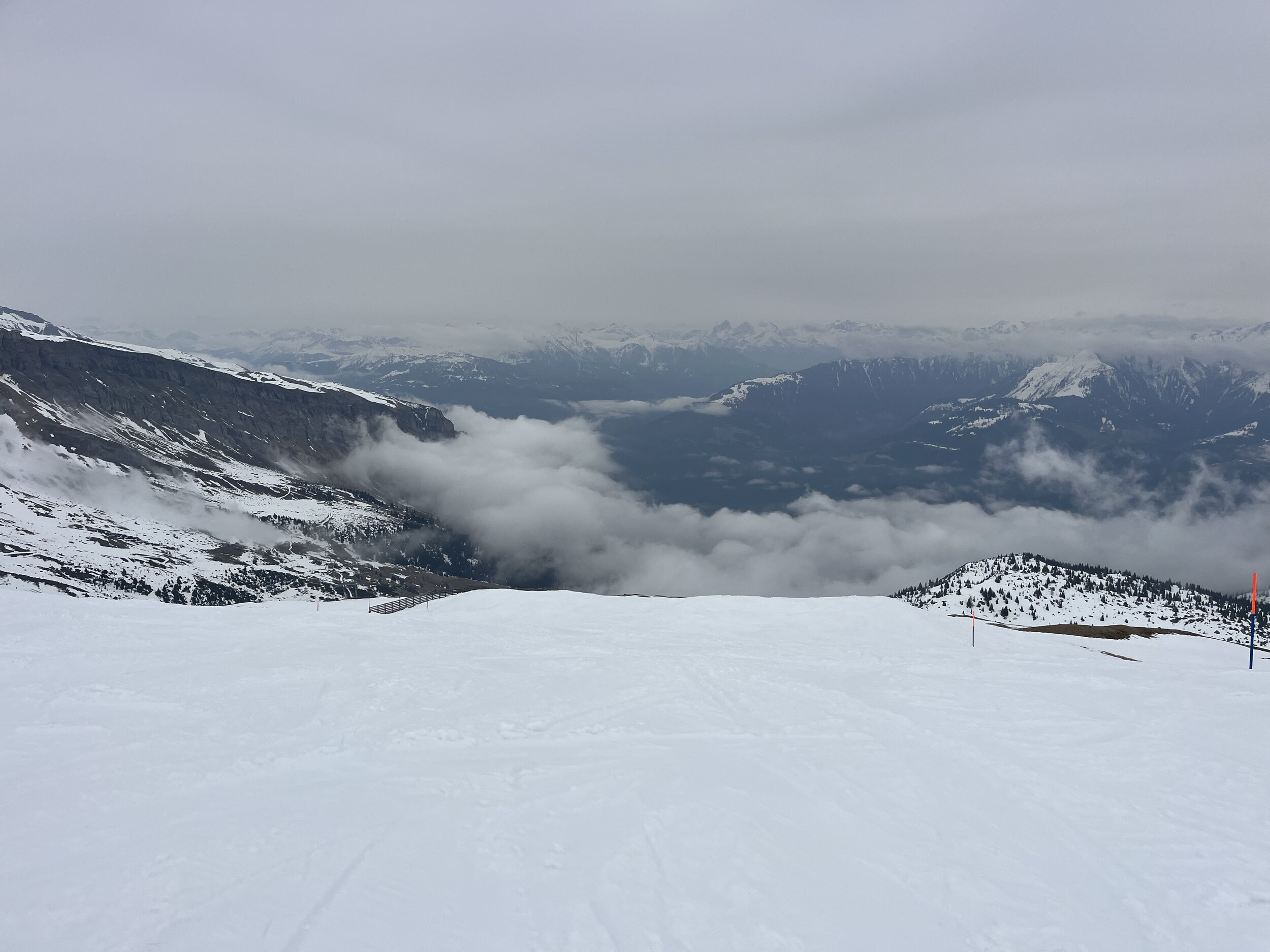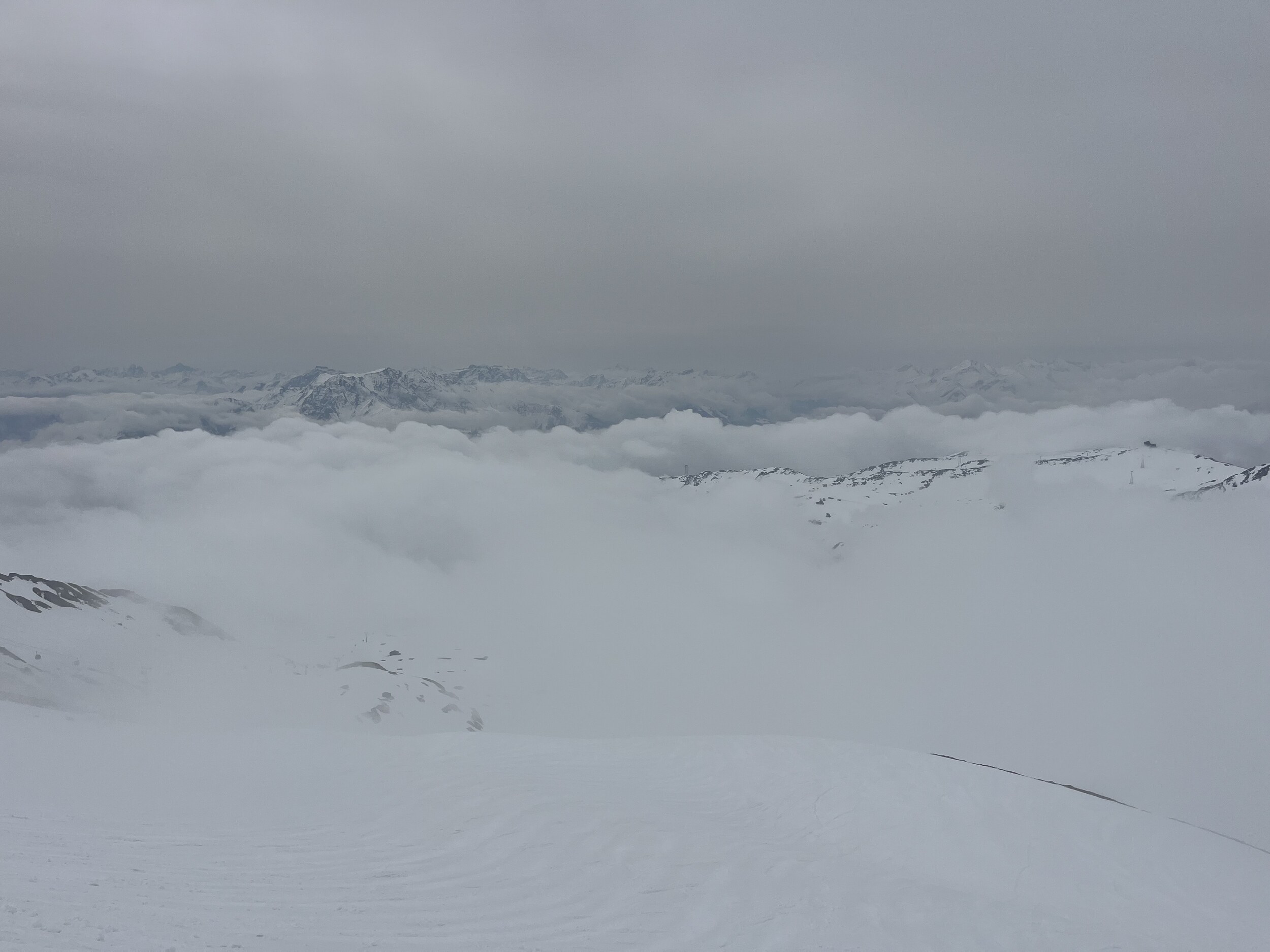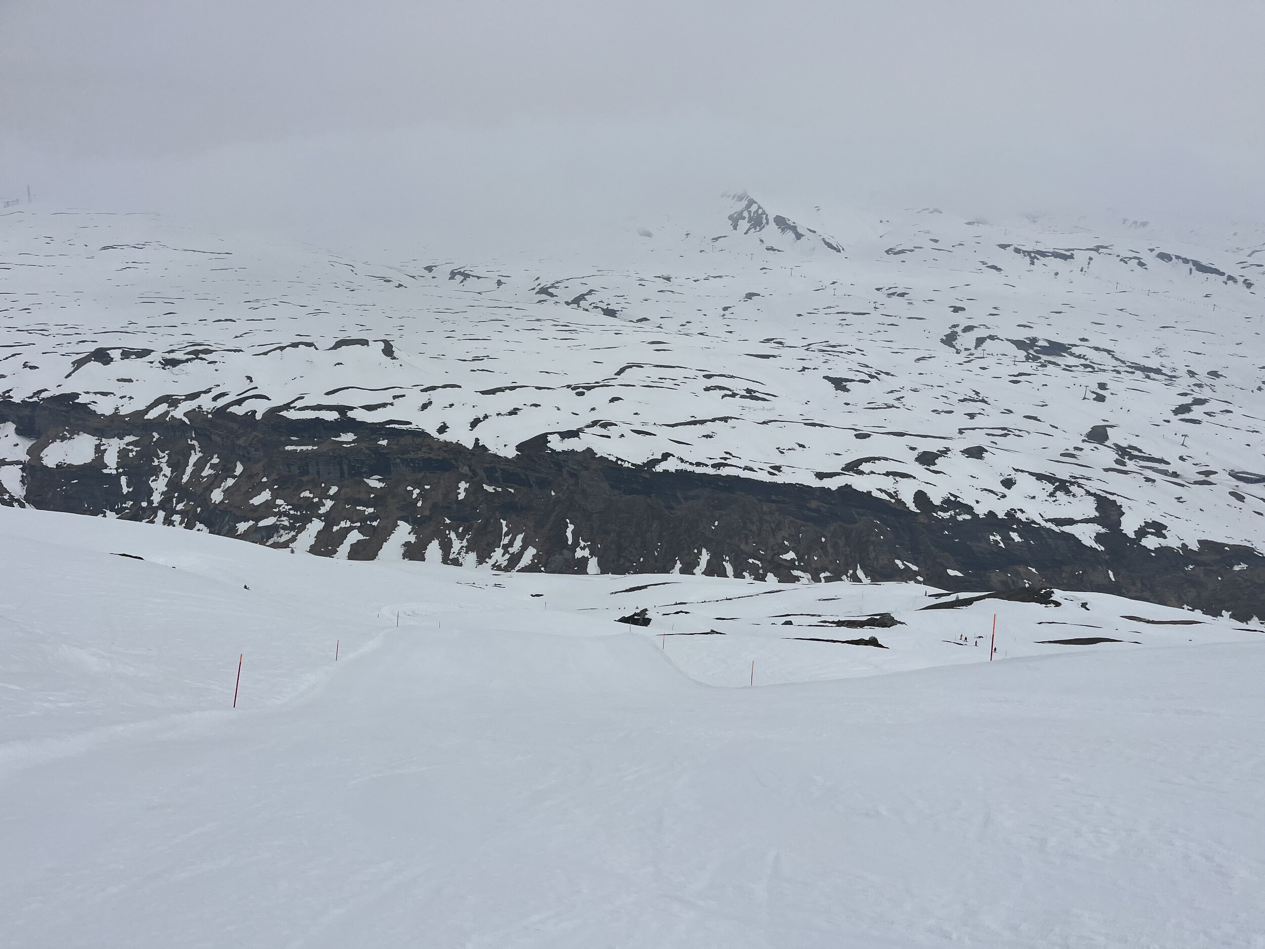 Der Nebel kommt und geht. Manchmal ist man auf La Siala drüber, mal drin: Ost ist meistens frei: Ein letztes Zmittag: Und dann begebe ich mich um 13.45 Uhr auf die Talabfahrt in diesem gespenstisch leeren Gebiet (1600 Eintritte) Das war’s dann mit der Berichterstattung von hier. Ich danke fürs Interesse und Mitlesen und wünsche einen guten Sommer.