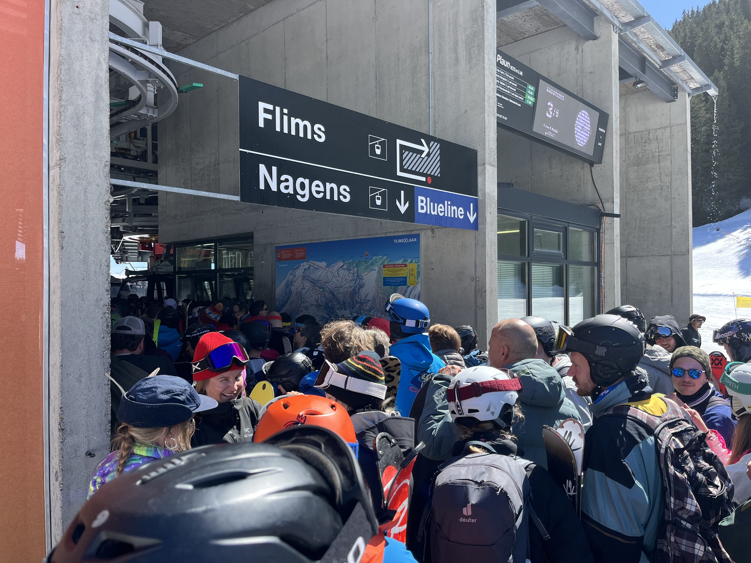 In Laax läuft die 12er Gondel nicht. Also anstehen an der LSB bis zum Volg oder nach Flims fahren
