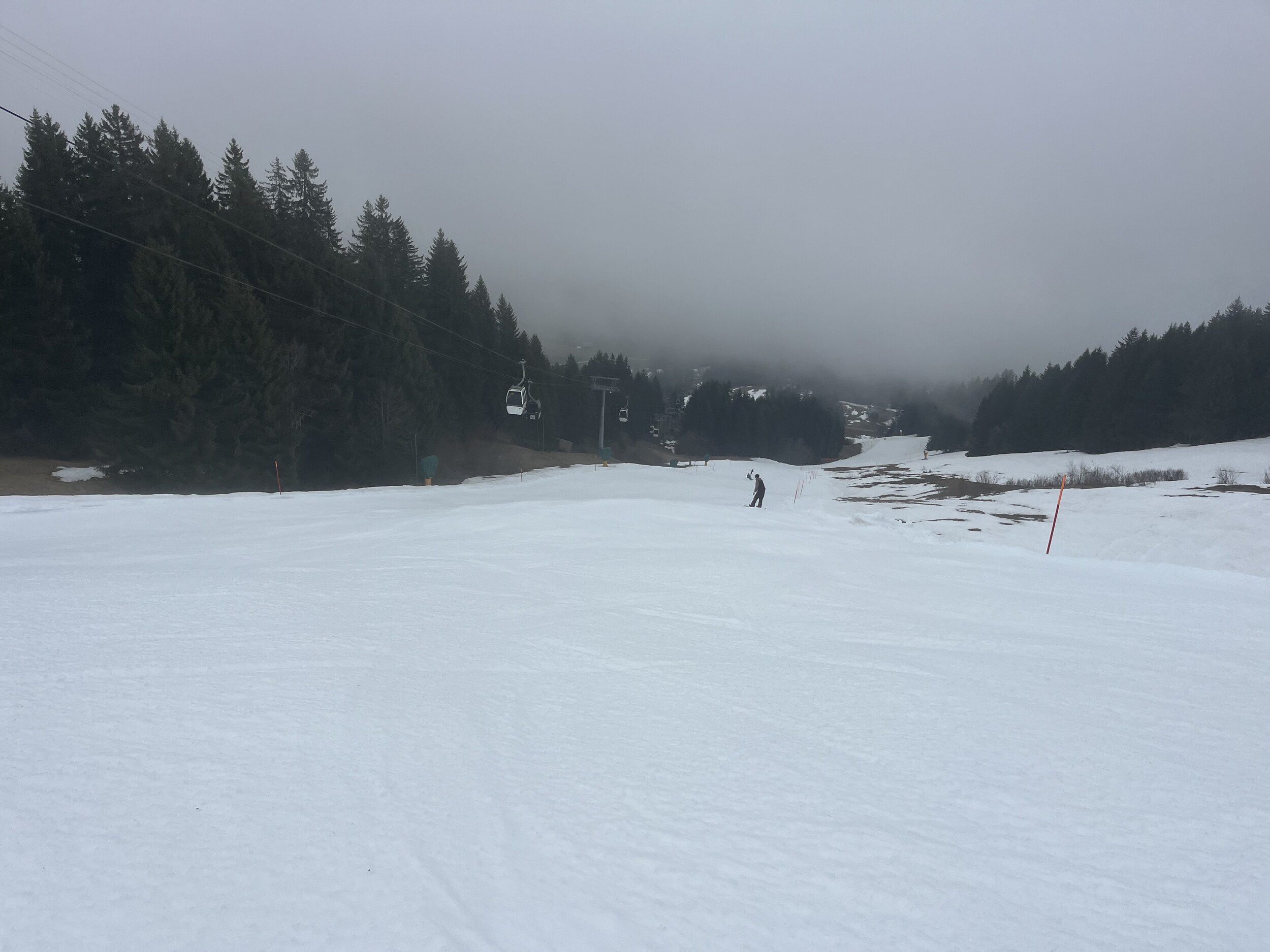 Zum Glück hat sich der Nebel der oberen Etage wieder aufgelöst. Die Sonne drückt, gute Bodensicht: Aber die Pisten bisher allesamt sehr schlecht präpariert. War wohl nicht ganz einfach bei dem schweren Sulz. Edit 13.30 Uhr: