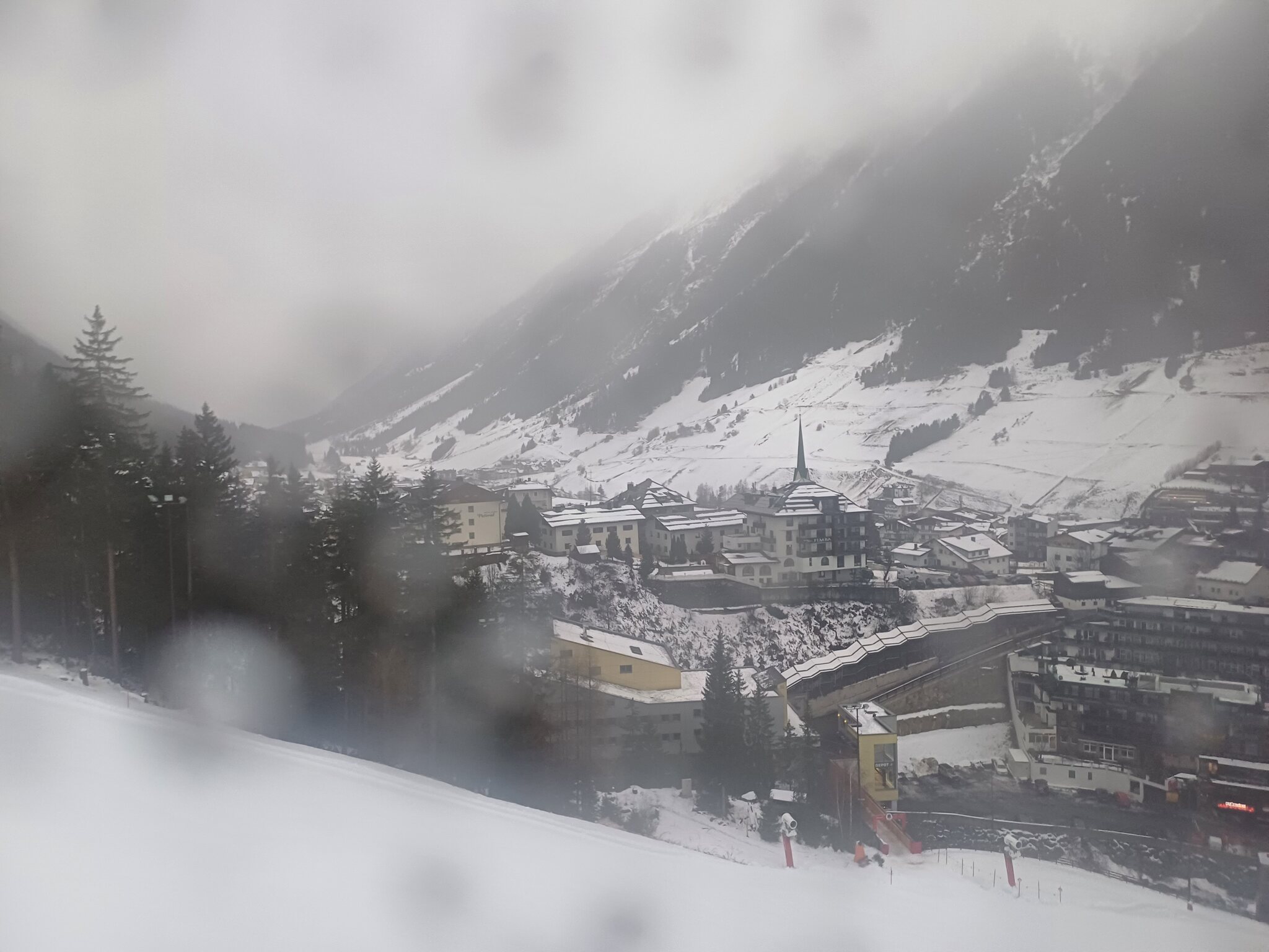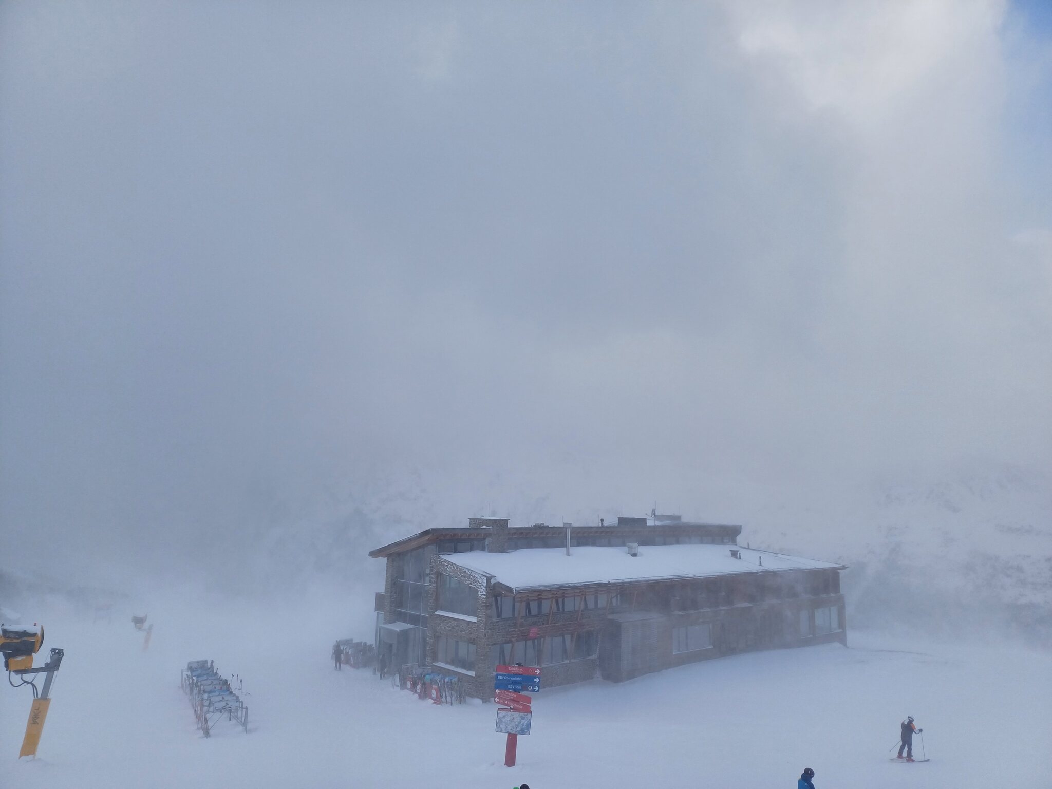 Es schüttet im Tal und oben starker Sturm mit eingeschränkten Skibetrieb.