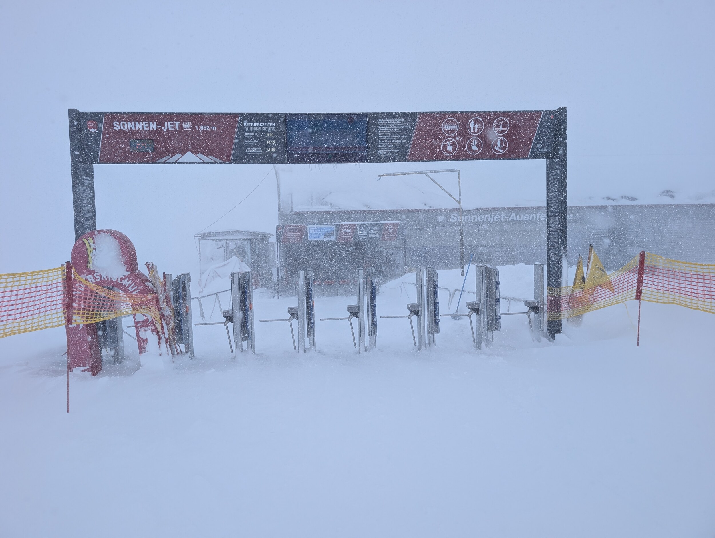 Es schneit die ganze Zeit, und die Sicht ist zeitweise ziemlich problematisch, sogar am Sonnen-Jet.