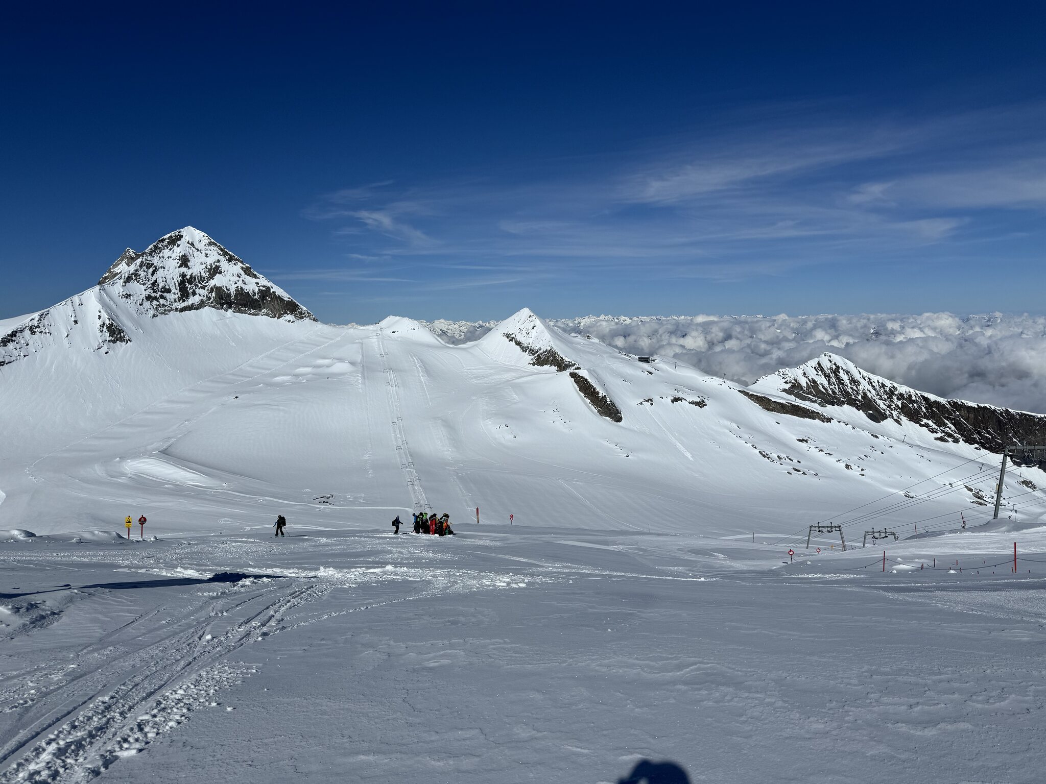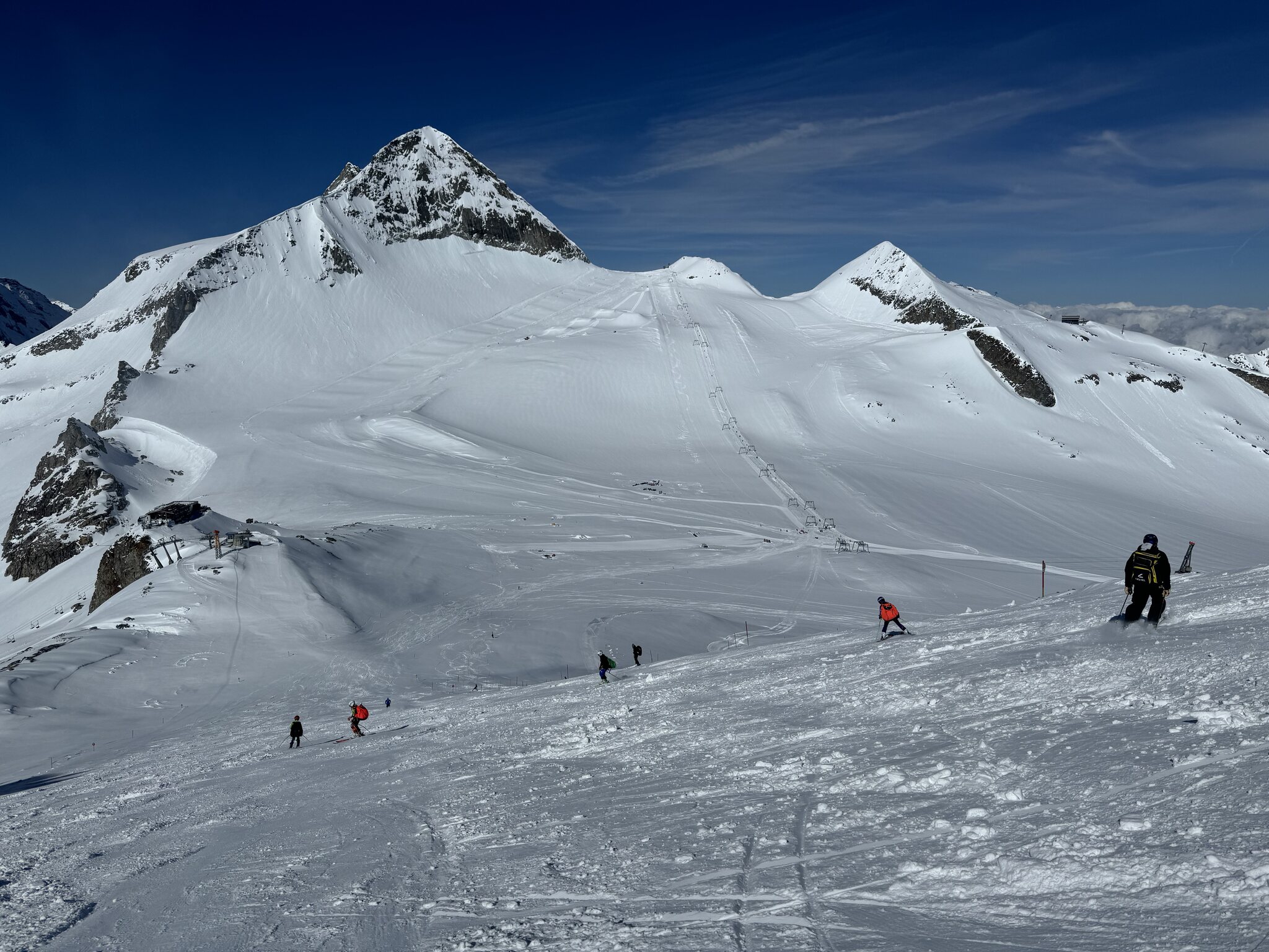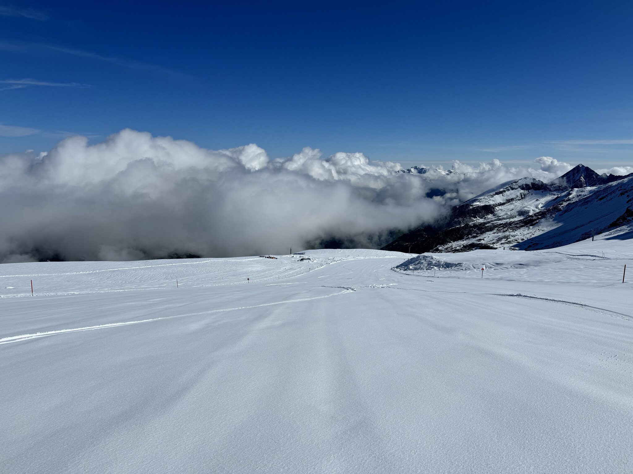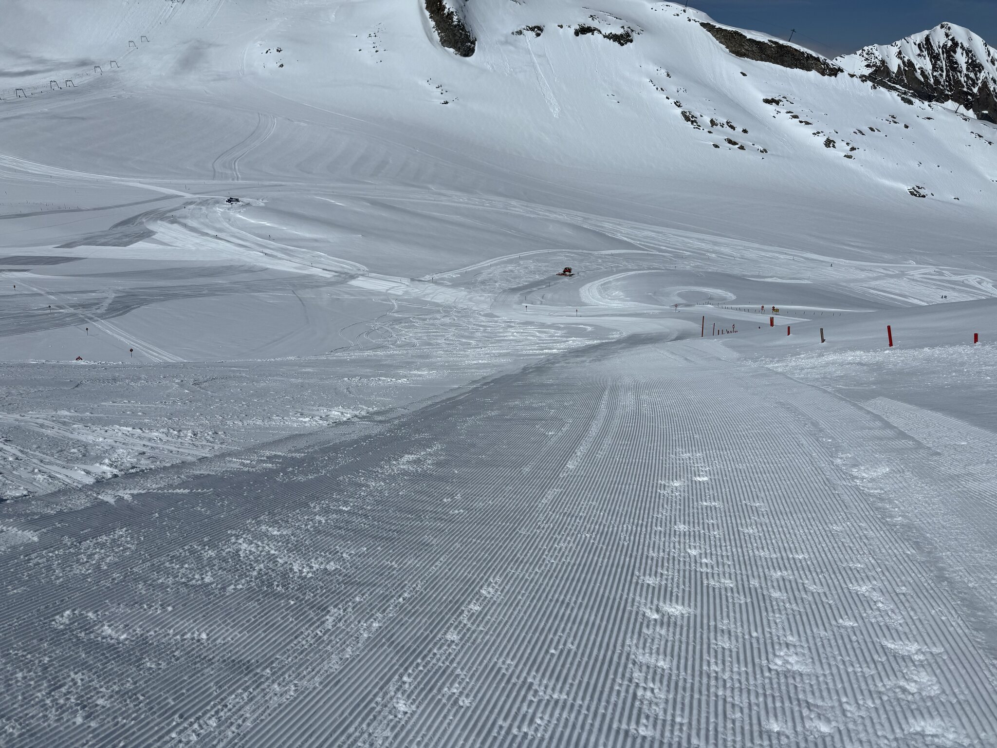 Oben Kaiserwetter, entgegen den Vorhersagen keine Wolken. Leider eine 3cm feuchte und schwere Neuschneeschicht auf der harten Piste.
