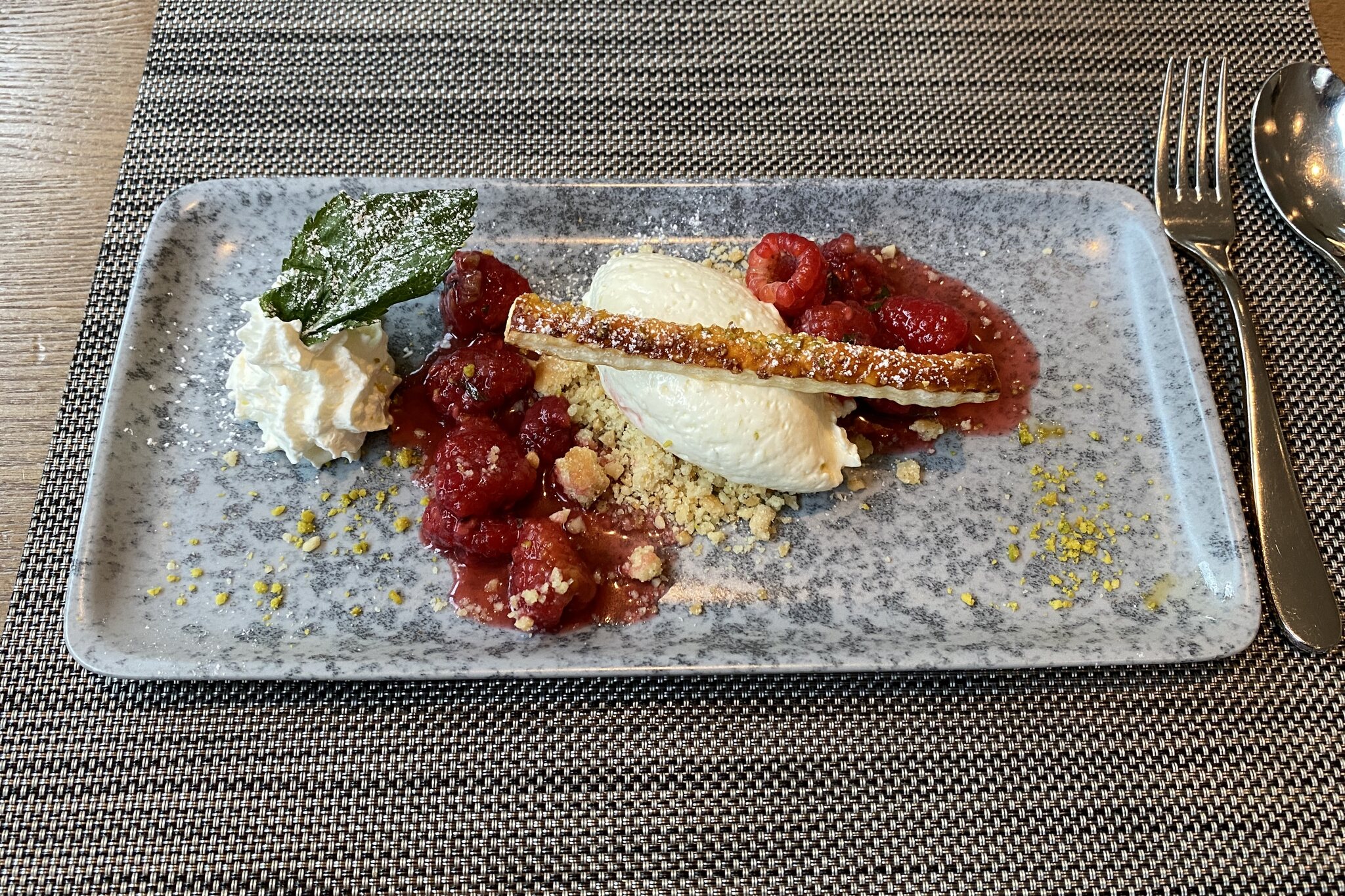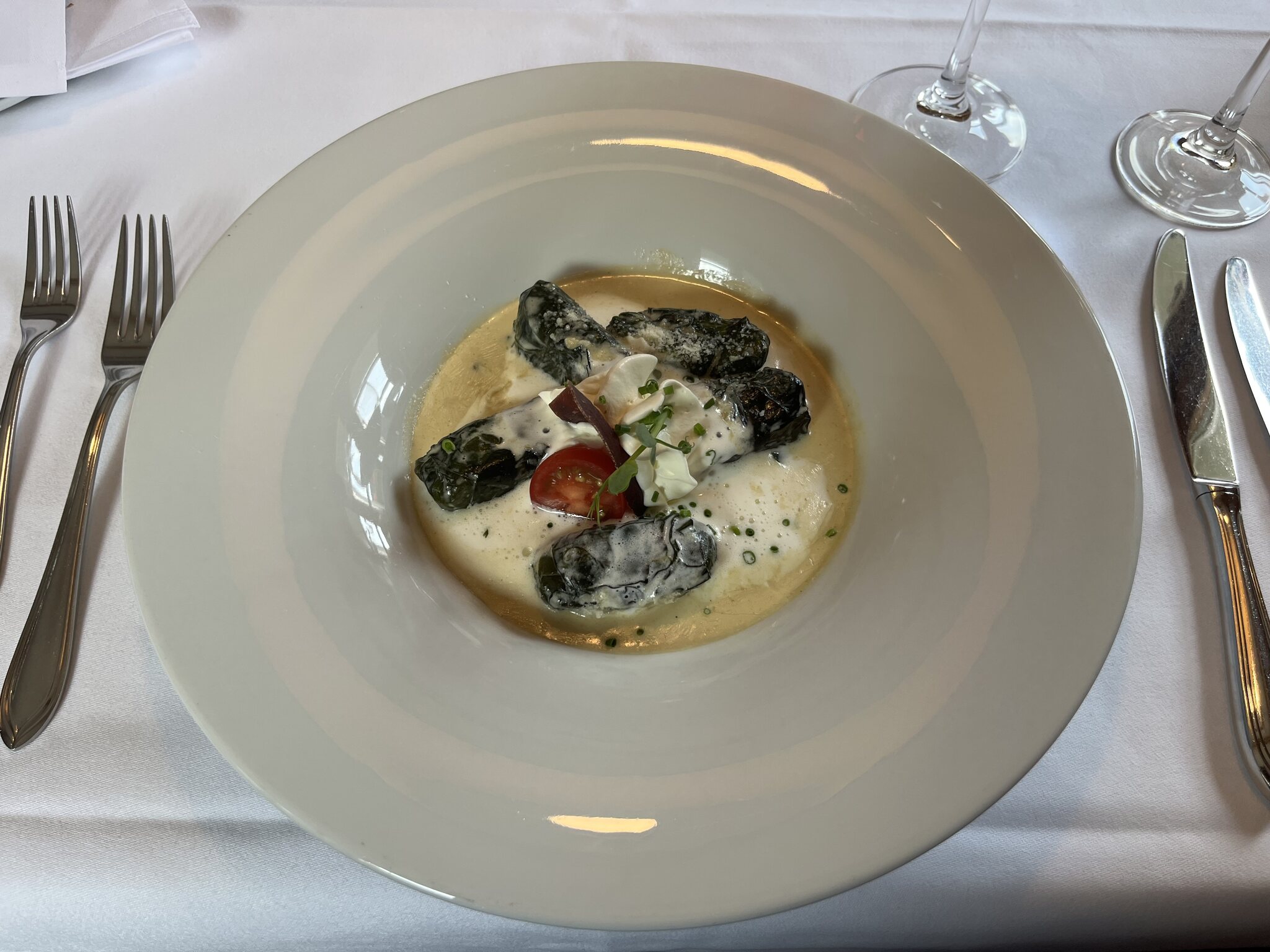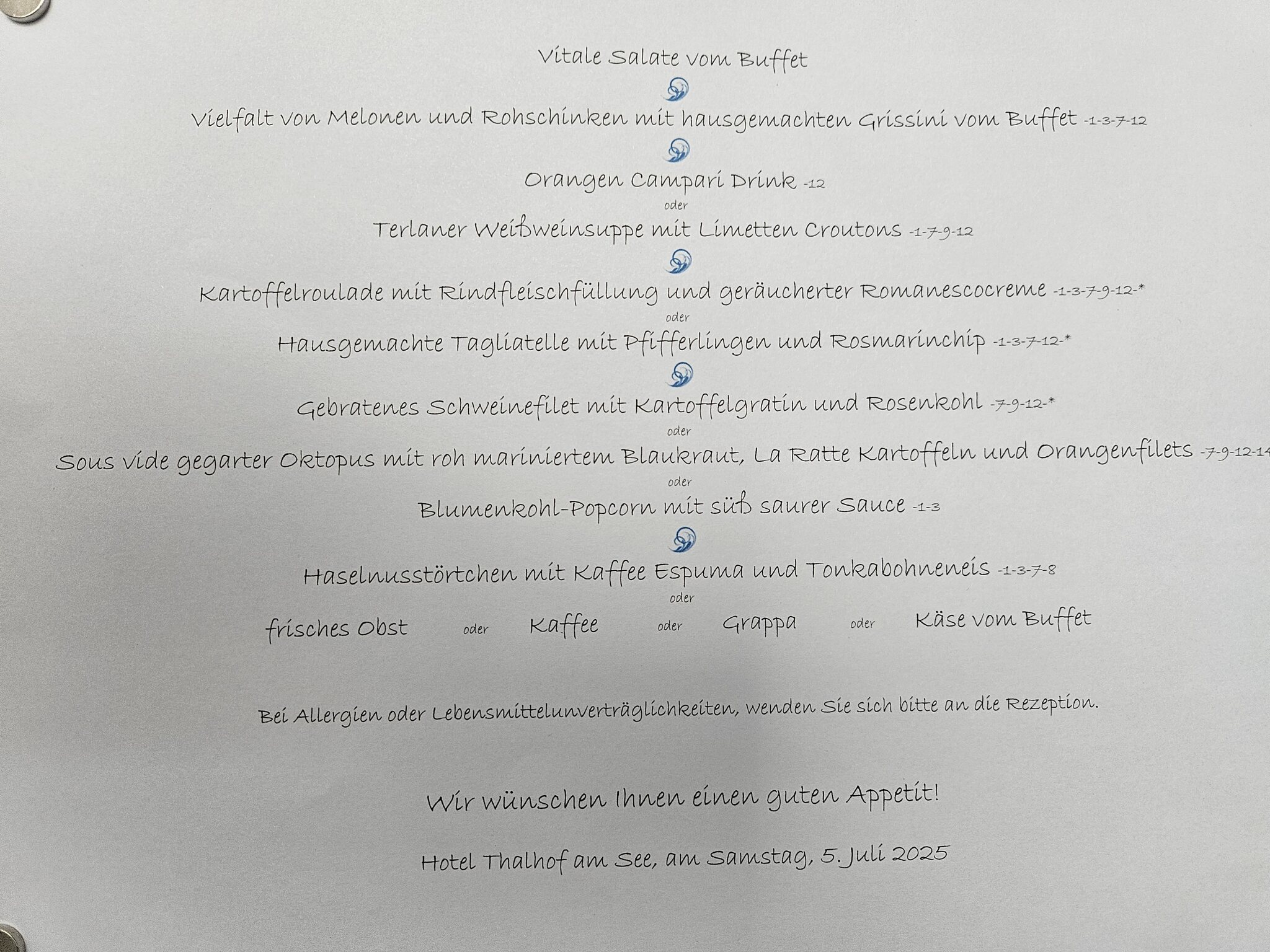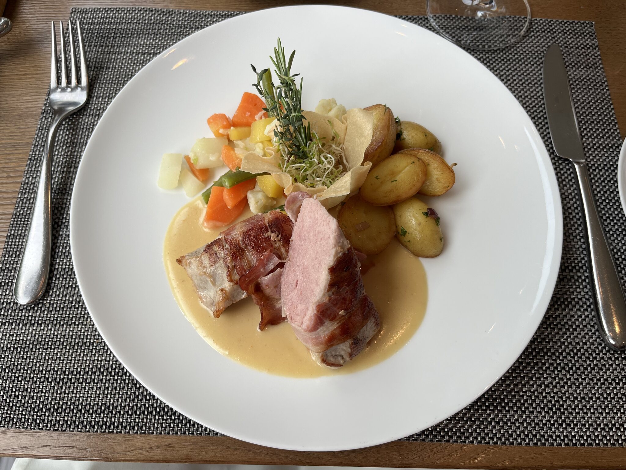Salat und Vorspeisenbüffet solide, Terlaner Weinsuppe mit leicht asiatischem Zitroneneinschlag sehr schön, Tagliatelle mit Pilzen sehr schmackhaft. Dem Schweinefilet und dem Gratin hätte ich etwas mehr Sauce gewünscht. Dessert sehr lecker.