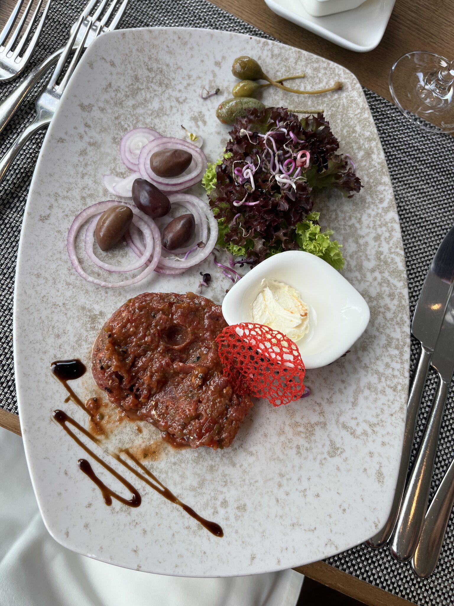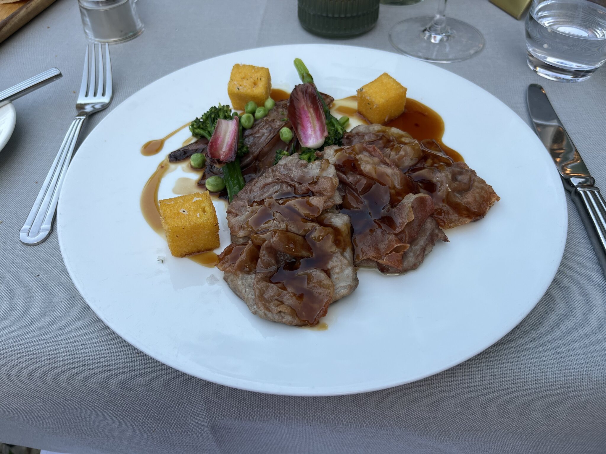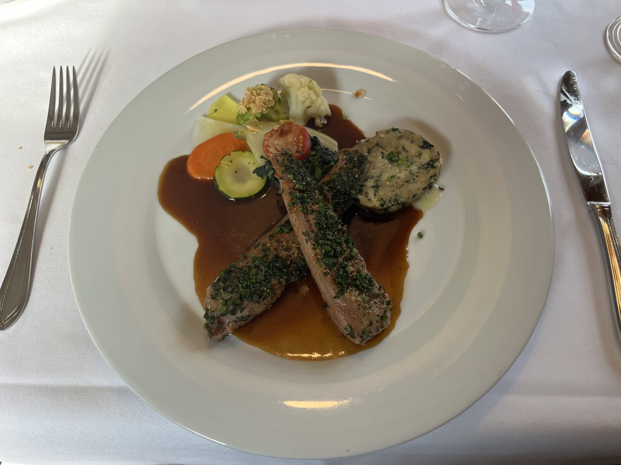 Ok der Rindfleisch-Spieß erinnerte ein wenig an Kebab, aber schmeckte gut und der Pinot Nero von St. Quirinus in Kaltern mundete gut zum Menü