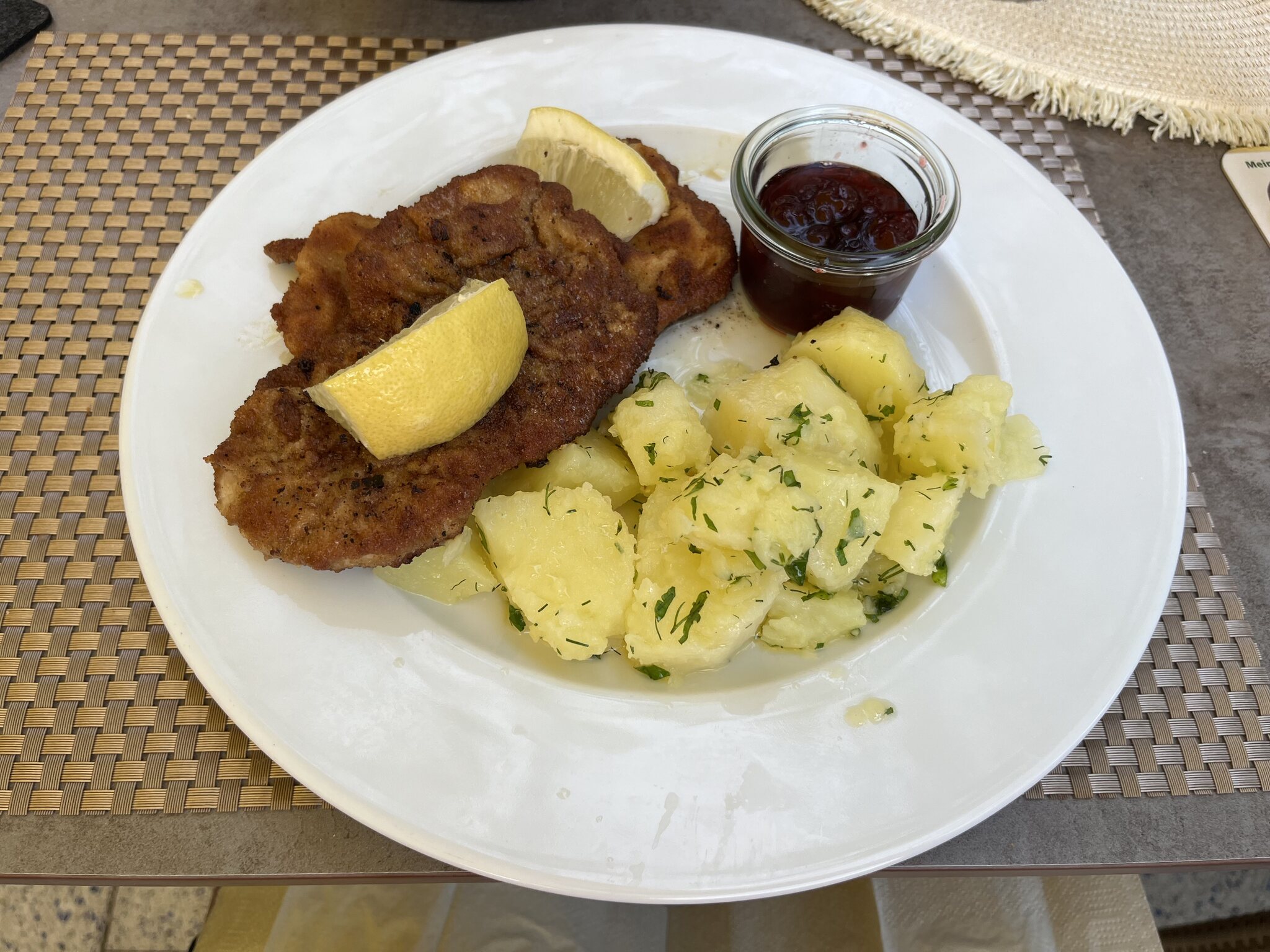Die Salzkartoffeln zum Wiener Schnitzel waren etwas zu stark gekocht. Ist vielleicht dem älteren Klientel hier geschuldet