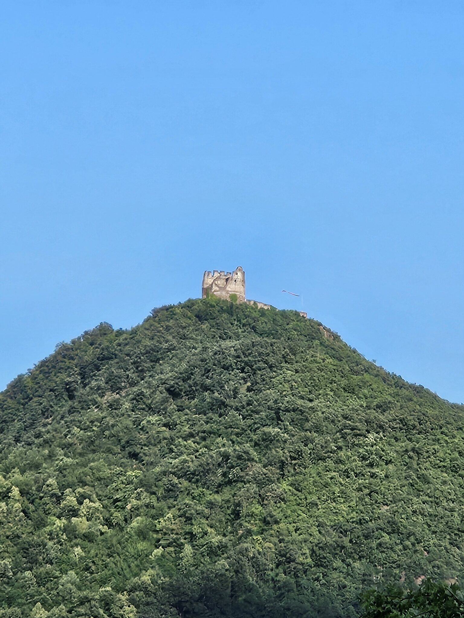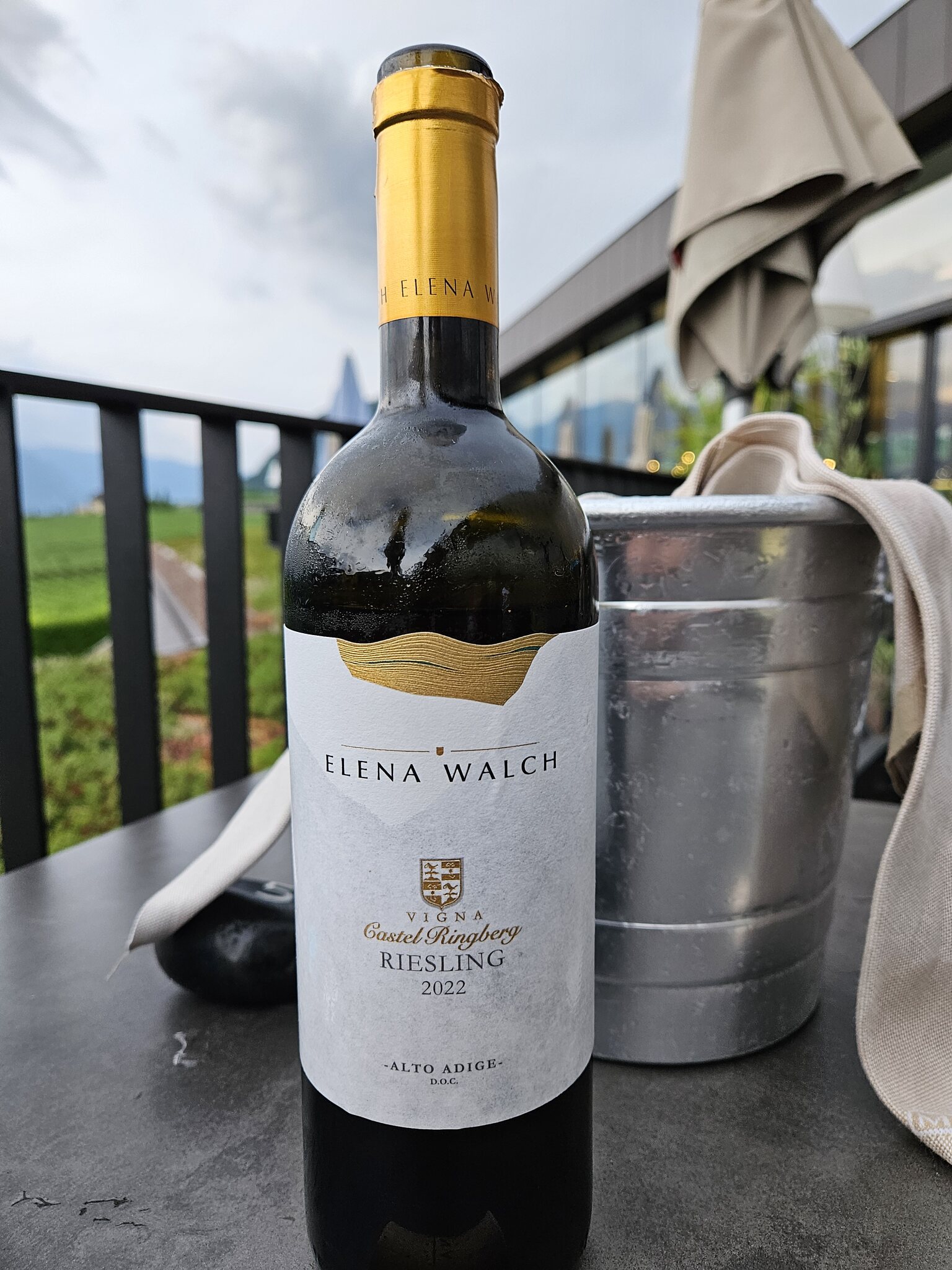 Da die Damen müde sind genieße ich jetzt den Ausblick über See und Etschtal alleine mit dem einzigen Riesling auf der Kaltern-lastigen Weinkarte: