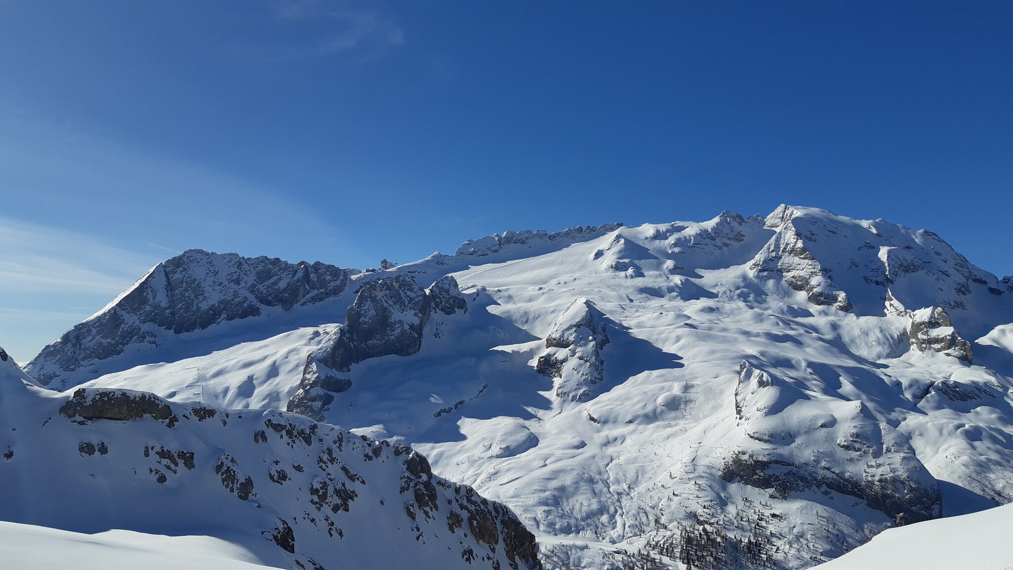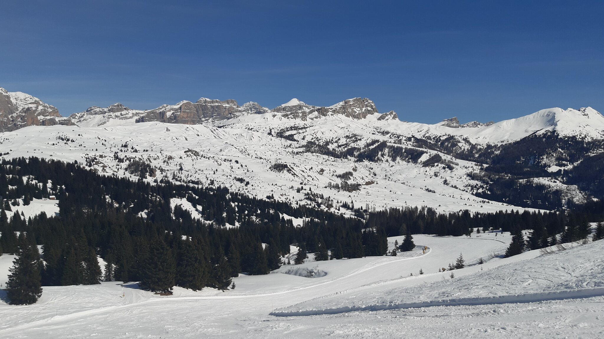 Morgens ging es direkt von meiner Unterkunft in Calfosch an die Marmolada und von dort zurück über die tollen schwarzen Pisten in Arabba über einen Abstecher zum Vallon nach St. Kassian, Gran Risa und Heiligkreuzkofel. Die Routenwahl ging auf. Ich hatte nur ganz selten mal geringe Liftwartezeiten und nur auf den unvermeidbaren Ronda-Abschnitten überfüllte und schlechte Pisten.