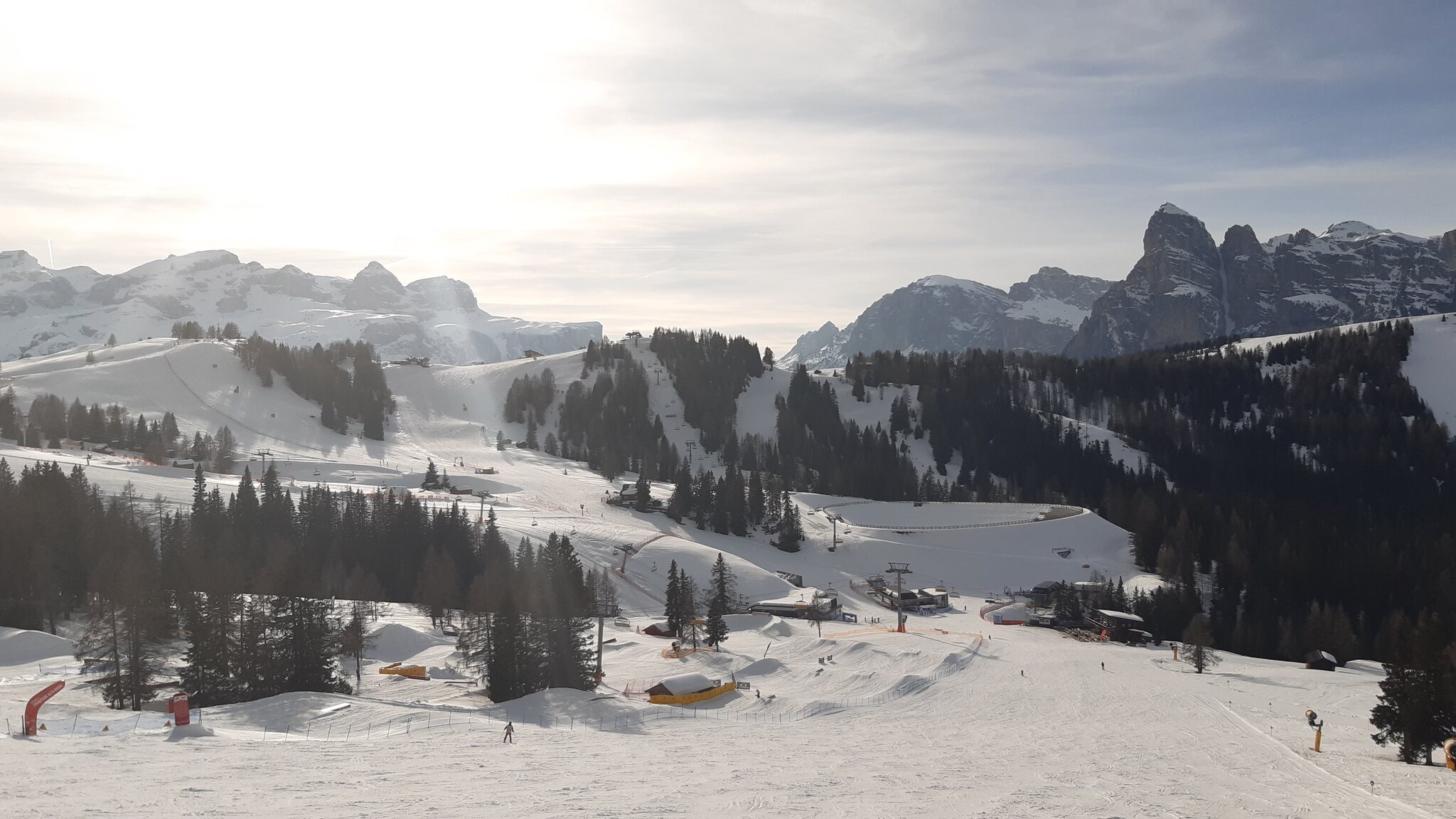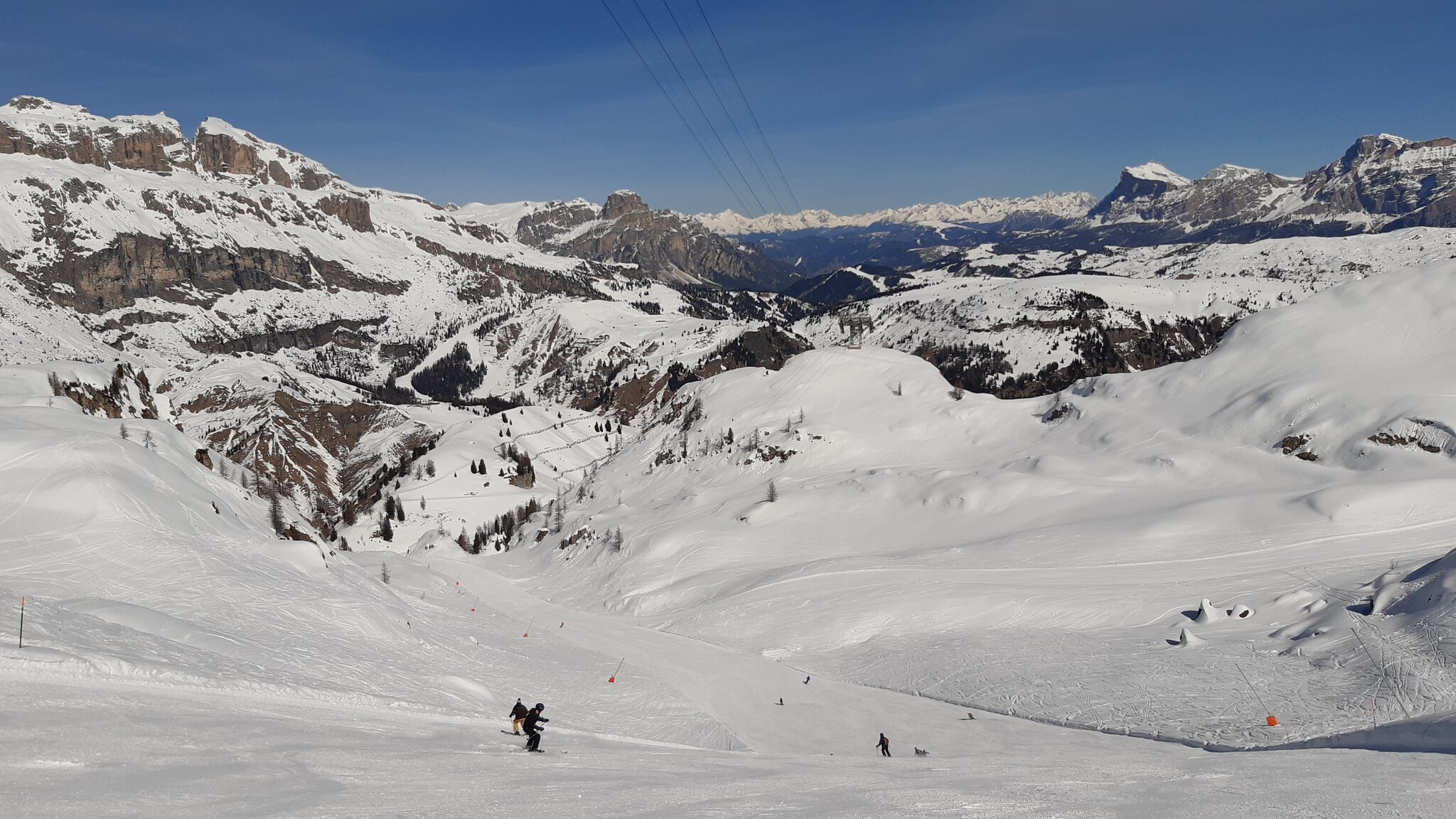 Rückblick zum Arabba-Sektor rund um die Porta Vescovo, dem wahrscheinlich besten und leersten Teilgebiet, das direkt an der Sellaronda liegt
