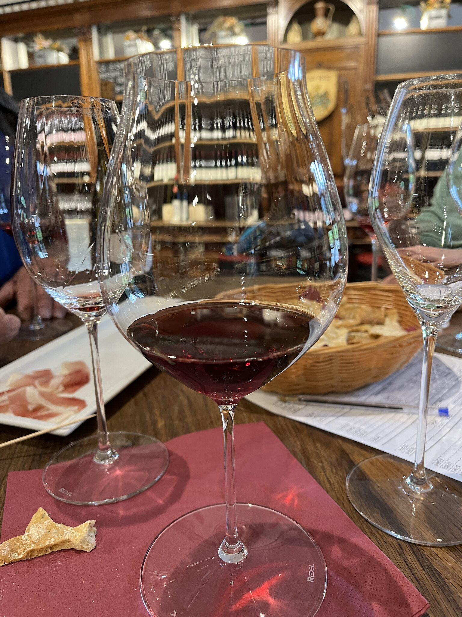 Los ging es mit dem Hauseigenen Sekt (wirklich super), dann einen Sauvignon Blanc (der hatte es ein wenig schwer nach dem Sekt). Vor dem Wechsel zu den Roten wurde noch hausgemachter Speck aufgetischt (mit einer leichten Zimtnote - einfach köstlich). Der erste Rote, ein Vernatsch, hat es gleich auf die Einkaufsliste geschafft.