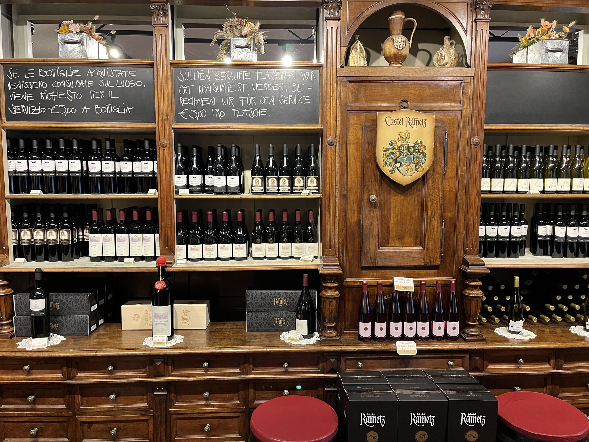 Als Letztes gab es noch einen Merlot - auch gut, aber der muss aufgrund der Einfuhrbeschränkungen in Meran bleiben. Beim Bezahlen gab es dann noch eine nette Story zum und natürlich ein Probierglas vom hauseigenen Kräuterschnaps. Schloss Rametz war Generalimporteur von Jägermeister für Südtirol. Dann haben sie beschlossen, dass sie den besser machen können (kann ich nur bestätigen)…