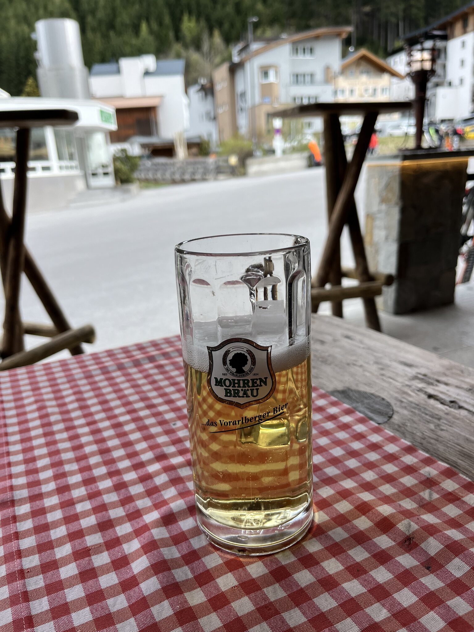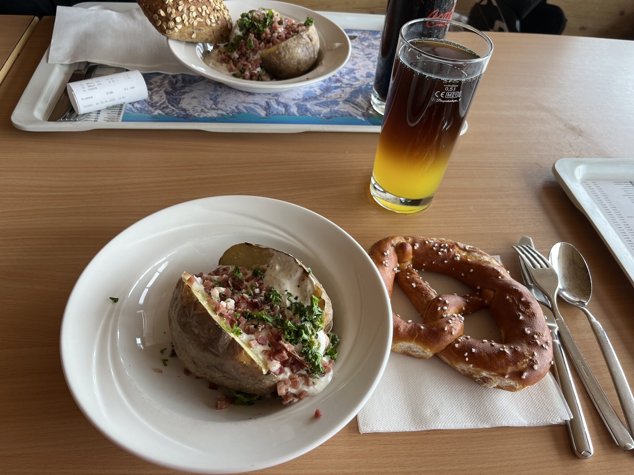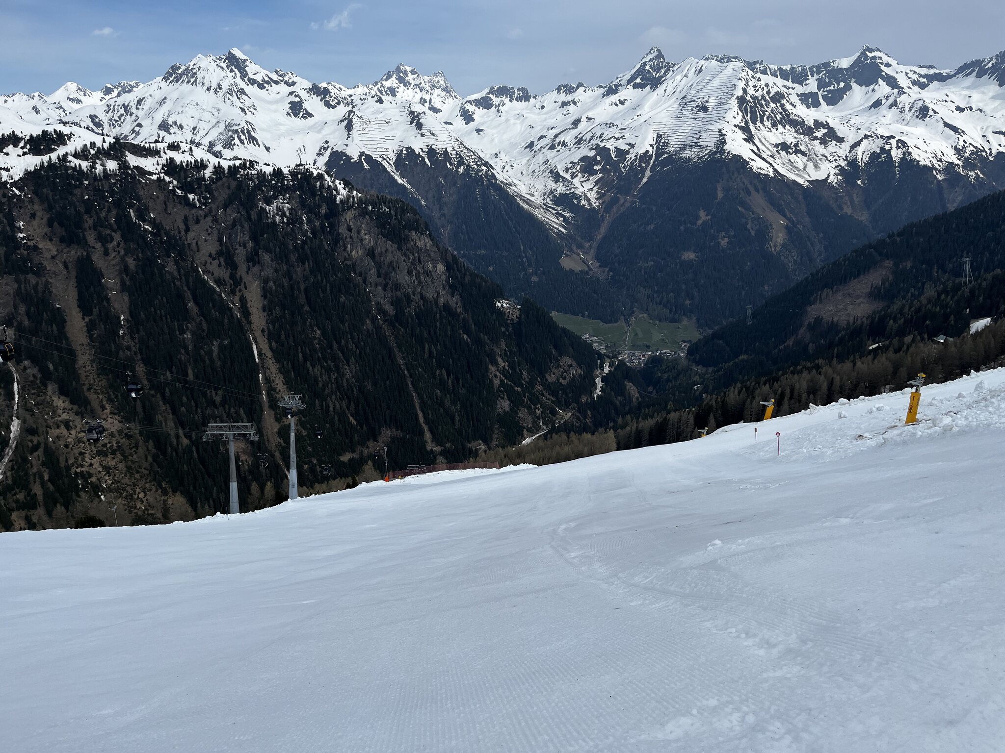 Um 10.15 Uhr steigen wir in die 3S und ich freue mich auf die erste Fahrt. Erster Eindruck: Sosolala. Langsam, wie Ü90, aber einfach mit möglichst wenigen Schlägen. Schwarze Pisten sind daher besser. Geht recht ordentlich. Die Sonne kommt immer wieder. Ich finde den Füllegrad völlig ok. Keinerlei Wartezeiten. Meist ein FBM alleine. Oft auch viel Platz auf den Pisten. Ok, ich brauch auch grad weniger als sonst. Gampen macht Spass! Die Sulzgrenze steigt: Ein Ofenkartoffel im Pardorama darf nicht fehlen! Ischgl kann‘s einfach um diese Jahrszeit. Bis auf einige Pisten Vollbetrieb! Wenn die Sonne scheint, traue ich mich auch mit Speed zu carven. Leider wird es nun (13 Uhr) teilweise etwas klebrig. Der Wind nimmt zu. Greitspitz geschlossen, Viederjoch 2 mit Sturmsesseln. Nachdem Gampen und Palinkopf schliessen mussten, kapituliert nun (14.15 Uhr) auch Zeblas. Aber Lange Wand hält durch und die 14 ist gut! Und die 13 oben richtig pulvrig und gut. Unten Richtung Idalpe dann sehr bremsig. Die Rippe macht sich etwas bemerkbar. Zeit ins Tal zu fahren. Dort gibt es Stau: Und 1x Abschnallen. Morgen wirds mehr als 1x sein. Der Hang selber hat aber noch üppig Schnee. Im Nevada warte ich, bis der Göttibueb auch genug hat. Der Durst war schneller als das Foto: Ich bin sehr zufrieden, hatte ich gestern früh nach einer schlechten Nacht befürchtet, dass ich nach 2-3 Liften die Segel streichen müsste. So wurden es doch 17 in rund 4 1/2 Stunden.